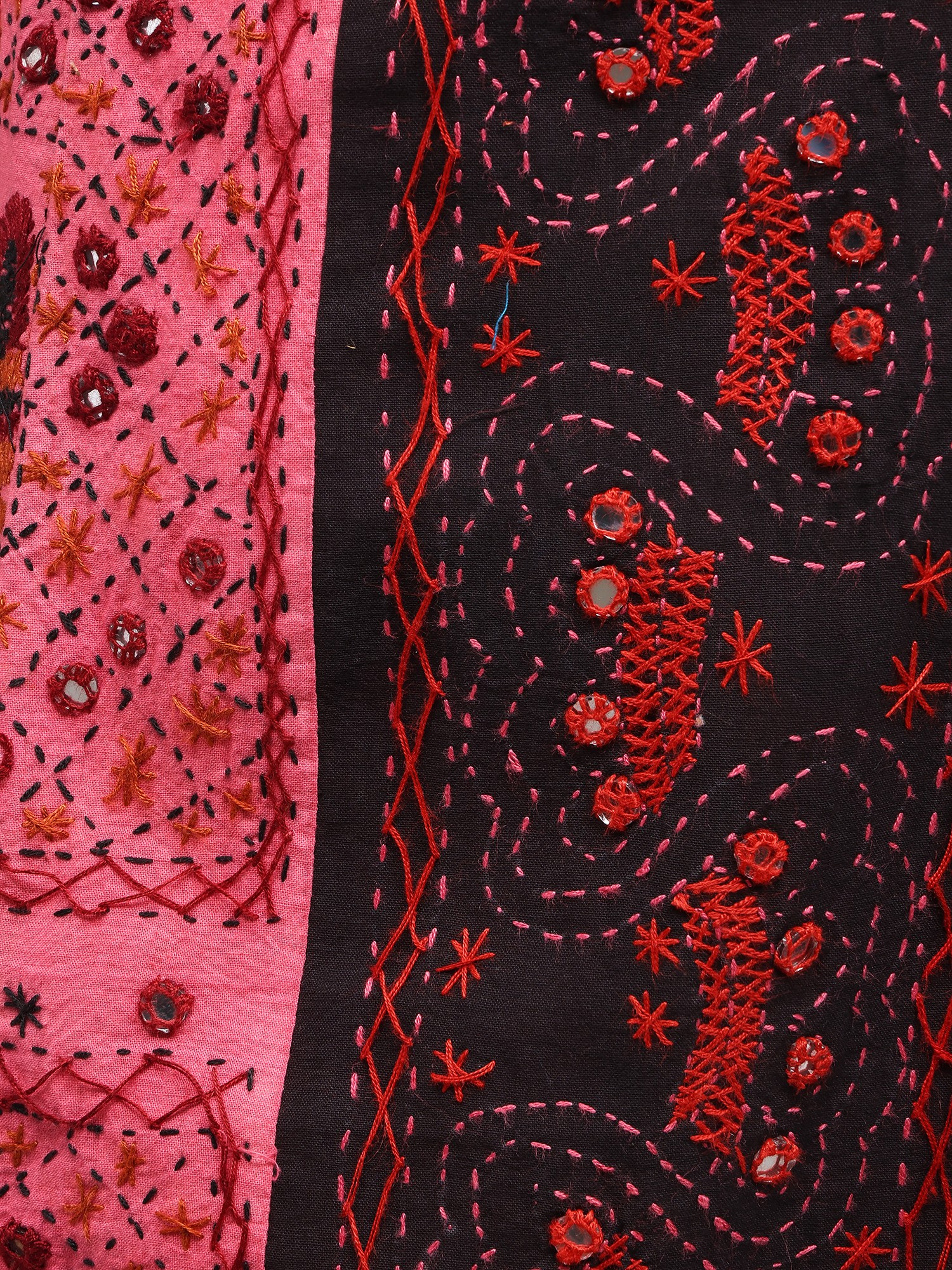 Combines intricate stitching techniques with small, sparkling mirror embellishments.
