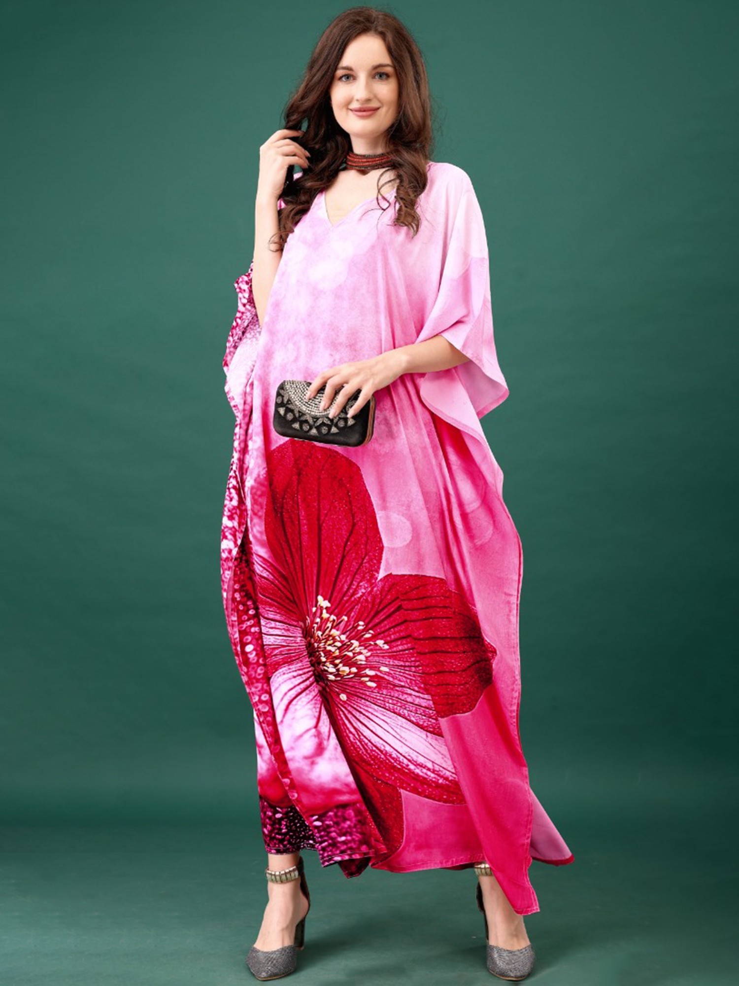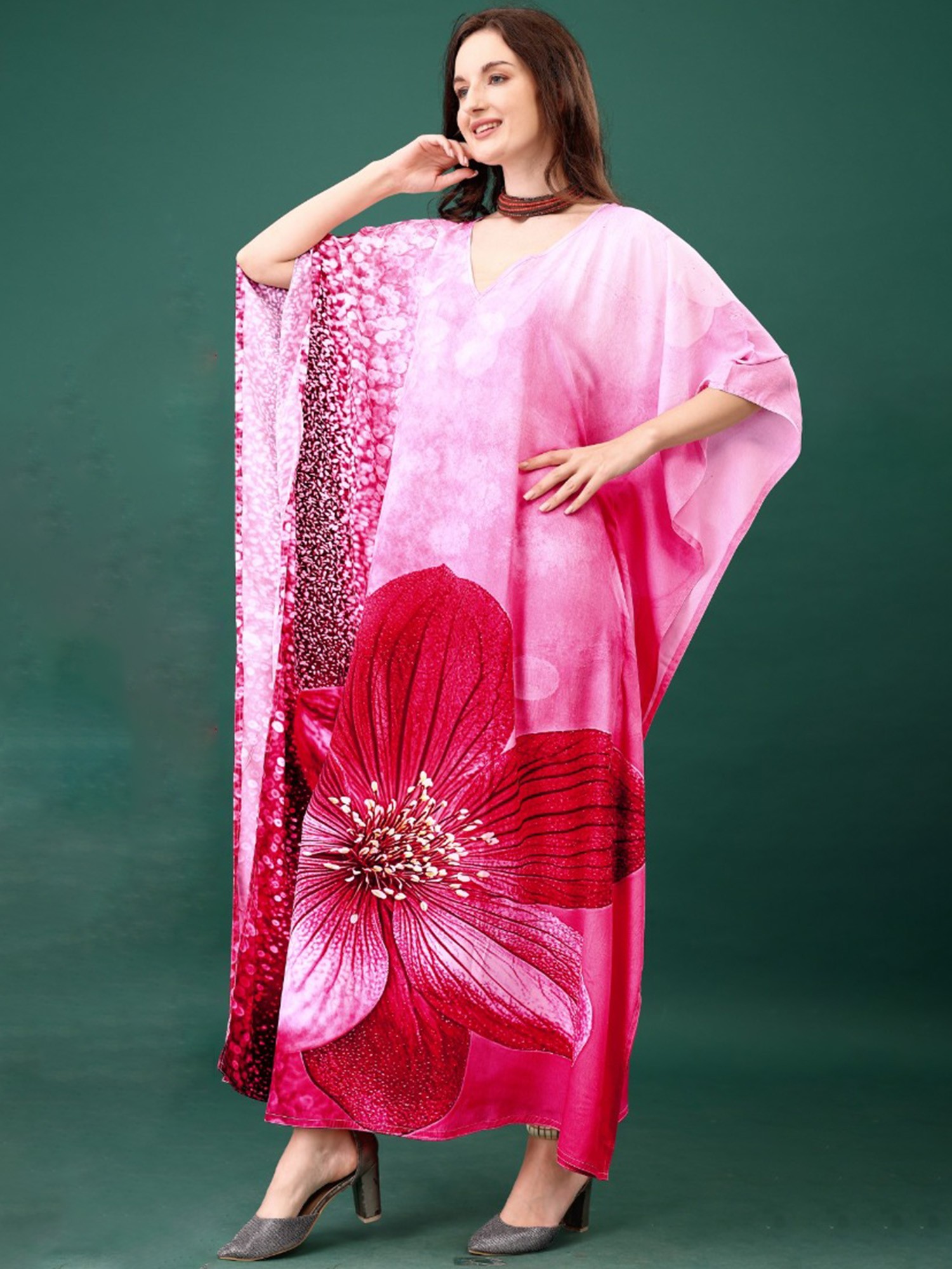 Flamingo-Pink Kashmiri Long Kaftan with Chain Stitch Aari Embroidery