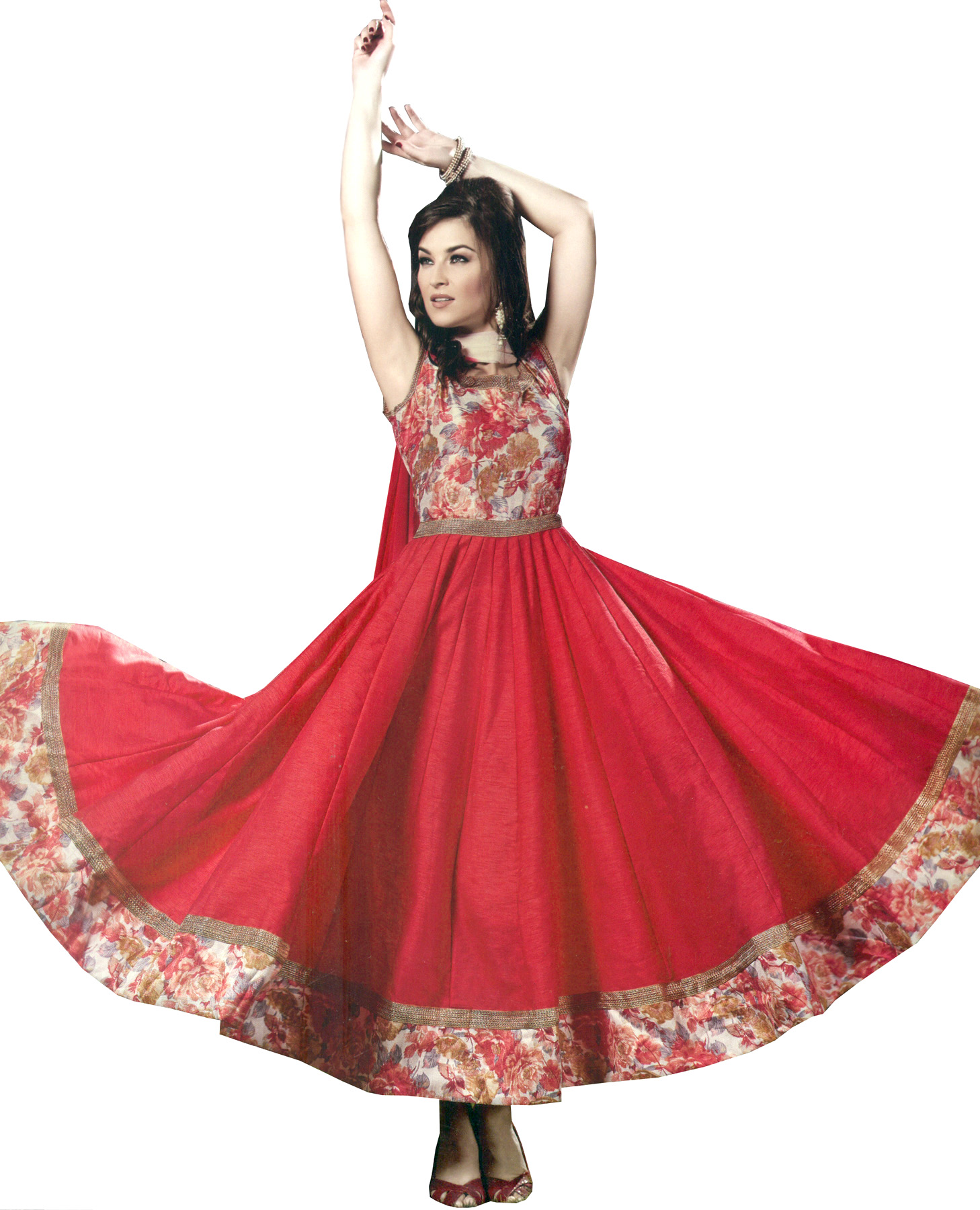 Step into a world of captivating elegance with this stunning Anarkali suit, a masterpiece crafted from luxurious Art Silk. The vibrant geranium-red hue forms a dramatic canvas for the exquisite floral print that adorns the bodice and gracefully cascades down the hem of the flared skirt. This ensemble is designed to make a statement, perfect for celebrations, weddings, or any occasion where you wish to shine.