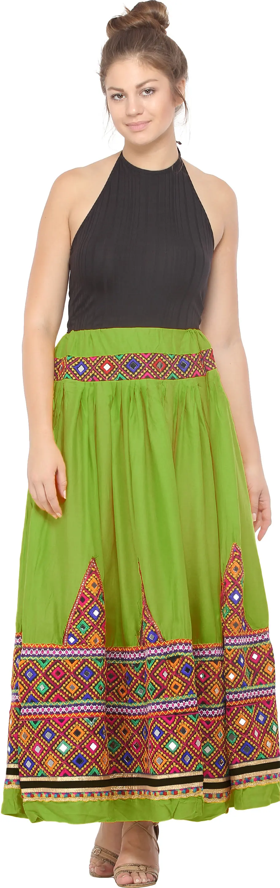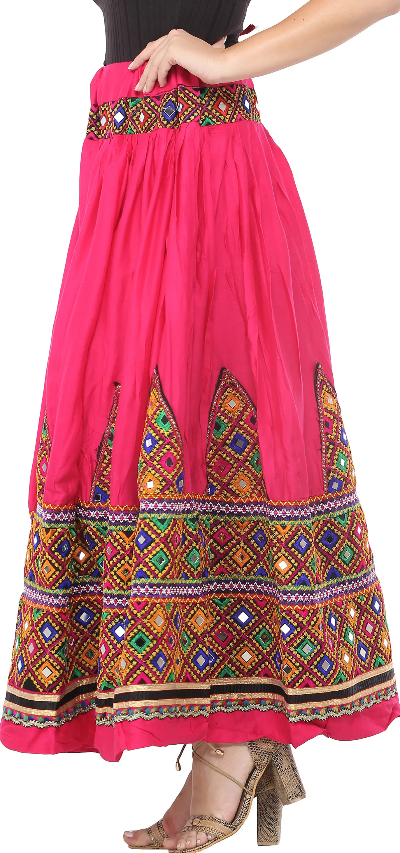 Introducing the colorful beauty of Gujarati culture, this cotton long skirt has everything that will enhance your elegance and ethnic fashion style. It is a typical Kutch ghagra or long skirt woven on bright pastel colored cotton fabric. The weaver has given it a voluminous style, controlled beautifully by multiple pleats starting slightly below the belt and continues till the end. It is designed with multicolored thread embroidery at the waist and at the bottom forming thick rectangular strips and a temple design above it. This embroidery is channelled in beautiful diamond shaped patterns having mirrors studded in-between. The first glance to this skirt takes us through the Gujarati fashion art and the expert weavers weaving such masterpieces.