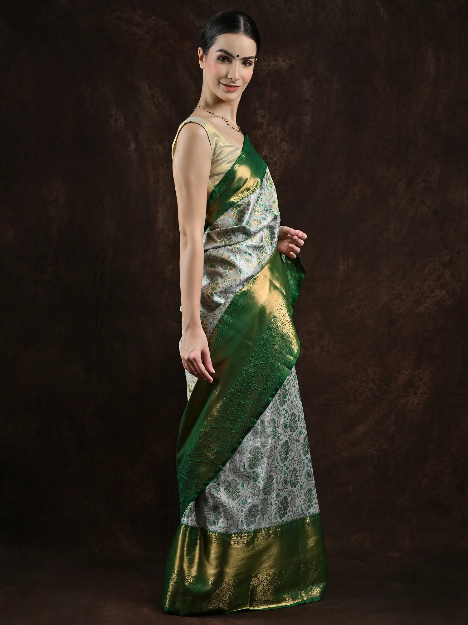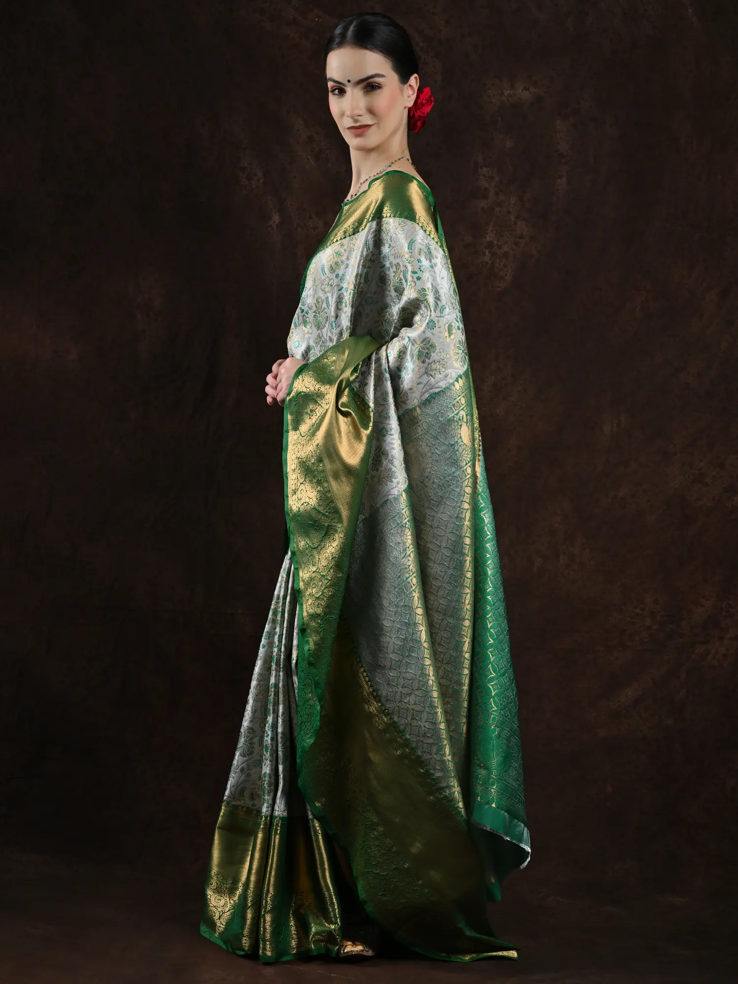 The body of the saree is exquisitely covered in woven floral vine patterns all over, complemented by the broad green border that adds luxury to the lush flora.