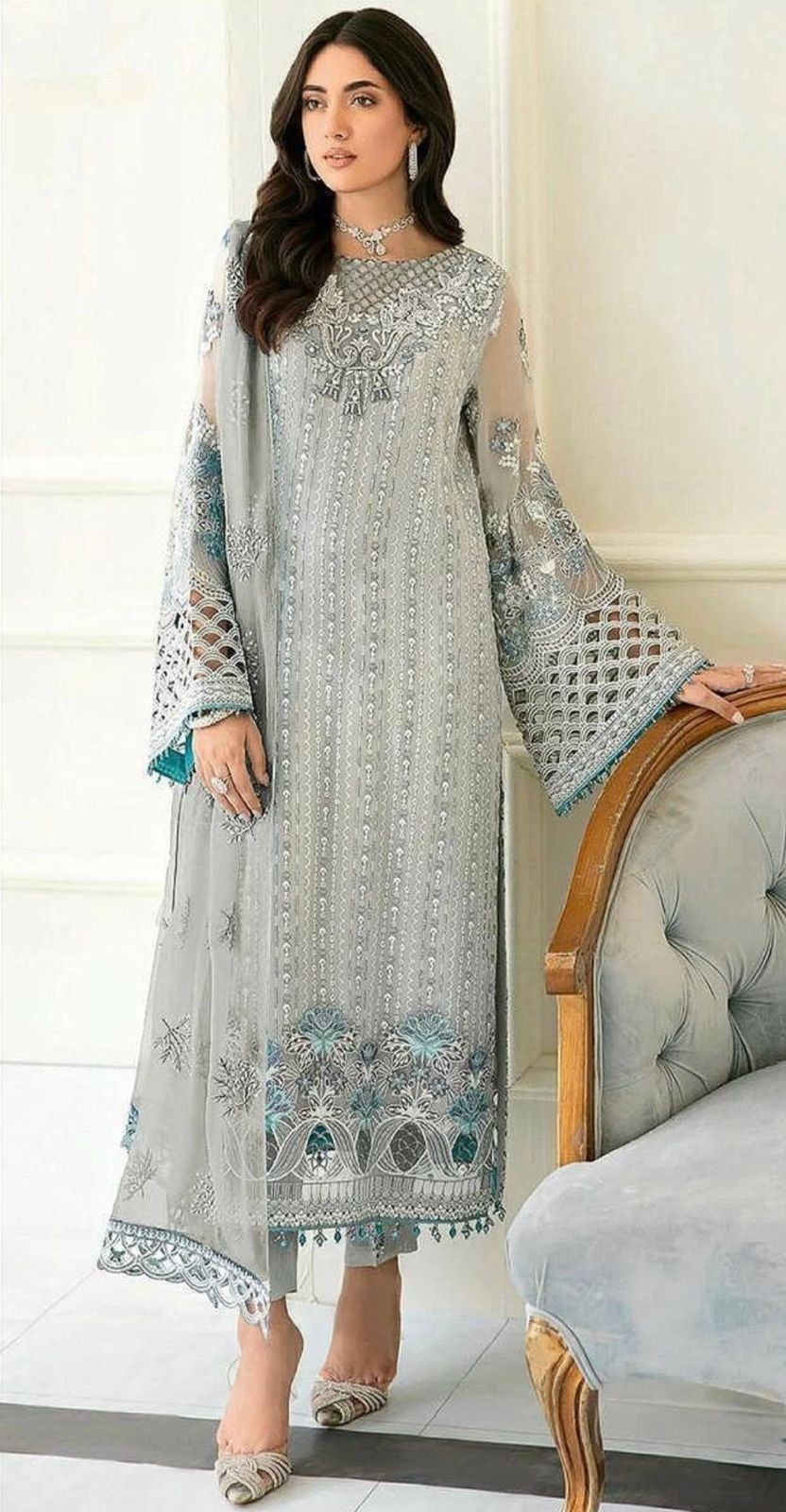 Beige and Green Trouser Salwar Kameez Suit with Embroidered Flowers and Crystals