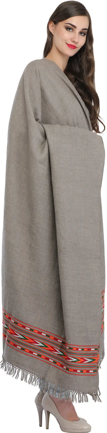 Woodland-Gray Kullu Palla Shawl with Kinnauri Woven Triple Border (Unisex)