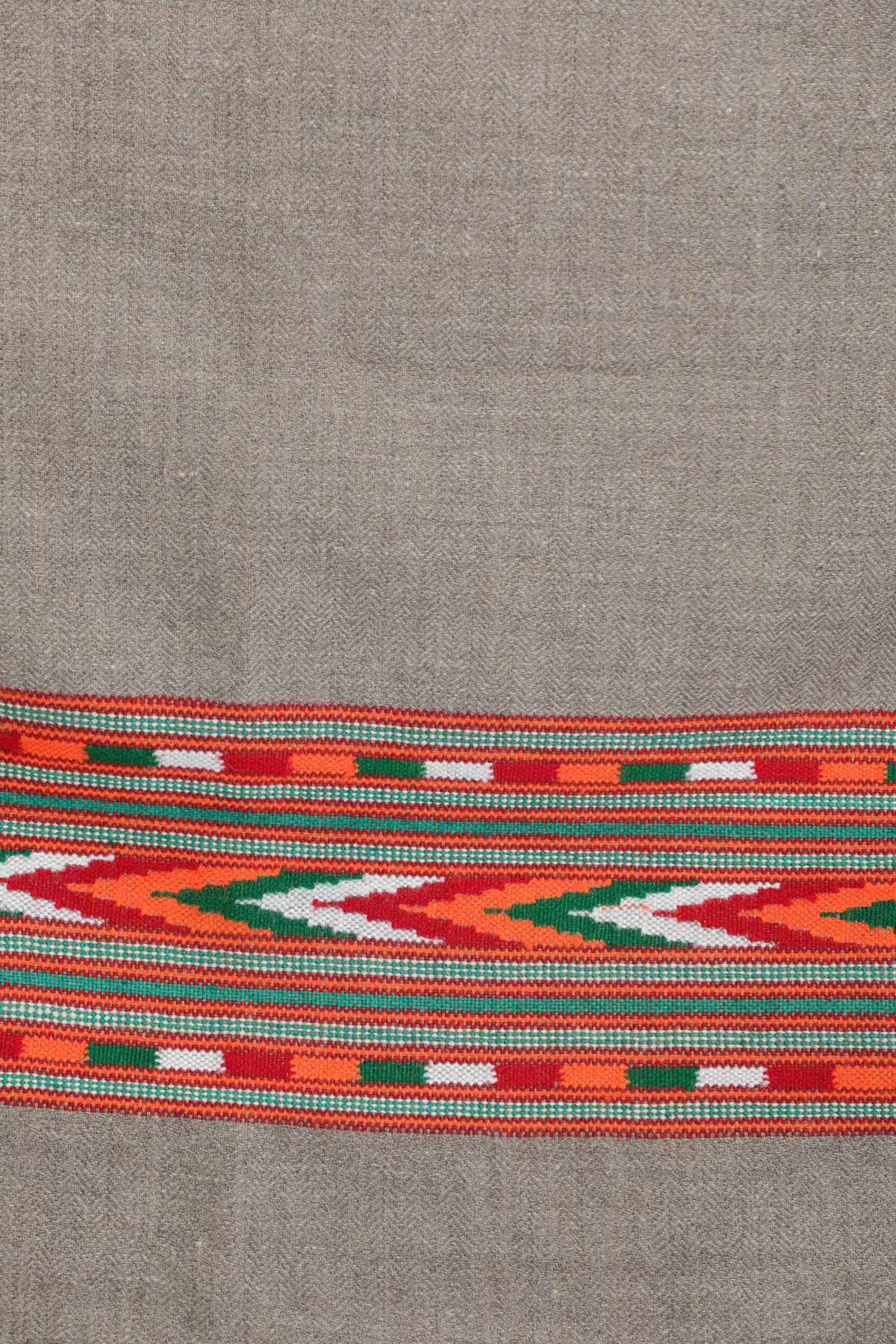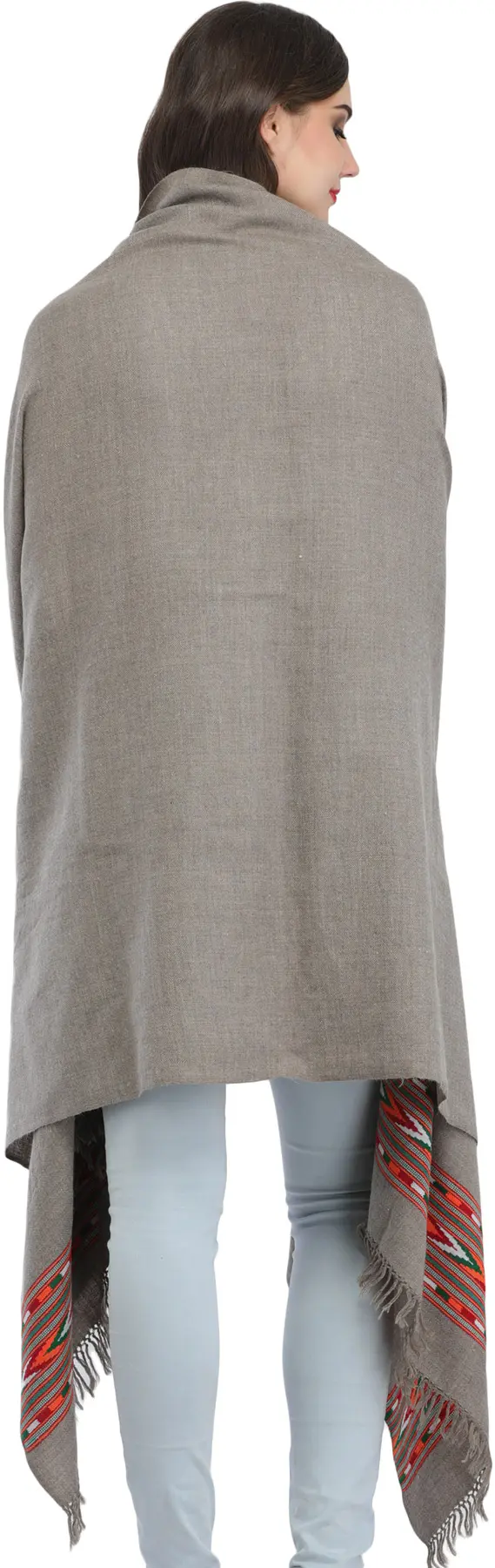 What truly sets this shawl apart is its captivating Kinnauri woven border. This intricate detail, a hallmark of the Kinnauri weaving tradition, is a vibrant display of geometric patterns and symbolic motifs. The rich interplay of colors – warm oranges, fresh greens, and crisp whites – is meticulously woven into the fabric, creating a striking contrast against the subtle gray. Each thread tells a story, whispering tales of the Himalayas and the skilled hands that brought this masterpiece to life. This artisanal border transforms the shawl from a mere accessory into a wearable work of art, adding a touch of ethnic charm and cultural depth to your wardrobe.