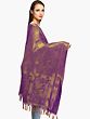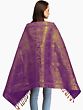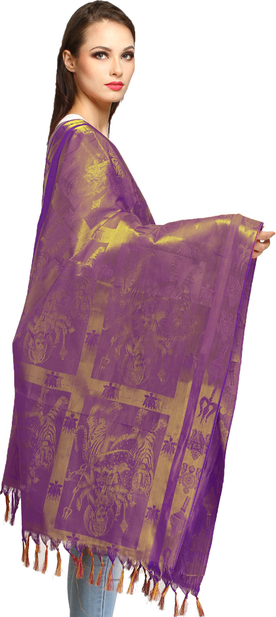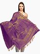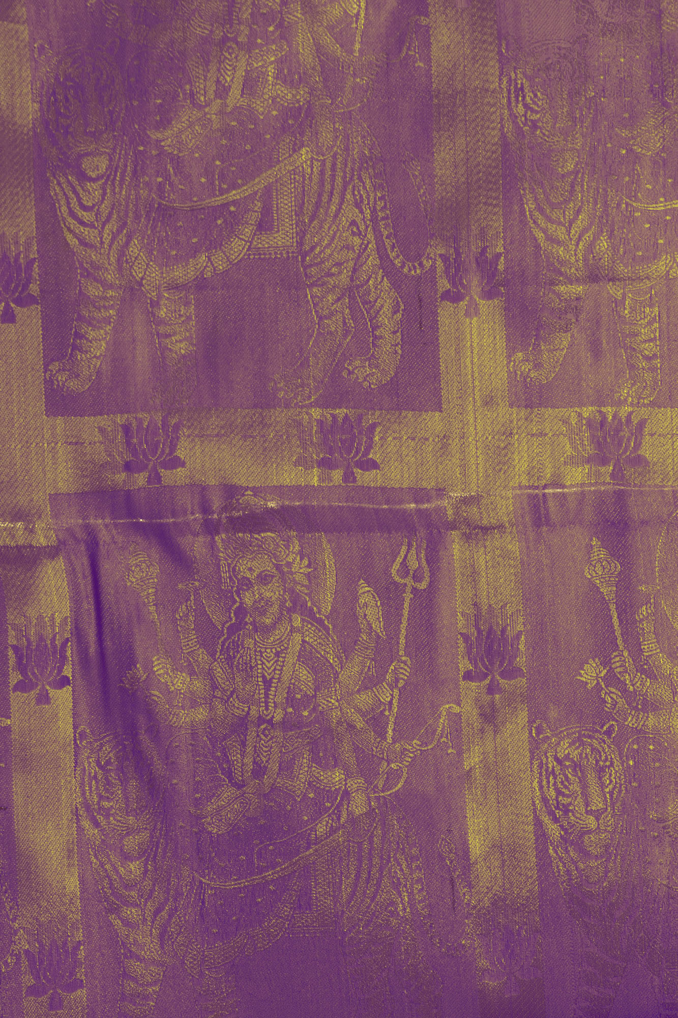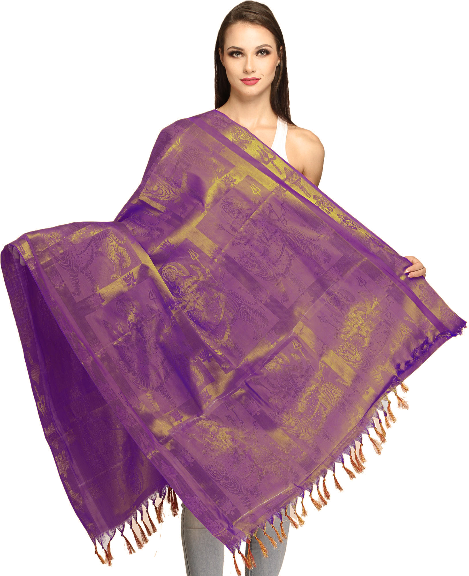 The intricate brocade work adorning this shawl features the powerful imagery of Goddess Durga, the fierce protector and vanquisher of evil. Each panel depicts the divine mother in her various forms, surrounded by auspicious motifs and symbols of her strength and grace. From her potent weapons to her serene yet unyielding gaze, these woven representations evoke a sense of divine protection and spiritual empowerment. The recurring symbols, such as the trident and the lotus, further enhance the devotional aspect, making this shawl a sacred artifact for prayer, meditation, and personal reflection. The rich, deep purple hue of the art silk provides a regal backdrop, allowing the golden brocade to shimmer with an ethereal glow, reminiscent of divine light.