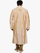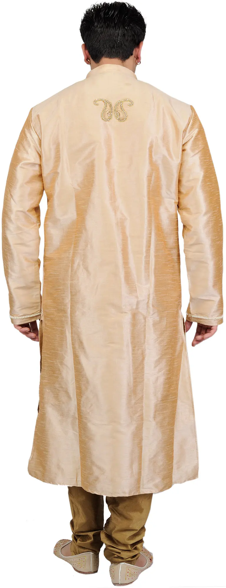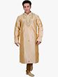 Step into the spotlight with our Golden-Beige Wedding Kurta Pyjama featuring Faux Pearl Haar Embroidery on the Neck. The faux pearl embroidery adds a regal touch, making this ensemble a symbol of grandeur. Embrace a look that fuses tradition with modernity, creating a style statement that stands the test of time.