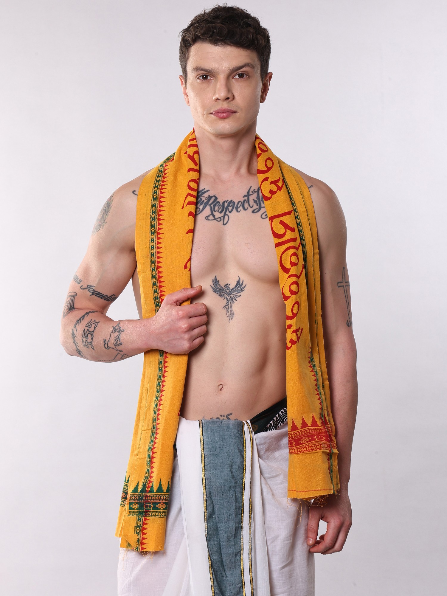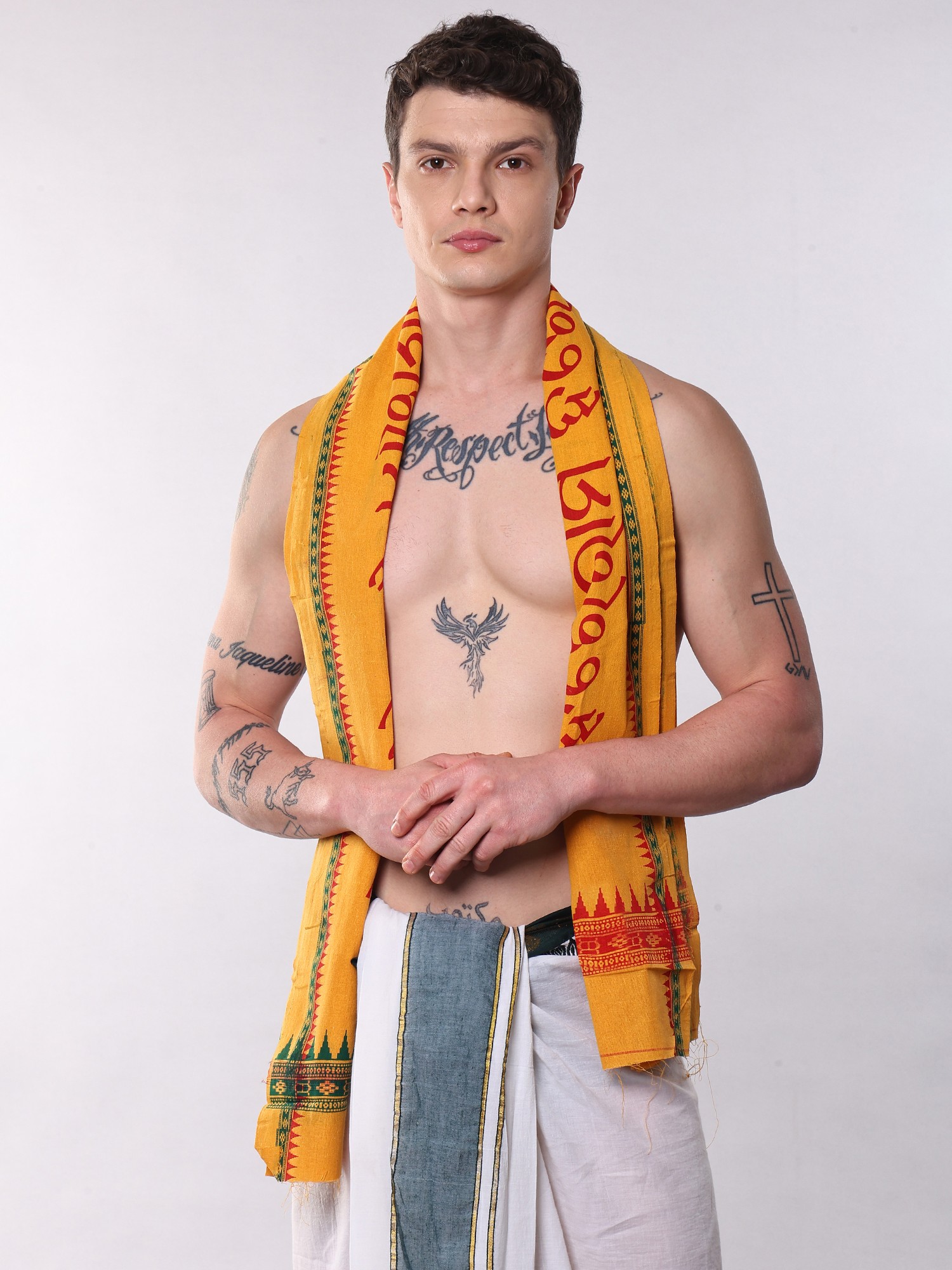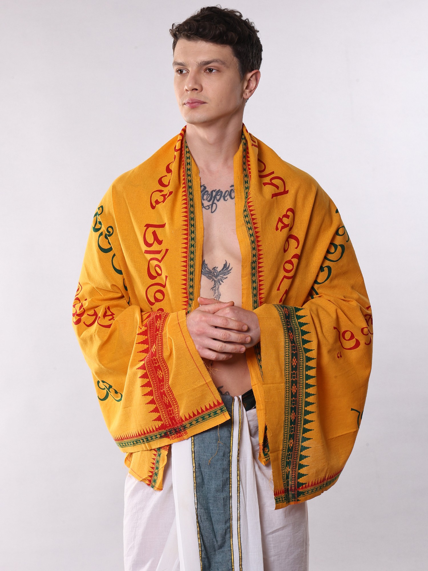 This piece is meticulously fashioned from the finest cotton, chosen for its natural breathability and soft touch against the skin. Each thread is imbued with intention, reflecting a commitment to artisanal quality. The intricate printing of the Hare Krishna Hare Rama Maha Mantra and the temple-inspired border speaks to the careful craftsmanship dedicated to its creation.