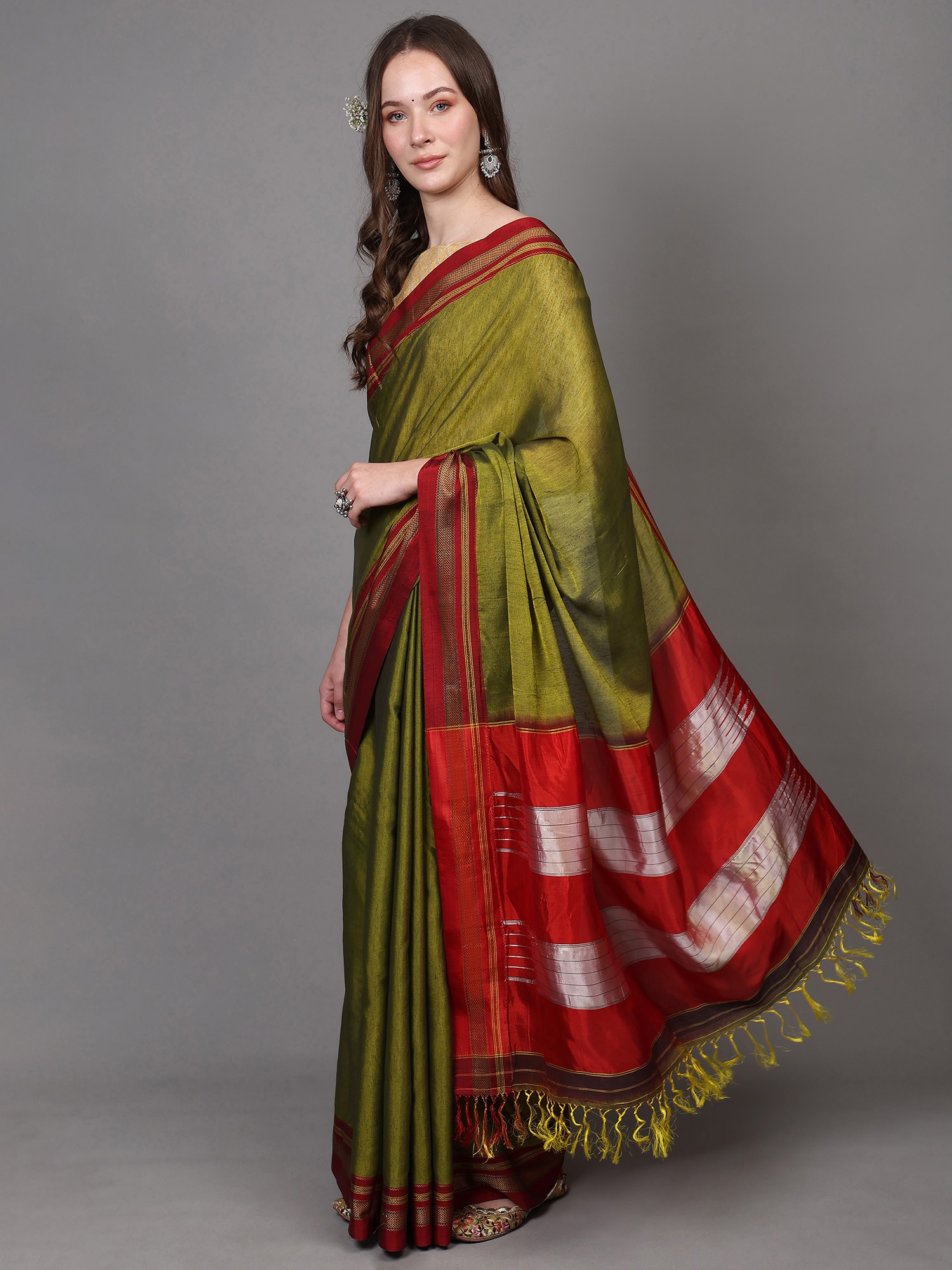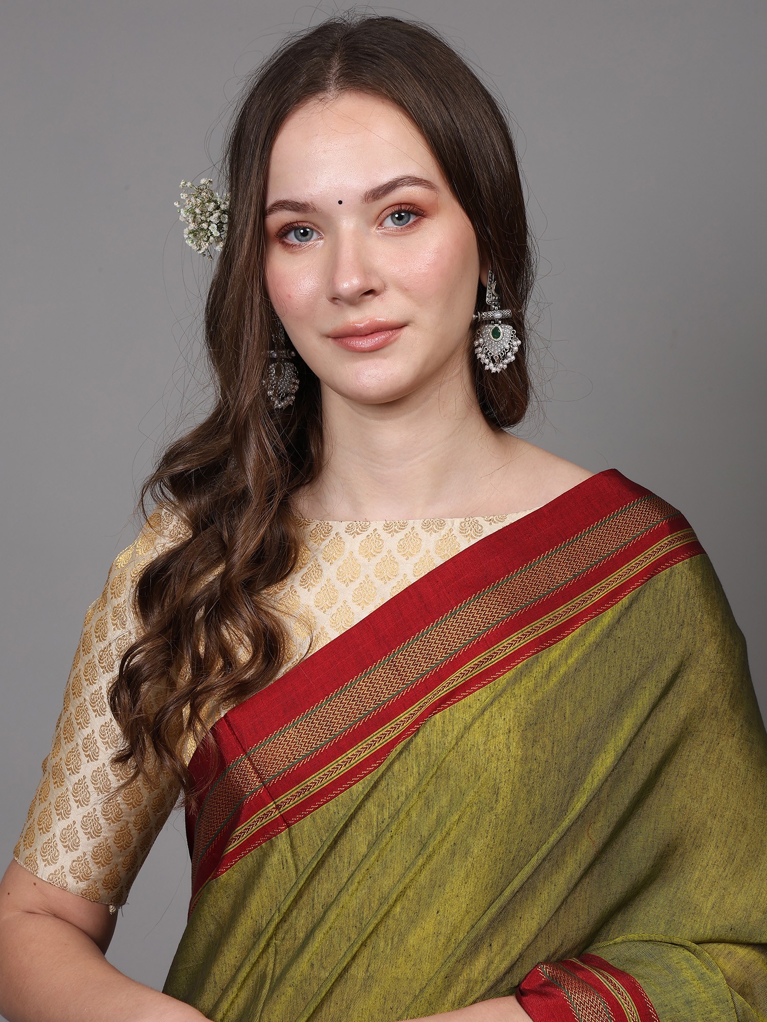Cotton Saree from Tamil Nadu with Printed Floral Paisley Butta and Zari Border