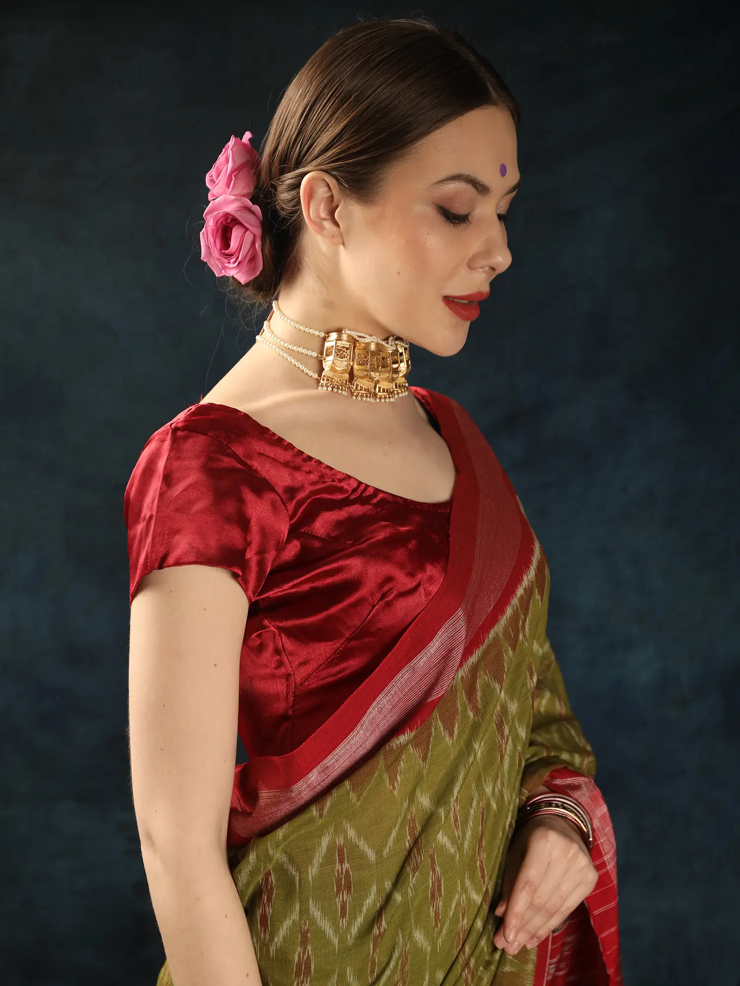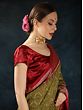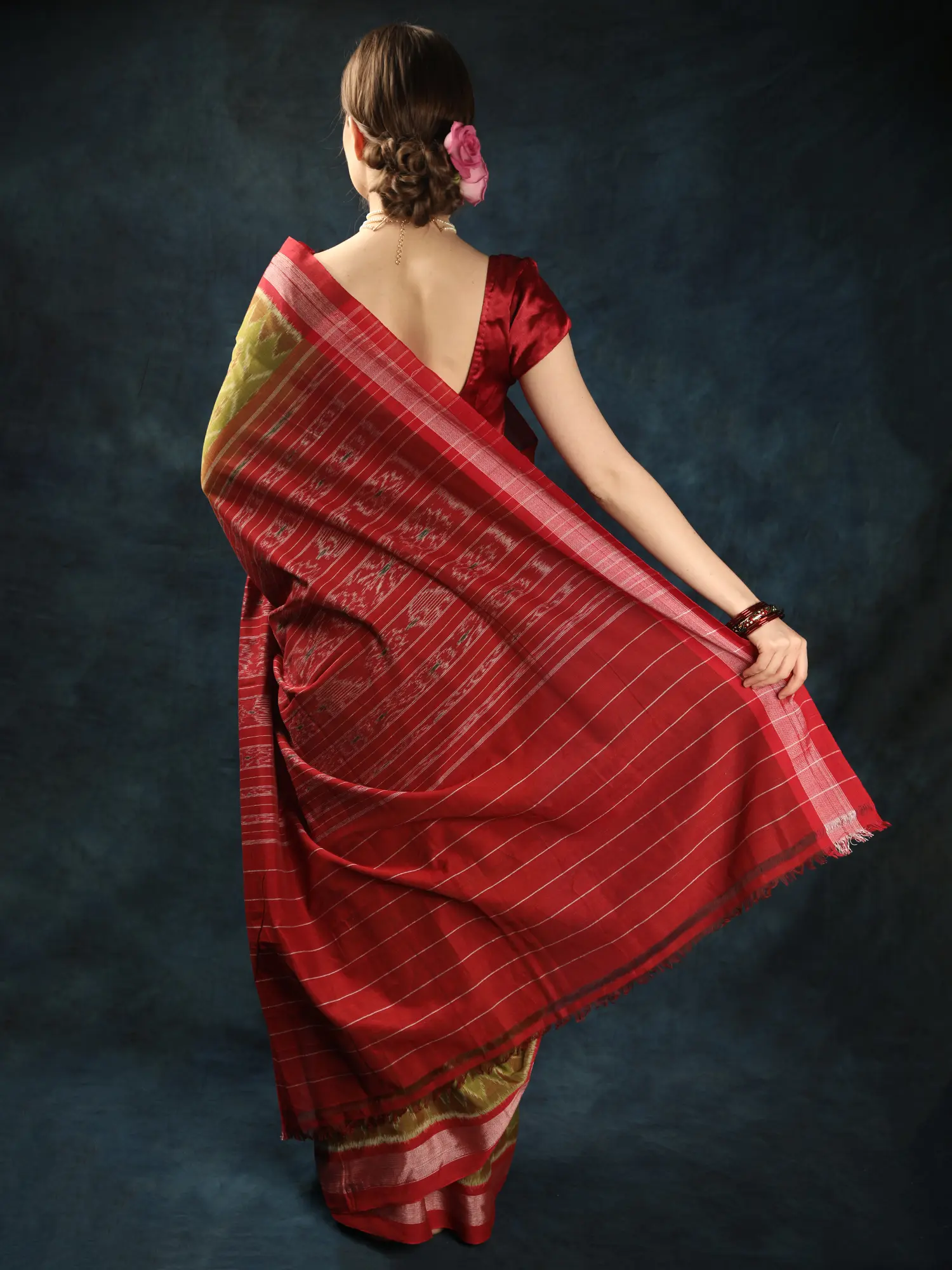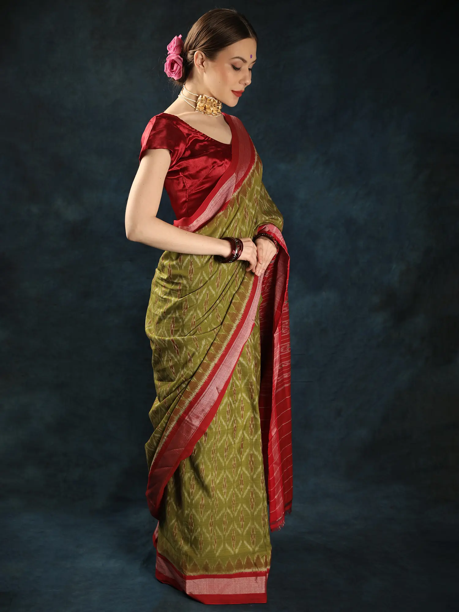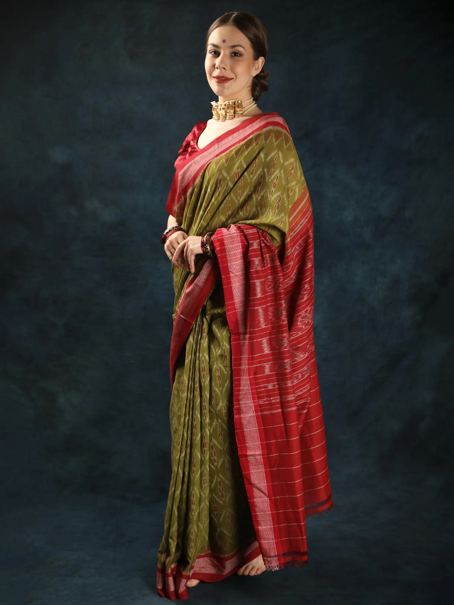 With this traditional Saree, step into the ethereal realm where tradition meets timeless sophistication. Delicately made with wonderful Ikat weaving all-over, each thread reveals a narrative of handcrafted expertise. Adorned with woven bootis and elaborate zari weaving, this saree from Sambalpur radiates luxury in every drape. The magnificent Golden-Cypress shade represents wealth and vigour, while the cotton fabric assures comfort with grace. Perfect for festive occasions or graceful gatherings, it seamlessly blends tradition with modern charm. Cherish the charm of legacy and embrace every moment wrapped in its majesty.