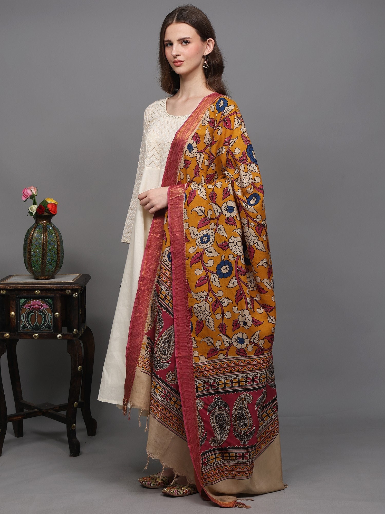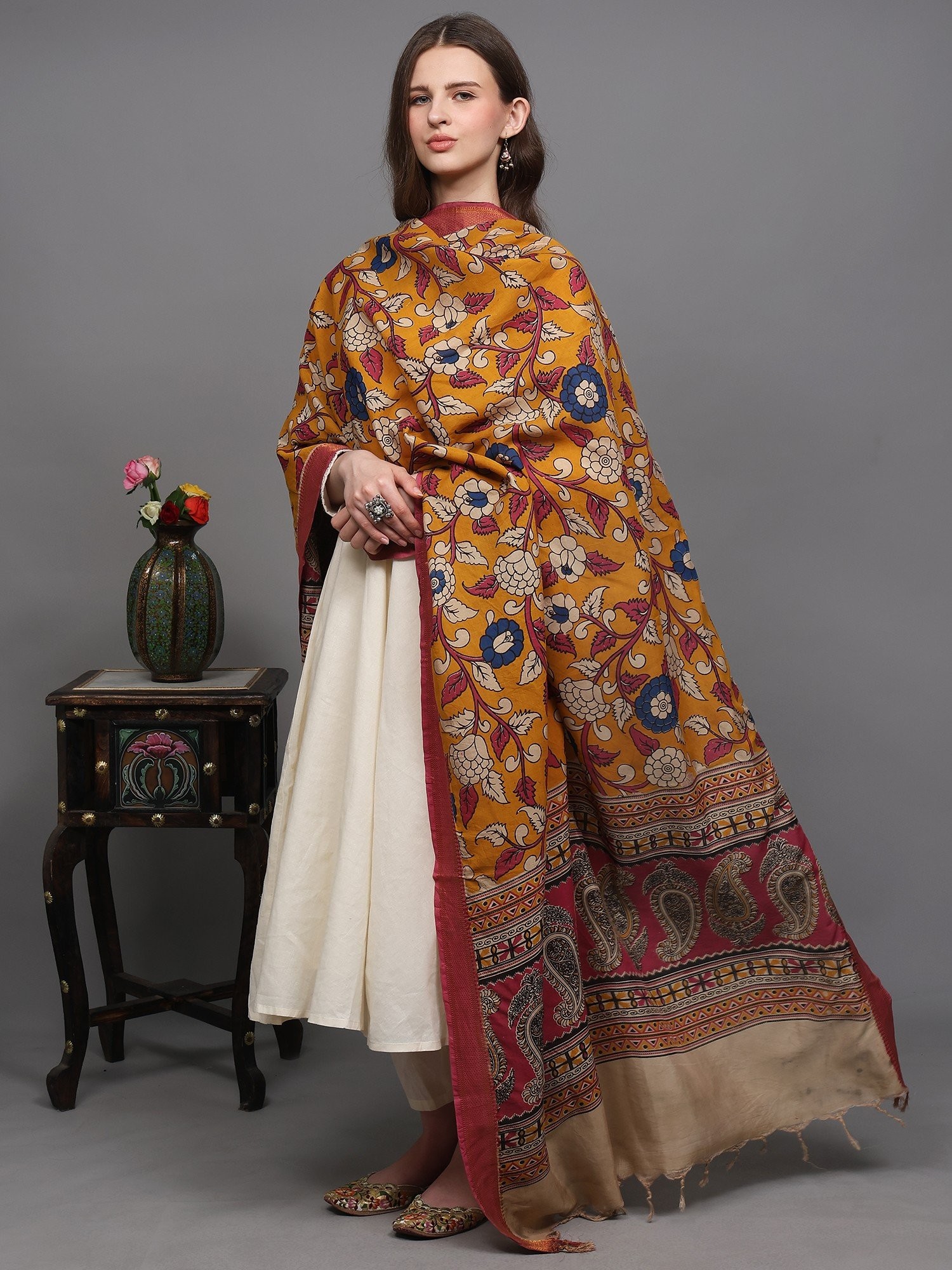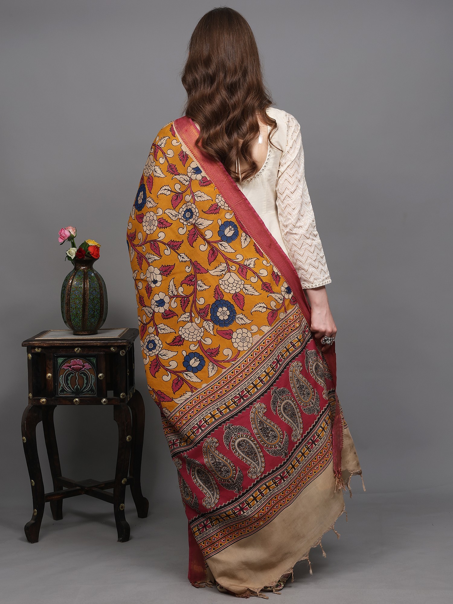 Kalamkari Dupatta from Telangana with Floral Vine Print and Zari work Border