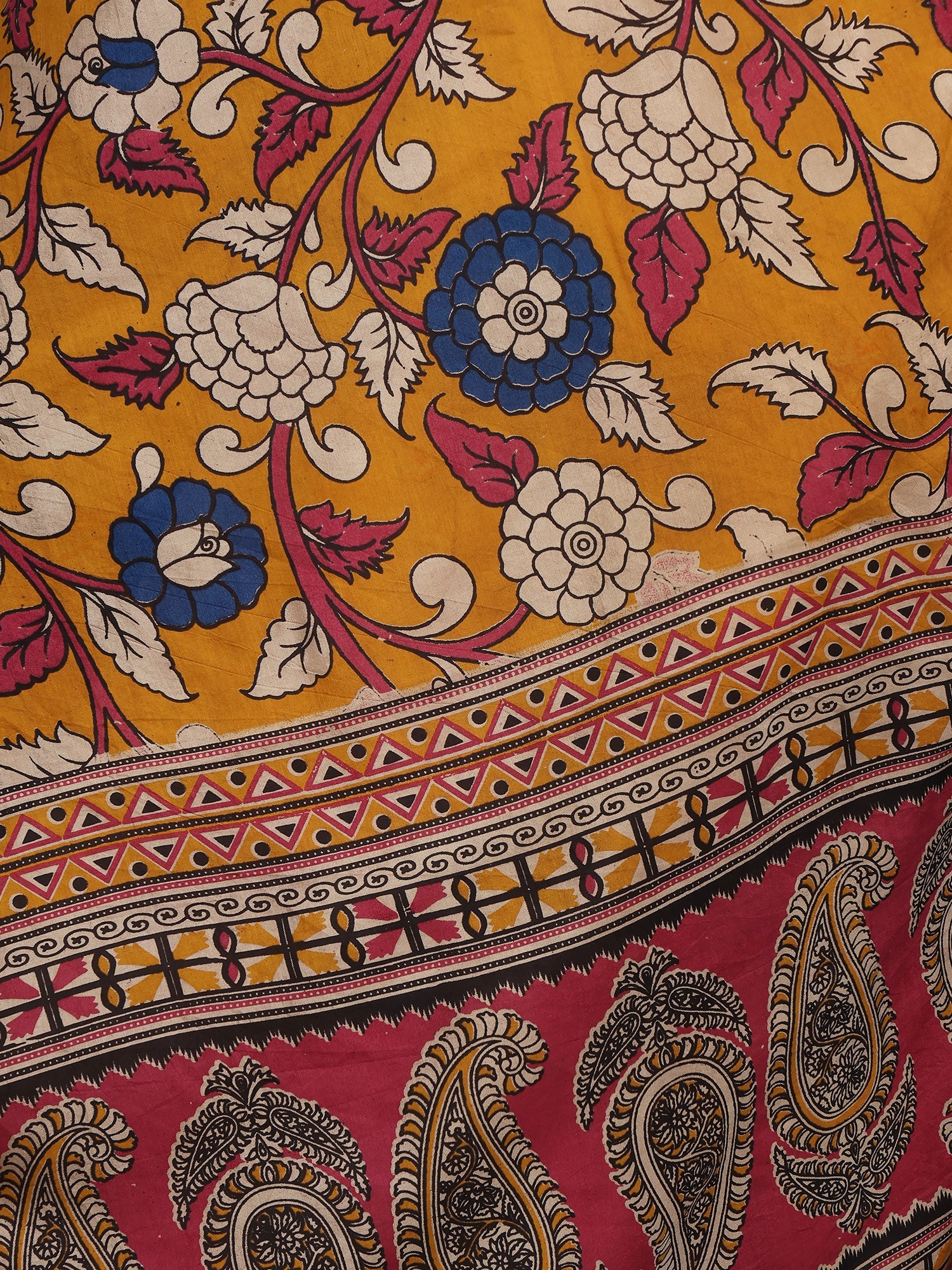 Multicolor Kalamkari Sari from Seemandhra with Painted Flowers and Woven Border