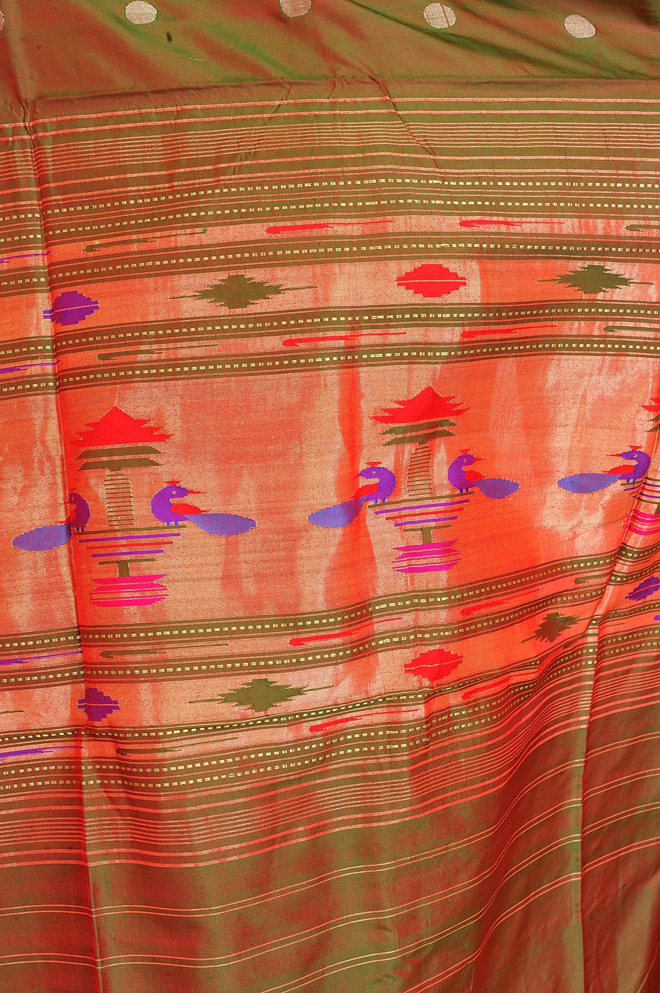 Iridescent (Dhoop Chaanv Shade) Fancy Brocade Pallu Mor Butti Paithani Saree from Maharashtra with Bold Pair of Peacock on Pallu