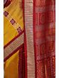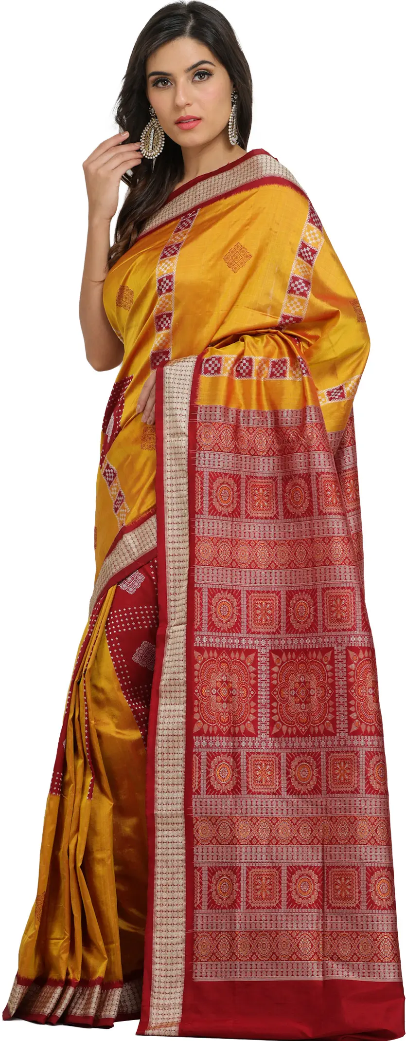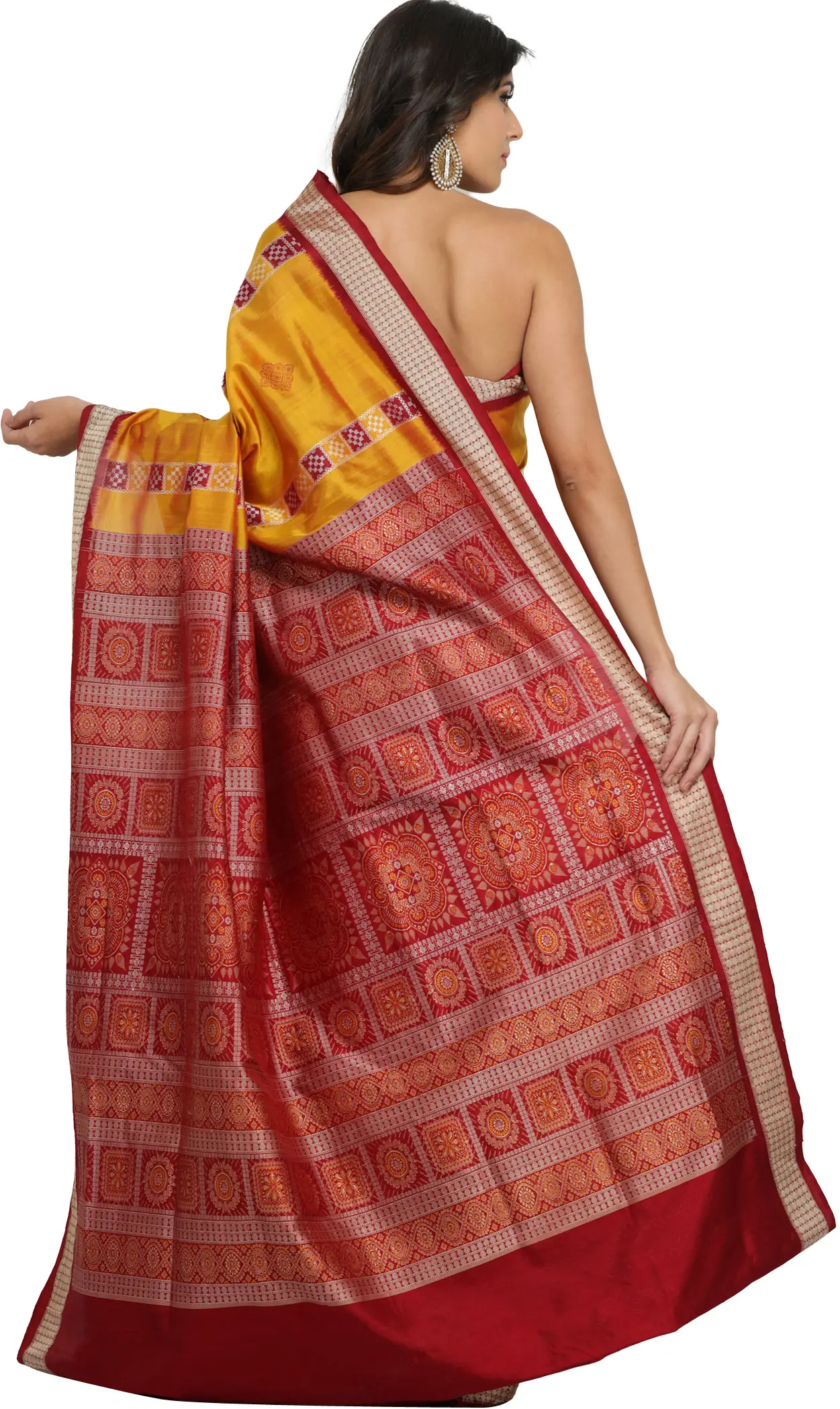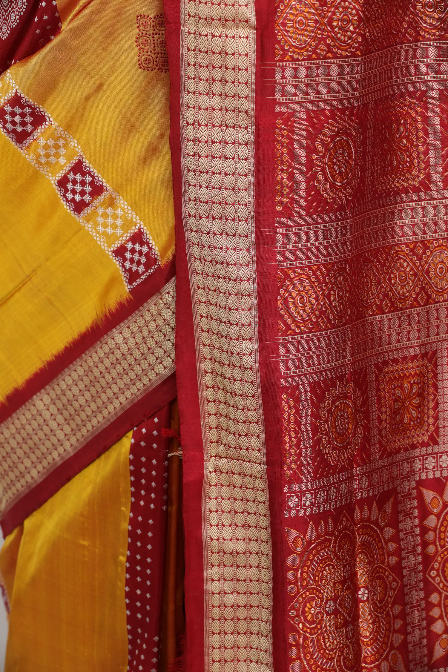 Complementing the radiant golden base are striking maroon borders and a captivating pallu. The maroon hue offers a bold and luxurious contrast, adding depth and drama to the sari's overall aesthetic. The borders are designed with a delicate interplay of geometric patterns and woven elements, framing the golden fabric with a touch of regal sophistication. The true showstopper, however, is the box pallu. This generously sized end piece is a canvas for elaborate woven designs, featuring ornate motifs and intricate patterns that are characteristic of the Bomkai weaving tradition. The rich maroon silk, combined with the detailed weaving, creates a dramatic and memorable impact, ensuring that every drape of this pallu is a statement of unparalleled grace. The interplay between the golden-nugget and maroon creates a harmonious balance, making this sari a versatile choice for a variety of occasions. ––––––––––––––––––––