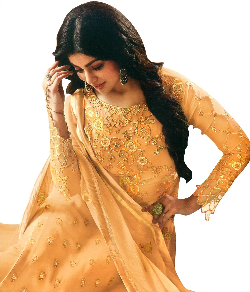 Step into a world of refined beauty with this stunning trouser salwar kameez suit, a masterpiece designed to capture the essence of sophisticated Indian fashion. The rich, golden-nugget hue of the georgette fabric provides a luxurious foundation, imbuing the ensemble with an opulent glow. This captivating color evokes warmth, celebration, and a touch of regal charm, making it an ideal choice for special occasions and festive gatherings. The delicate georgette drapes beautifully, offering both comfort and an ethereal flow that complements the intricate embellishments.