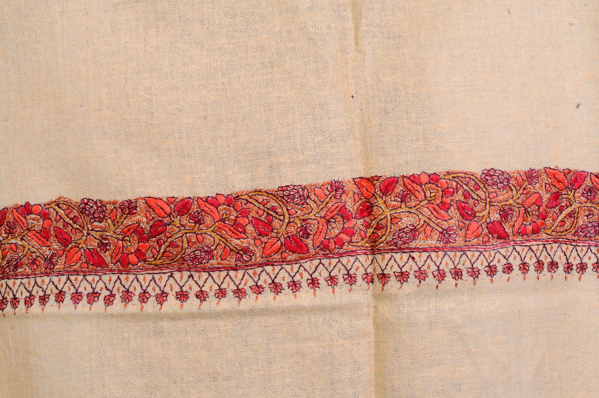Plain Tusha Cashmere Stole from Kashmir with Sozni Hand-Embroidery on Border