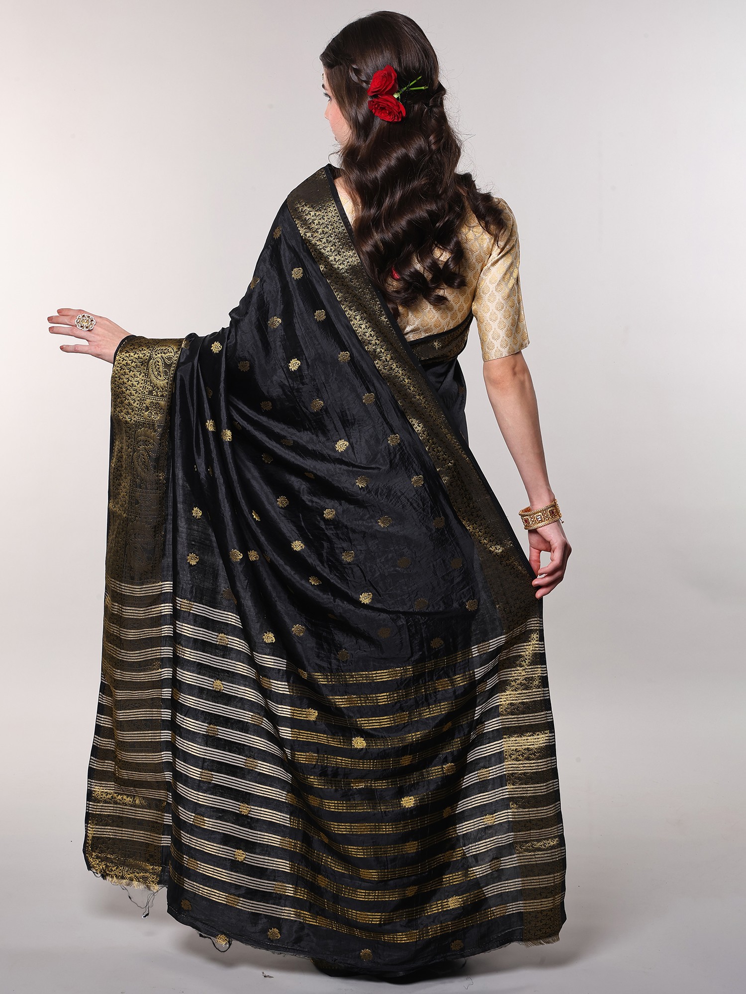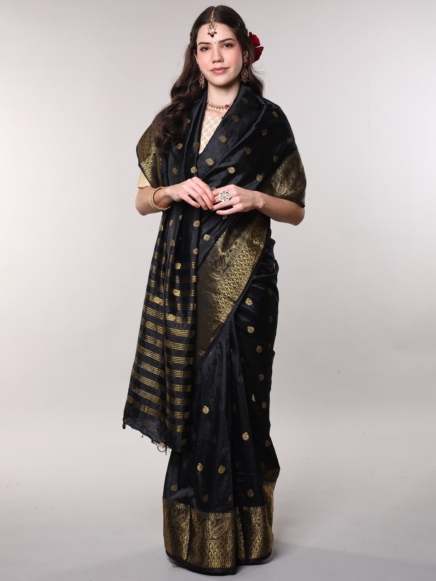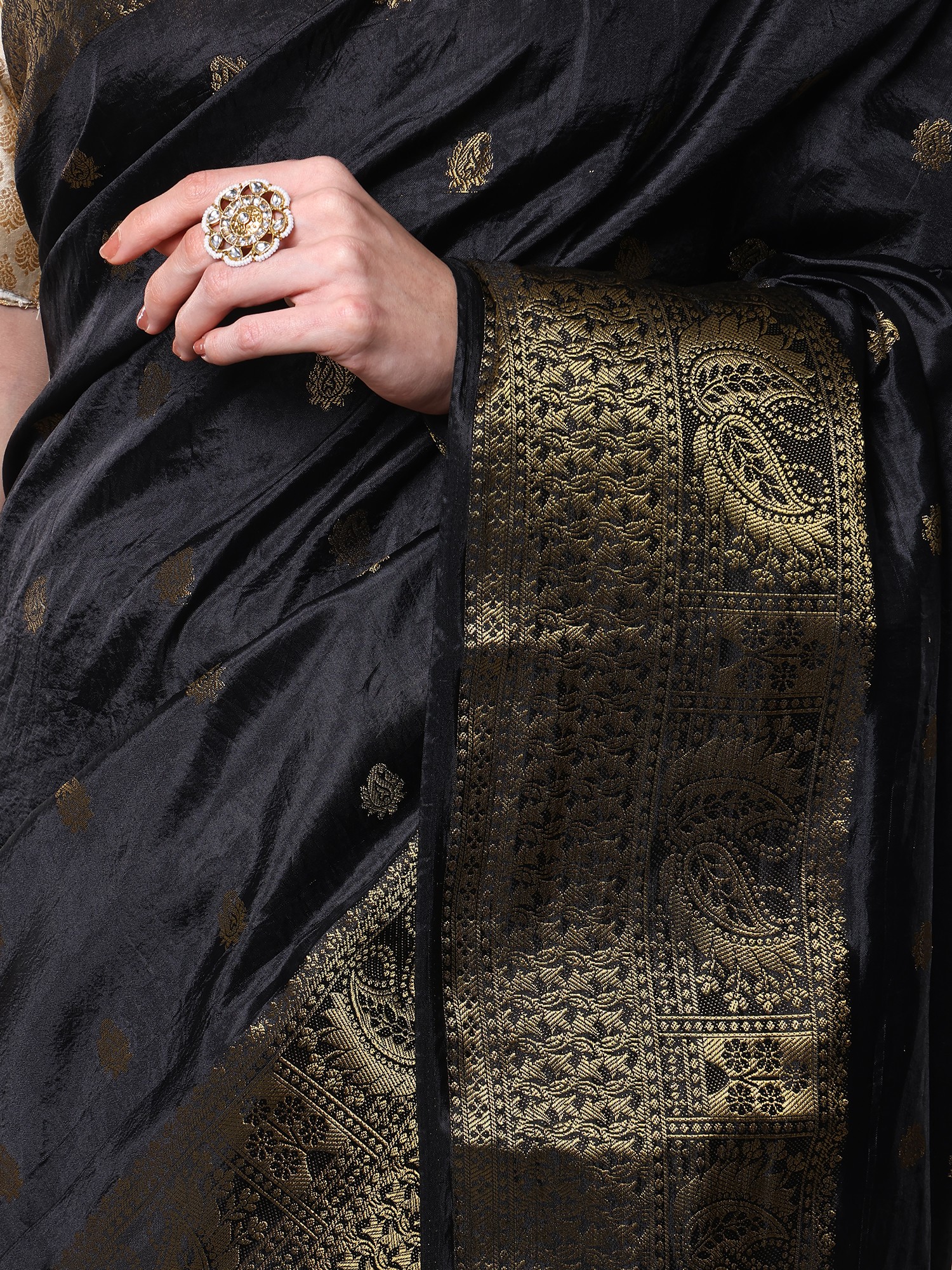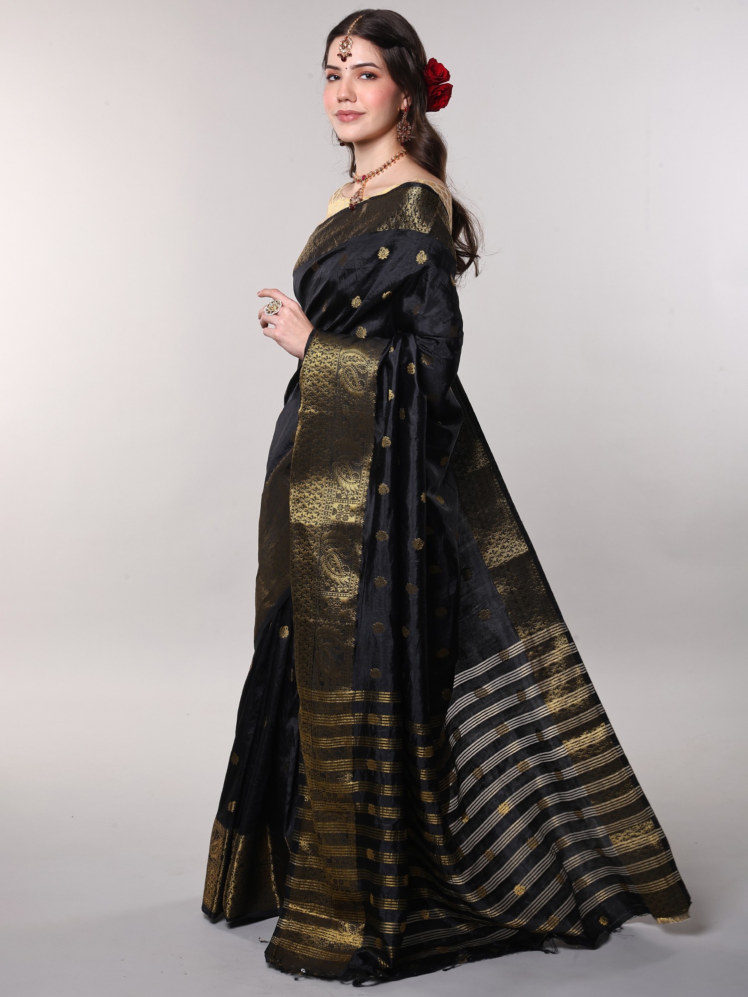 Adding a dramatic flourish to this already magnificent saree is its richly woven anchal, or pallu. Here, horizontal stripes of shimmering golden threads create a bold and captivating contrast against the black fabric. These stripes are interspersed with further intricate woven patterns, creating a dense and luxurious finish that is perfect for showcasing as it drapes. Complementing the anchal is a wide, ornate border, also meticulously woven with golden threads. This border features elaborate paisley designs within structured geometric frames, exuding a regal and opulent feel. The interplay of the striped anchal and the detailed border creates a harmonious and striking visual balance, making this saree a true work of art.
