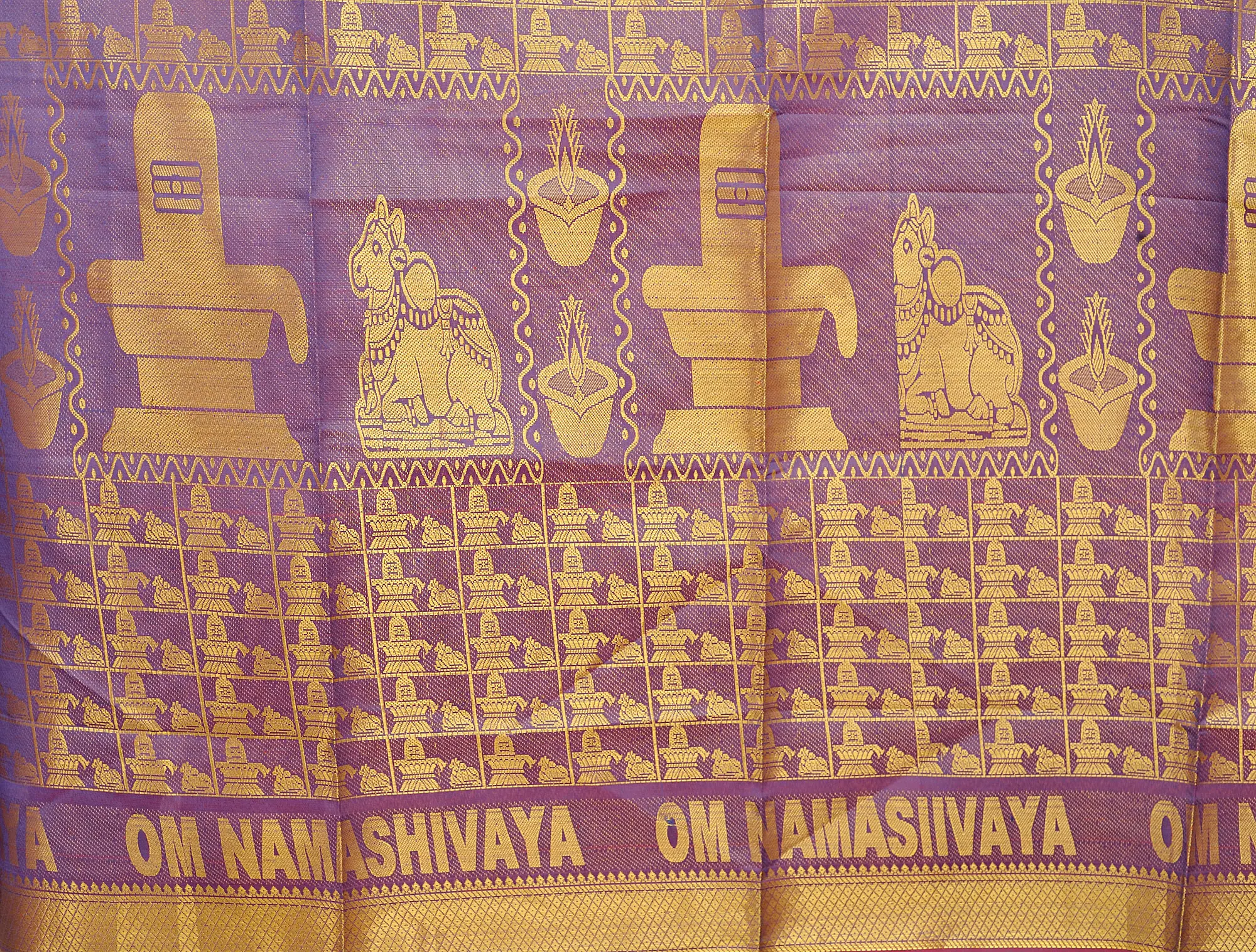 The true heart of this shawl lies in its intricate weaving, which showcases profound religious symbolism. Dominating the design are the sacred Shiva Linga and the devoted Nandi, rendered in a complementary violet against the shimmering golden backdrop. These powerful motifs are not merely decorative; they represent the divine union of Lord Shiva and his faithful vahana, embodying strength, faith, and spiritual elevation. The borders of the shawl are adorned with the powerful mantra "OM NAMAH SHIVAYA," repeating around the edges. This sacred chant is believed to invoke blessings and promote spiritual well-being, making this shawl a deeply resonant piece for prayer and meditation.
