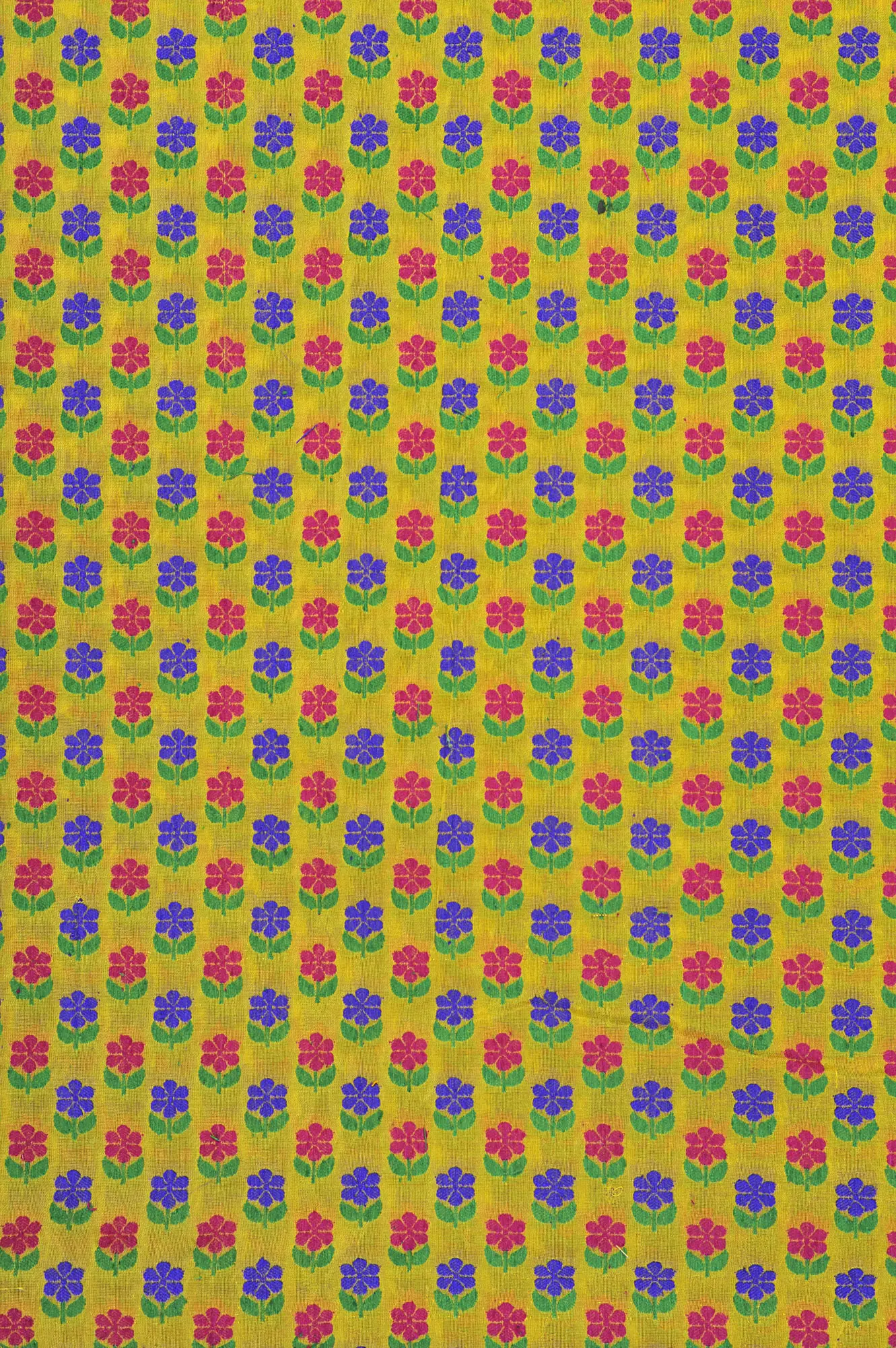 A splash of energetic yellow comes to you with this golden yellow Banrasi Katan fabric. The soft handloom silk is beautified with ethnic floral patterns, stitched using pink, blue, and green that contrast with the yellow, giving you a classic and beautiful handloom marvel.