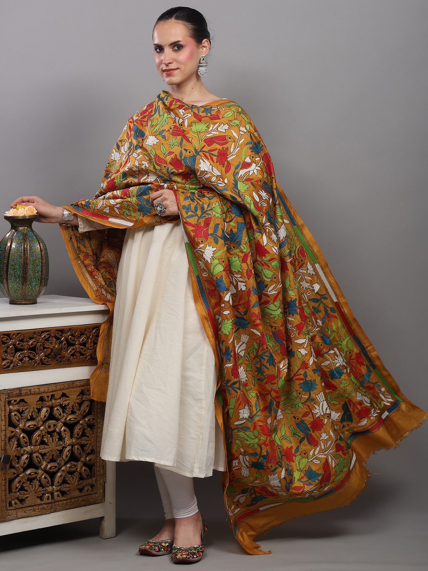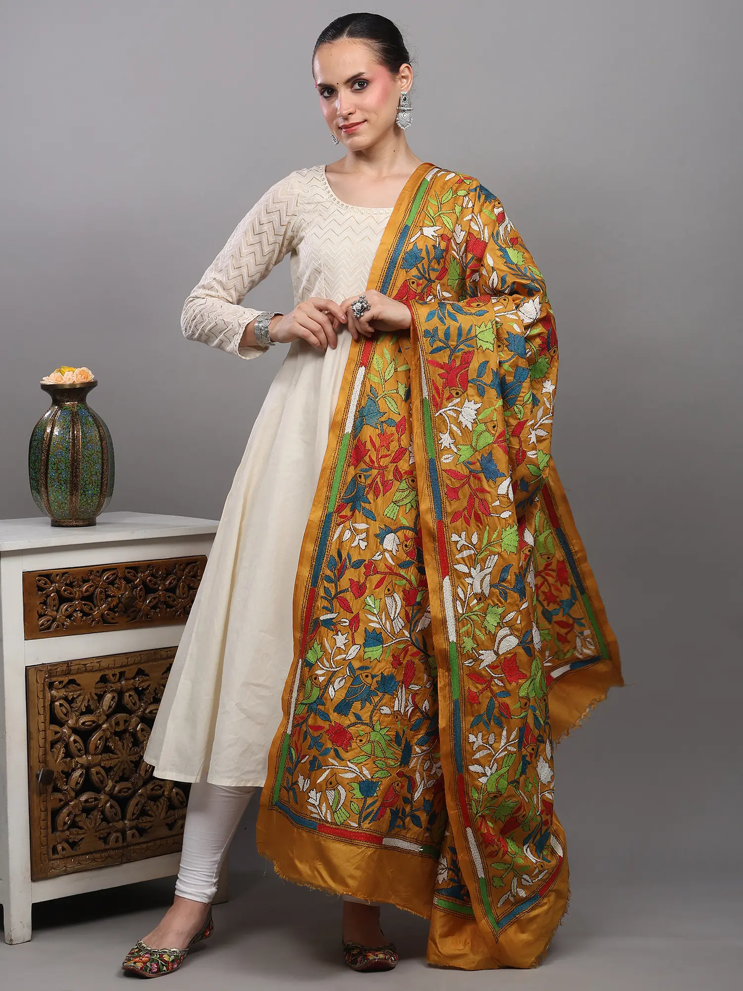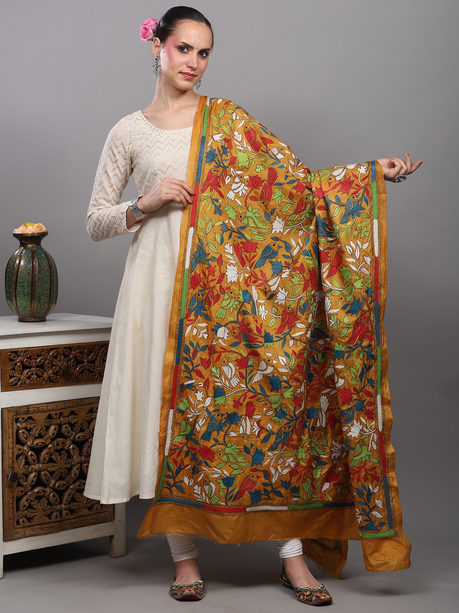 Mustard Yellow Cotton Semi Silk Stole with Multicolored Kantha Embroidery