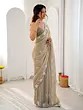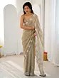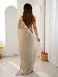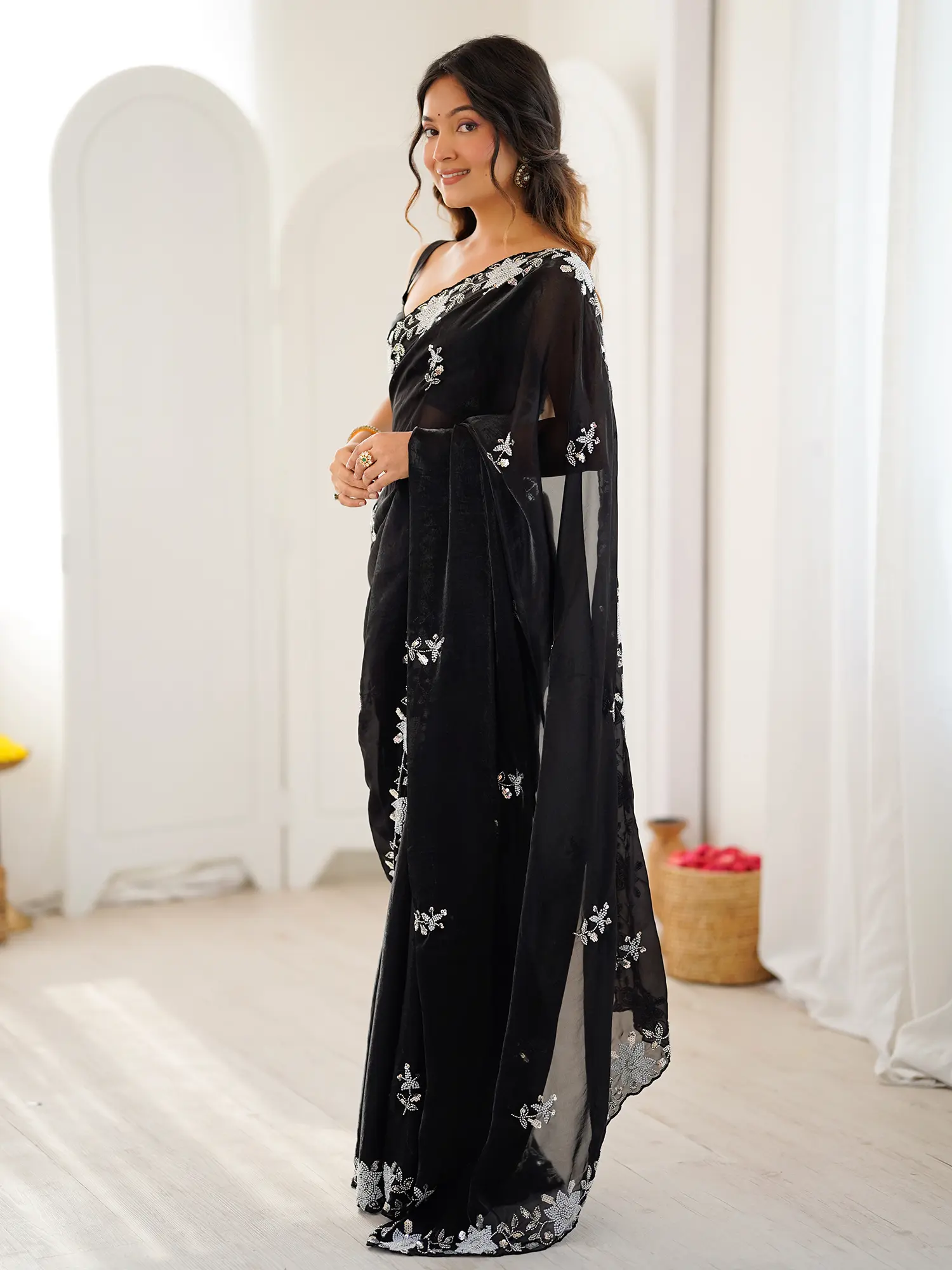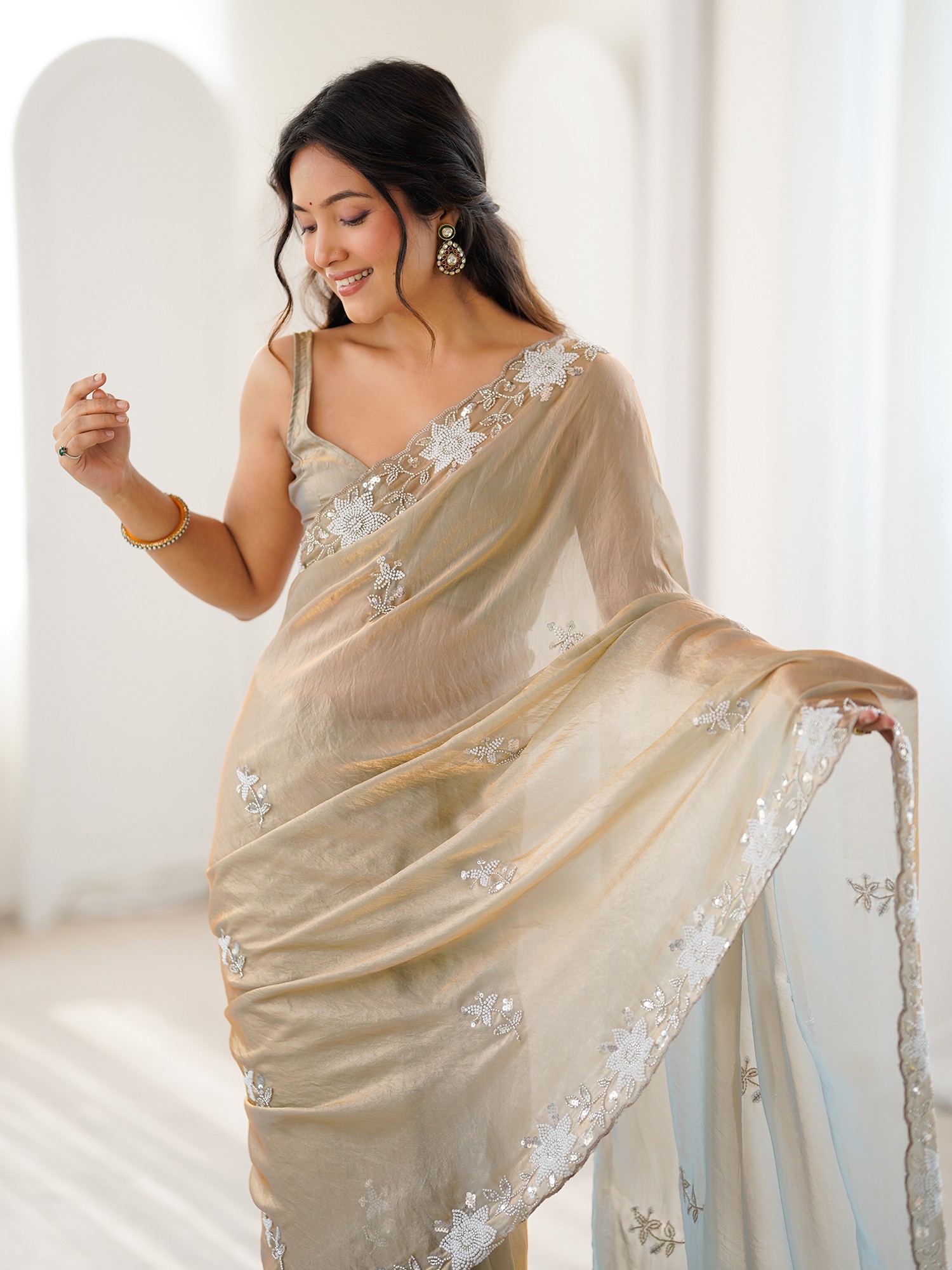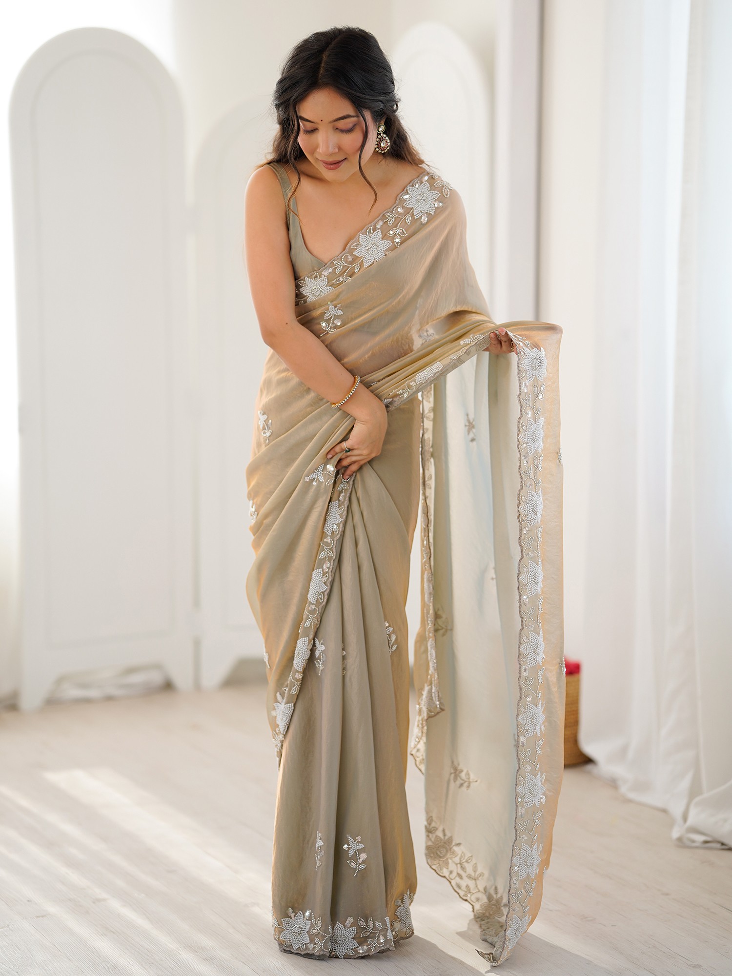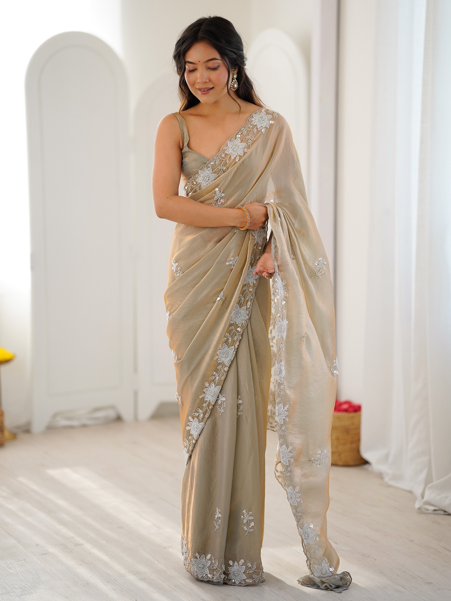 The rich, understated hue of the Fendy Satin provides the perfect canvas for the opulent embellishments. You'll notice the delicate floral motifs that cascade along the borders and scatter across the drape, each one painstakingly detailed to catch the light. The accompanying blouse and underskirt are tailor-made to complement your individual silhouette, ensuring a perfect fit and a seamless look that enhances your natural grace.