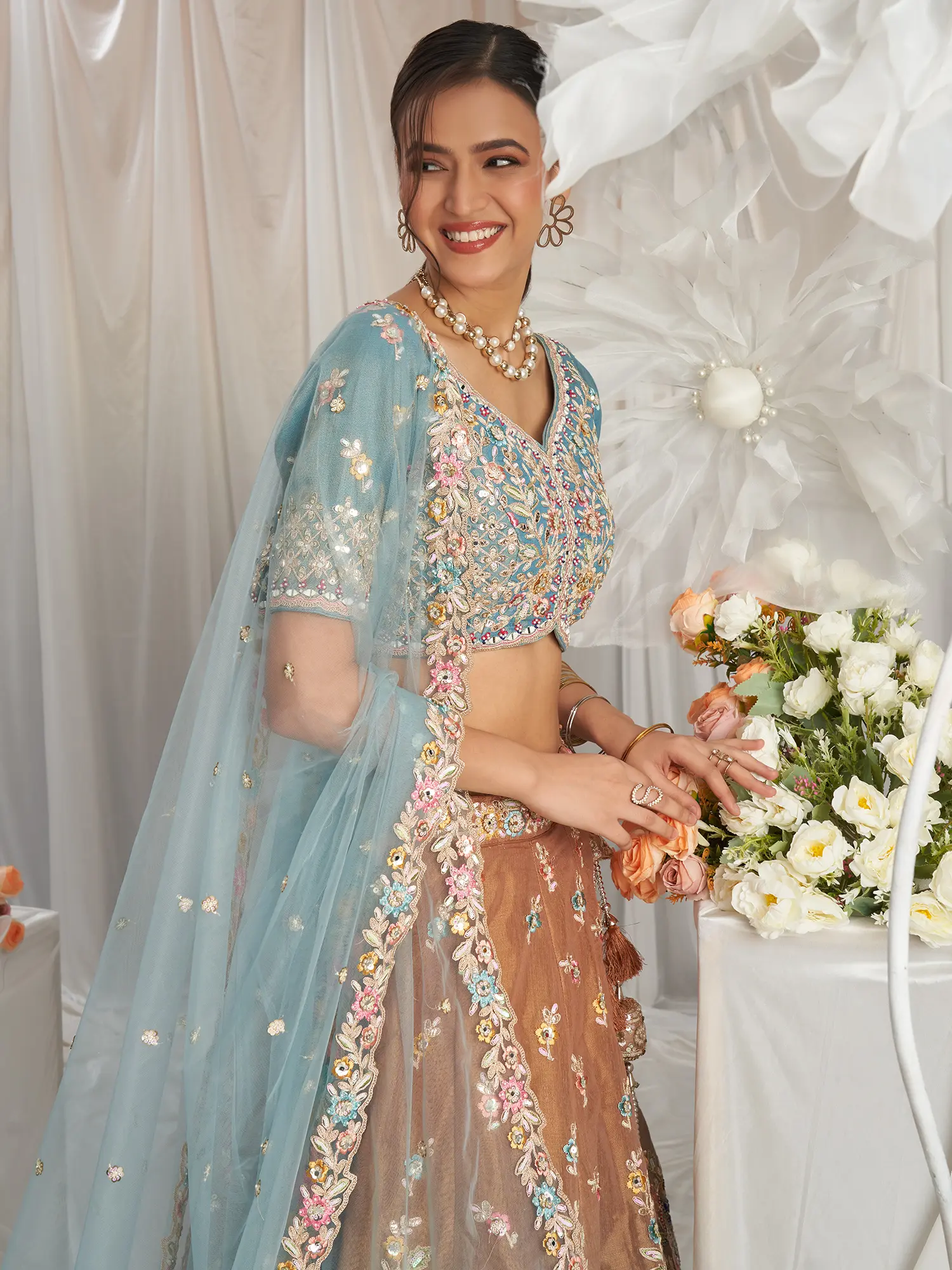 Net Chakra-Vine Motif Bridal Lehenga Choli With All-Over Zari, Sequins, Diamond, Multi Thread Embroidery With Soft Net Butti Pattern Dupatta