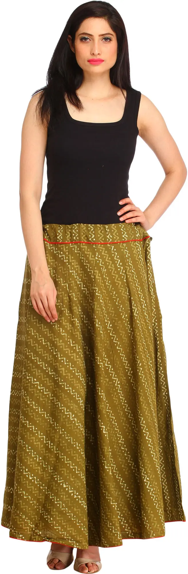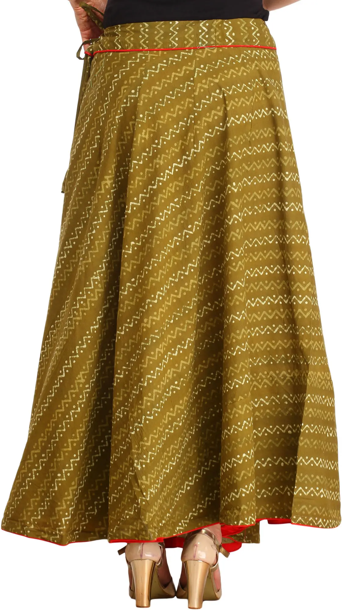 This “Gothic-Olive Long Skirt” is a work of creative artistry; let its mystery envelop you. This skirt is made of pure cotton and has Bagdoo-Printed Zigzag Stripes and Piping, which turn every stride into a poetic dance. Its dominant design combines tradition with edge, symbolising the wearer's free spirit and unique personality.