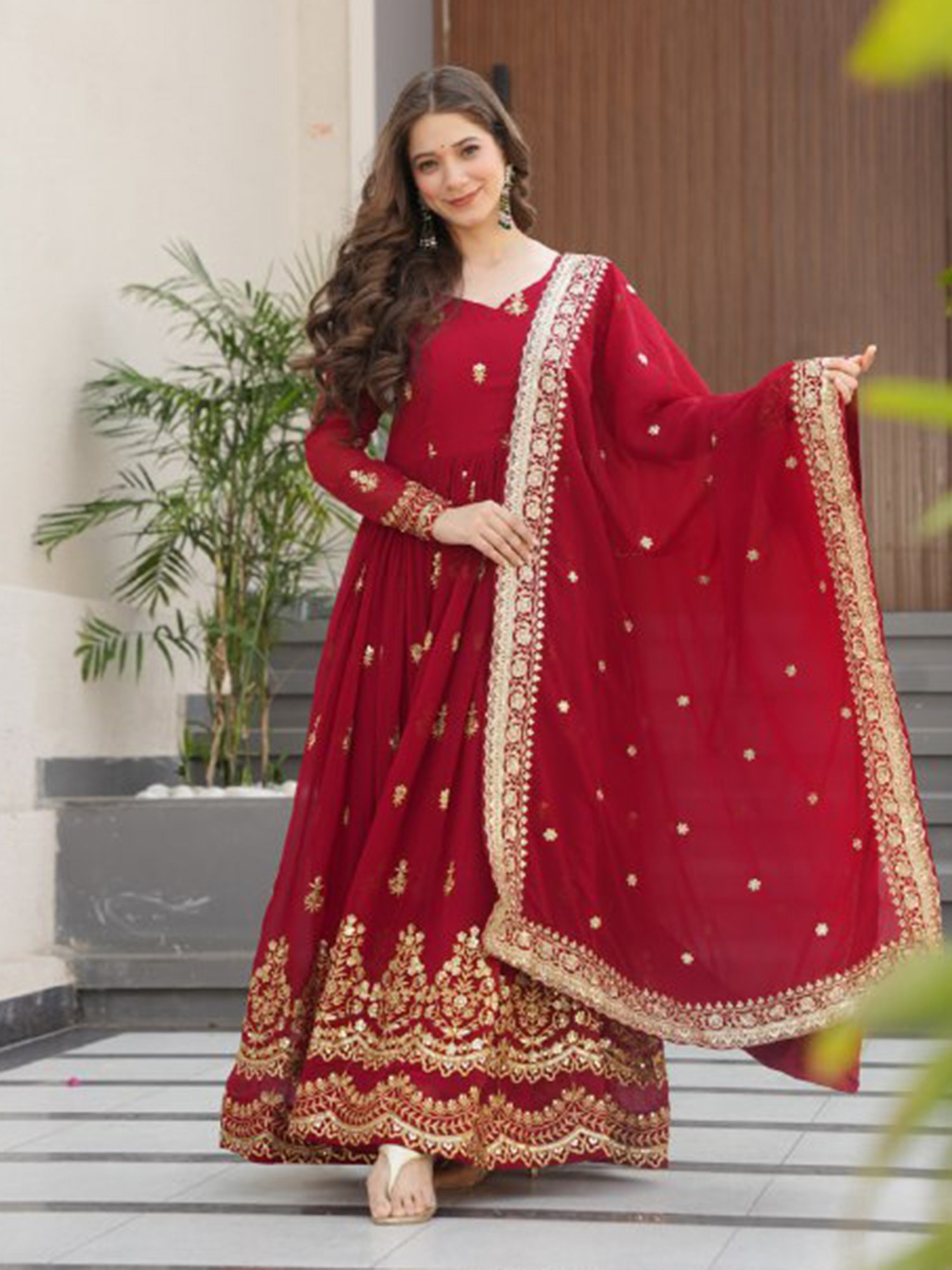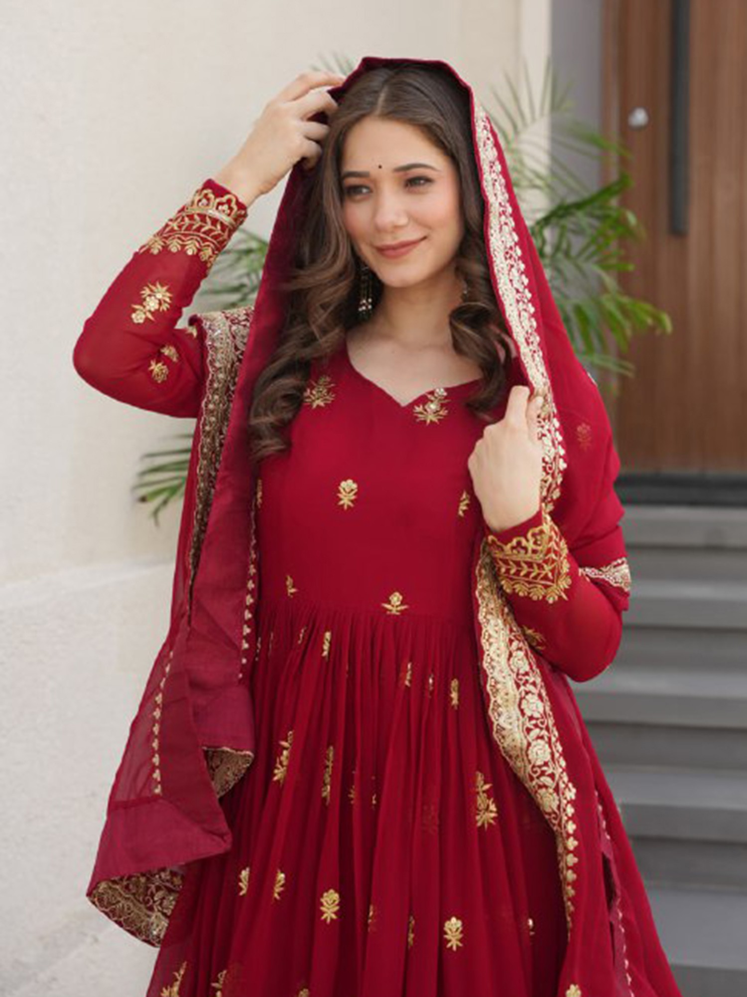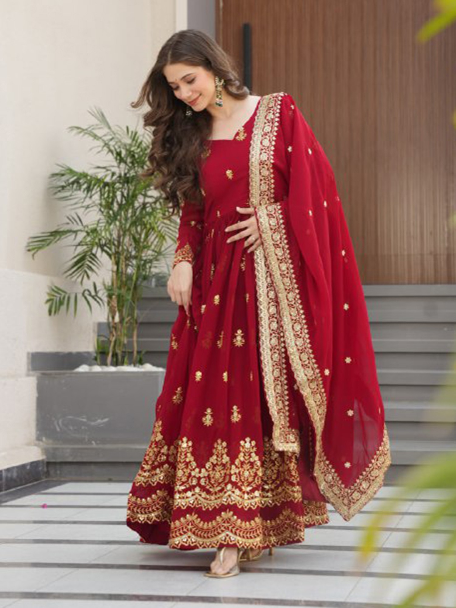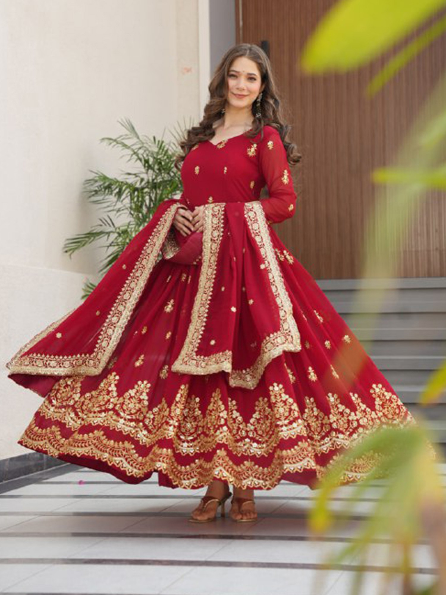 The deep, captivating red hue forms a stunning canvas for the opulent golden embroidery, creating a striking visual contrast. You'll appreciate the way the Zari threads catch the light, lending an ethereal glow to the elaborate motifs that cascade down the hem and grace the sleeves. A matching dupatta, also delicately embellished along its borders, completes this resplendent look, offering a perfect complement. This design is thoughtfully tailored to a size #38 (Medium), ensuring a flattering silhouette for many.