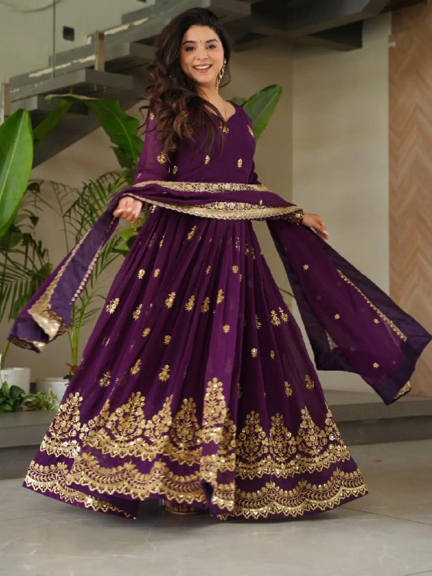 Graceful Faux Georgette Gown With Dupatta Adorned With Delicate Sequins And Zari Embroidery For Women