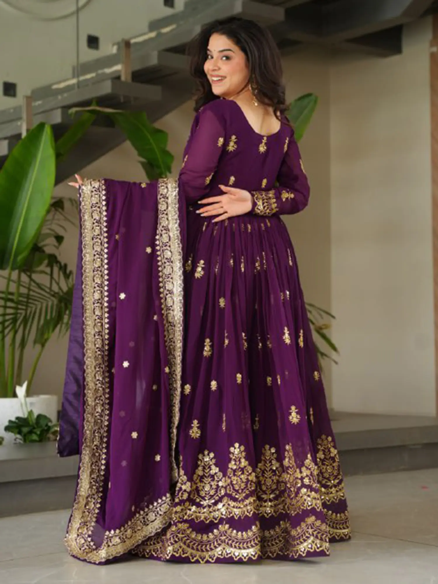 Crafted from the finest Faux Blooming fabric, you'll immediately feel the luxurious drape and soft texture against your skin. Each piece is a testament to artisanal skill, meticulously adorned with rich Zari and shimmering sequins. The intricate embroidery, painstakingly applied, forms breathtaking patterns that speak of heritage and impeccable craftsmanship.