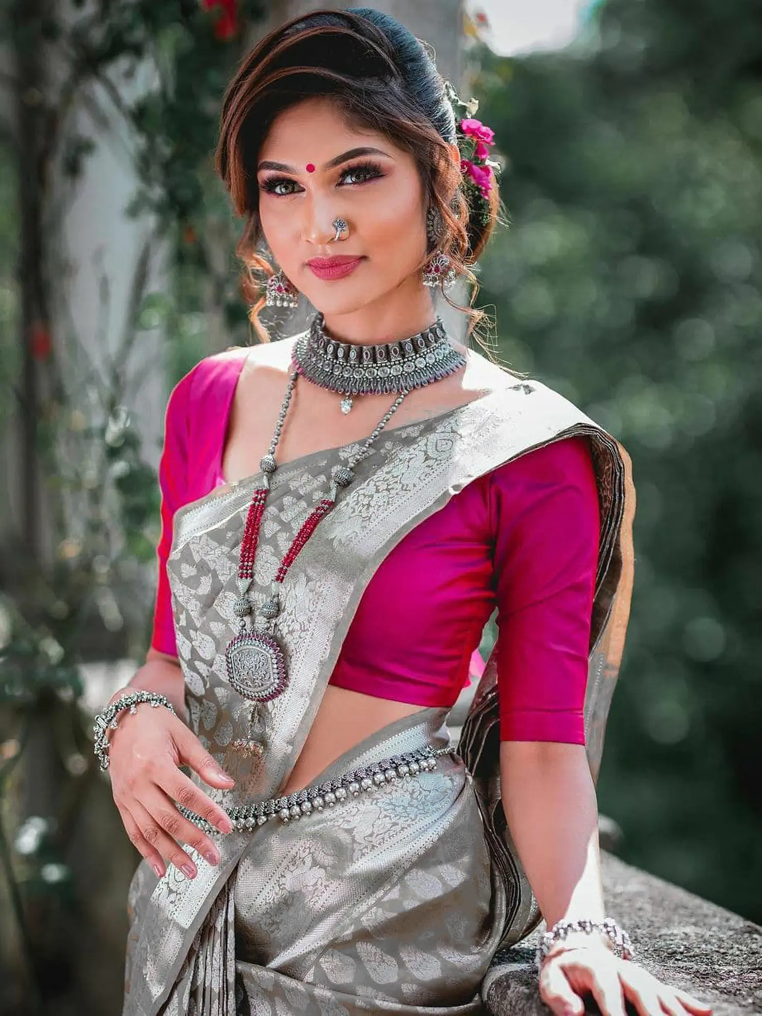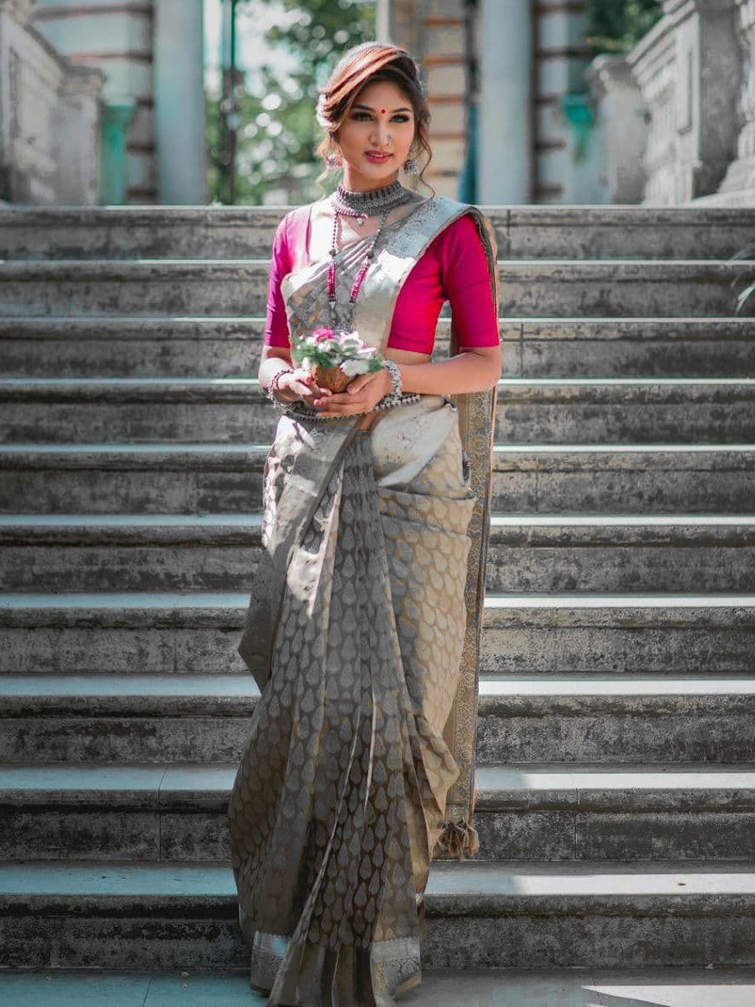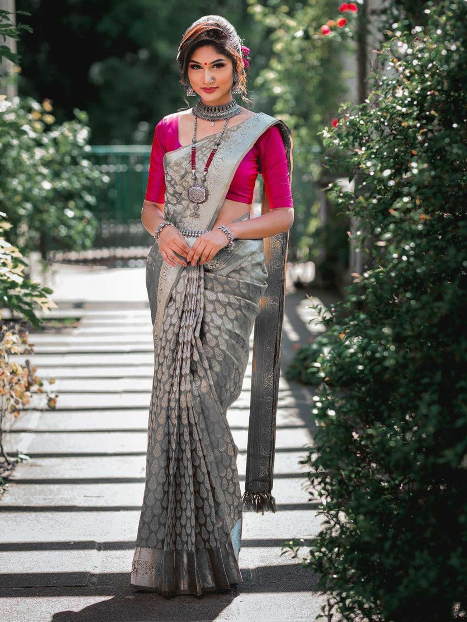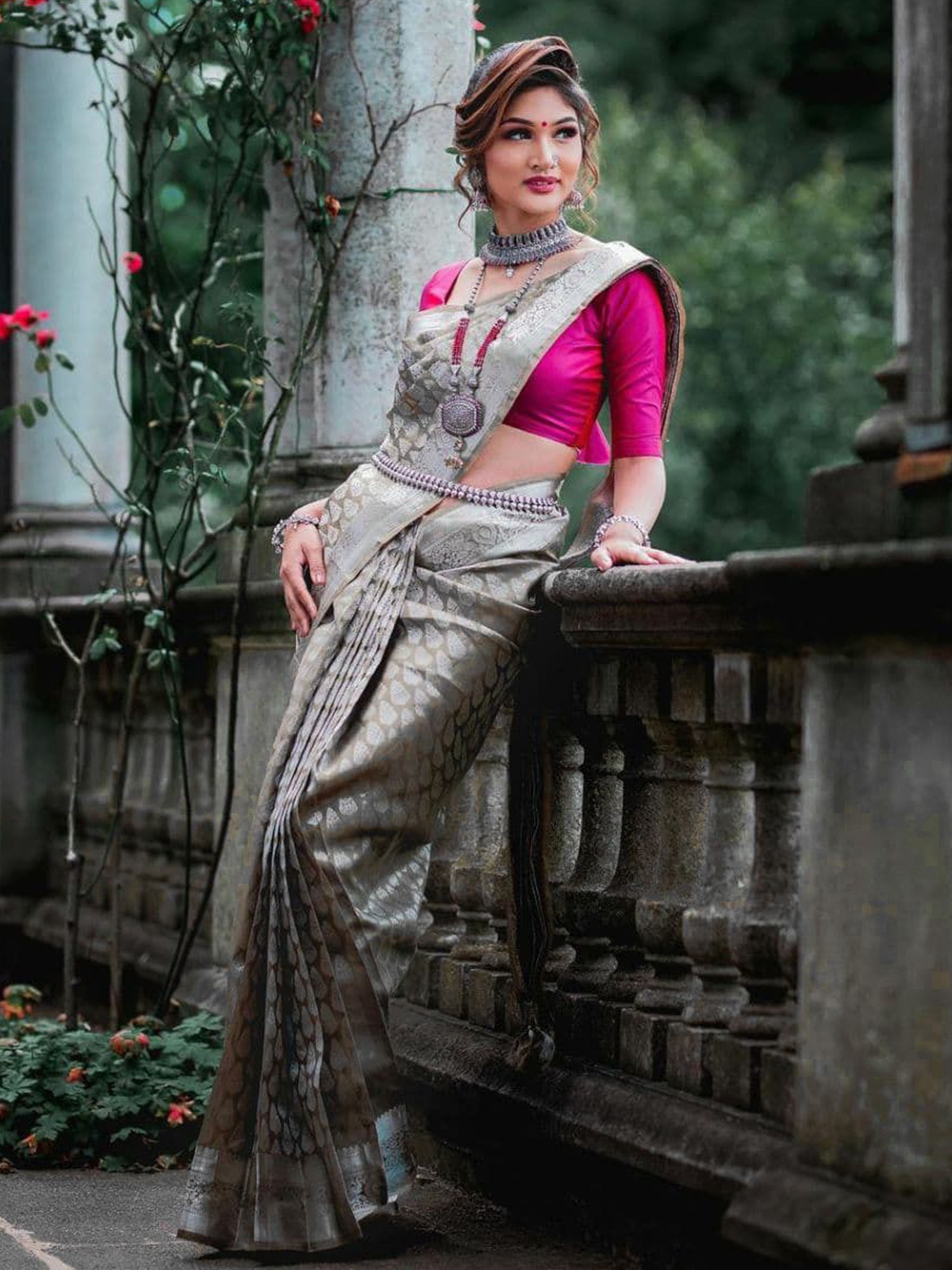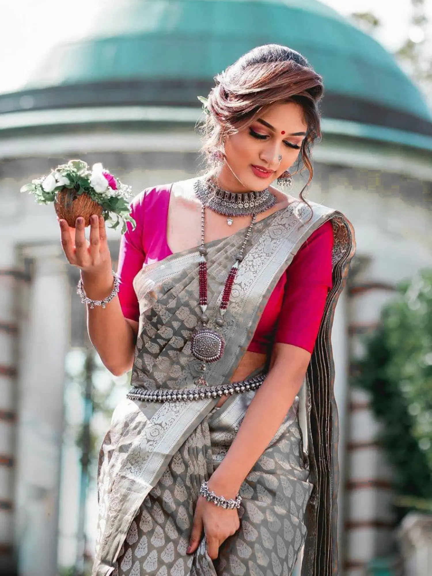 You'll admire the subtle yet striking all-over pattern, artfully rendered in a sophisticated tonal weave that catches the light with every movement. The rich pallu, a signature of distinguished Indian textiles, is embellished with elaborate jacquard work, adding a magnificent flourish. The soft, flowing texture of the silk ensures a comfortable and flattering fit, enhancing your natural grace.