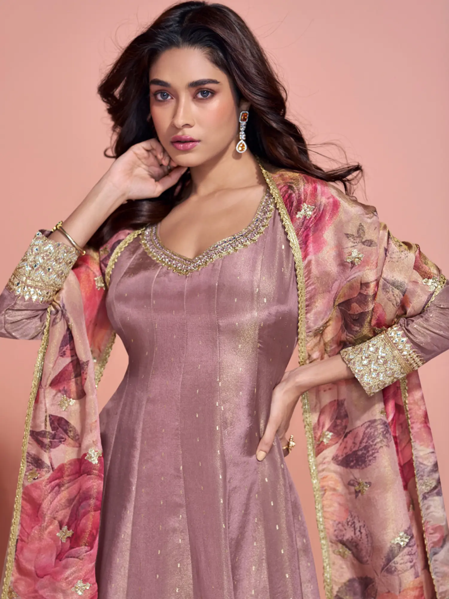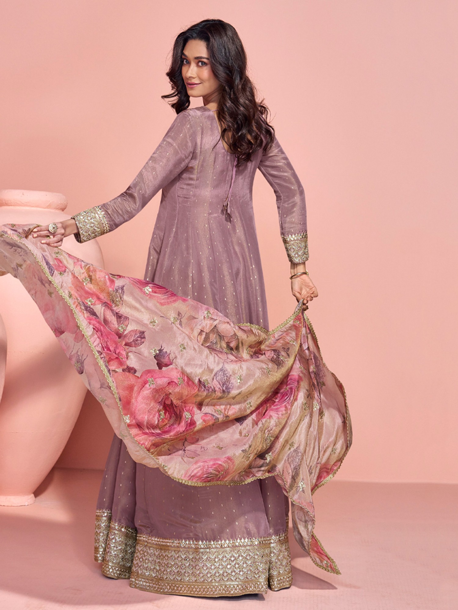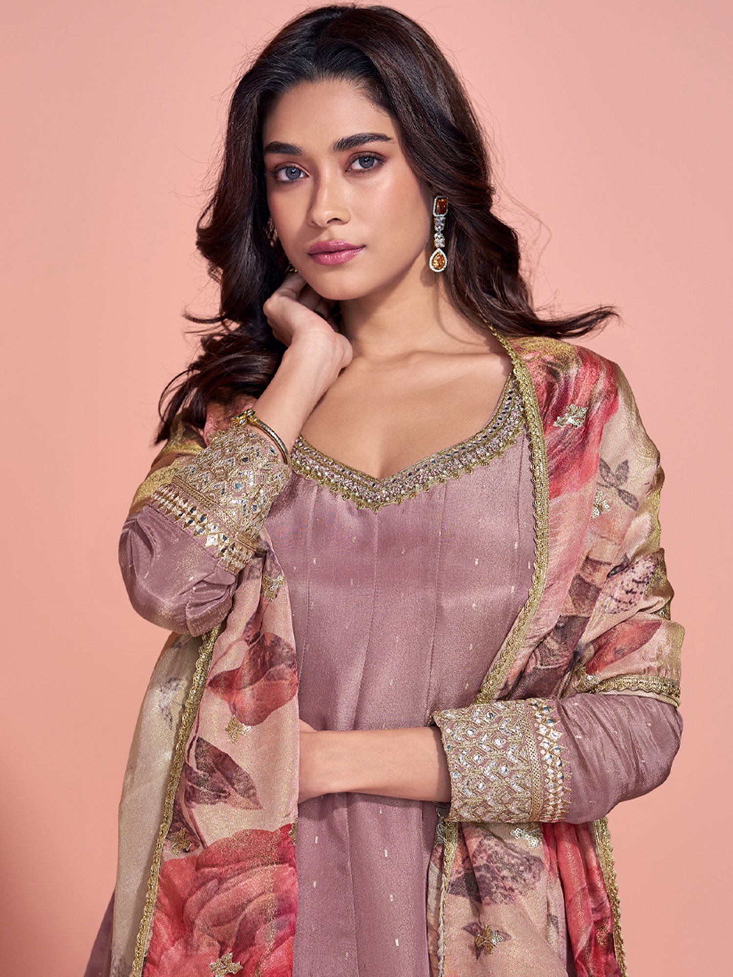 The flowing silhouette is designed to flatter, creating a mesmerizing movement with every step you take. Complementing this is the accompanying Silk Chinon dupatta, rendered in a graceful print that adds a layer of refined charm. The richly embroidered border on the hem and cuffs provides a touch of opulent detail, elevating the overall aesthetic to one of sheer luxury.