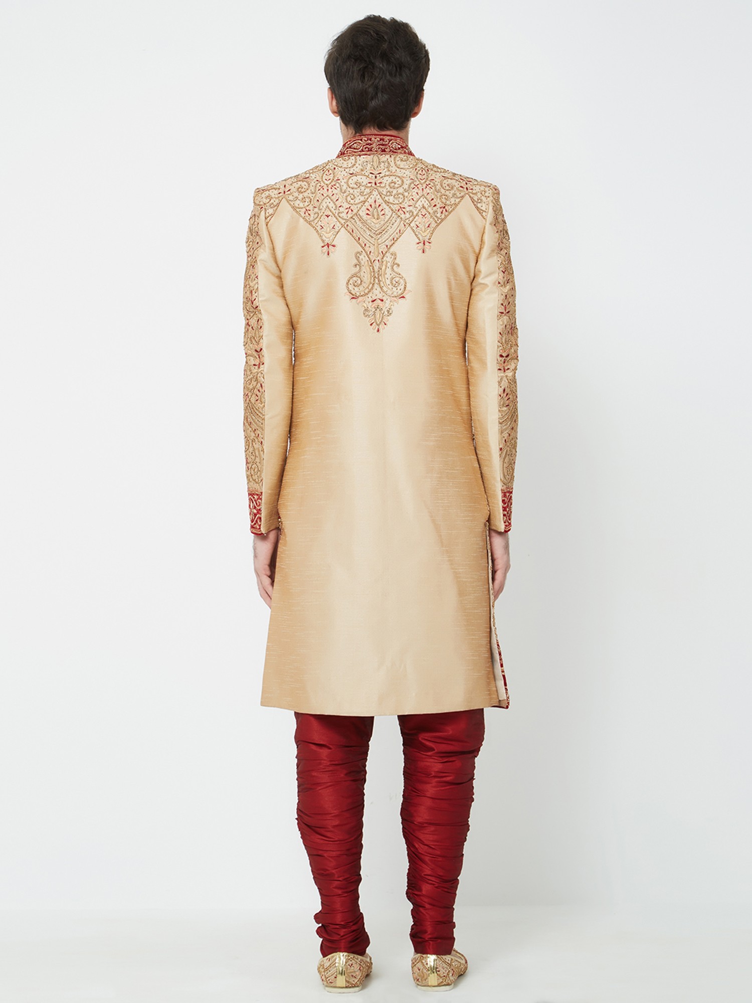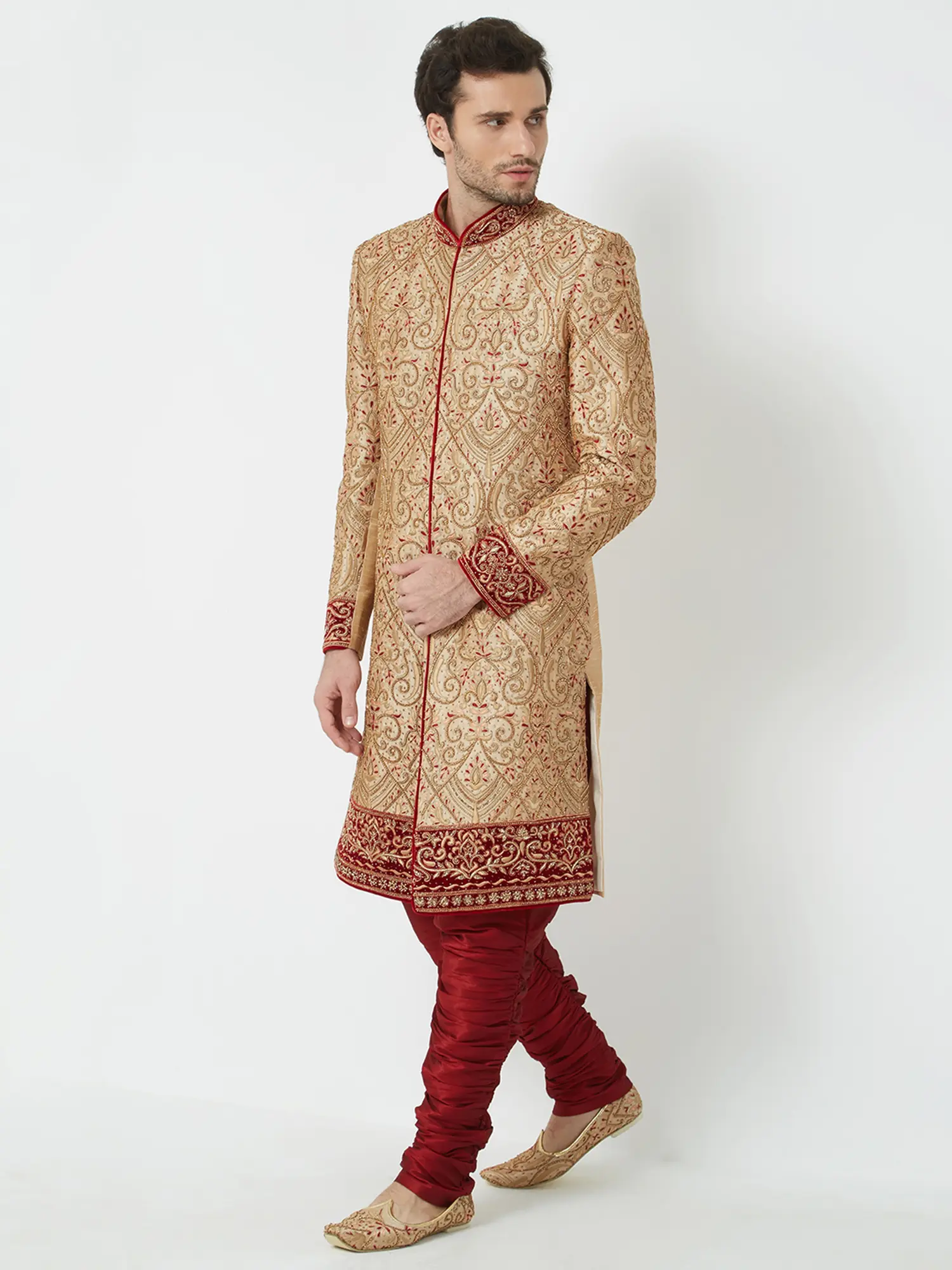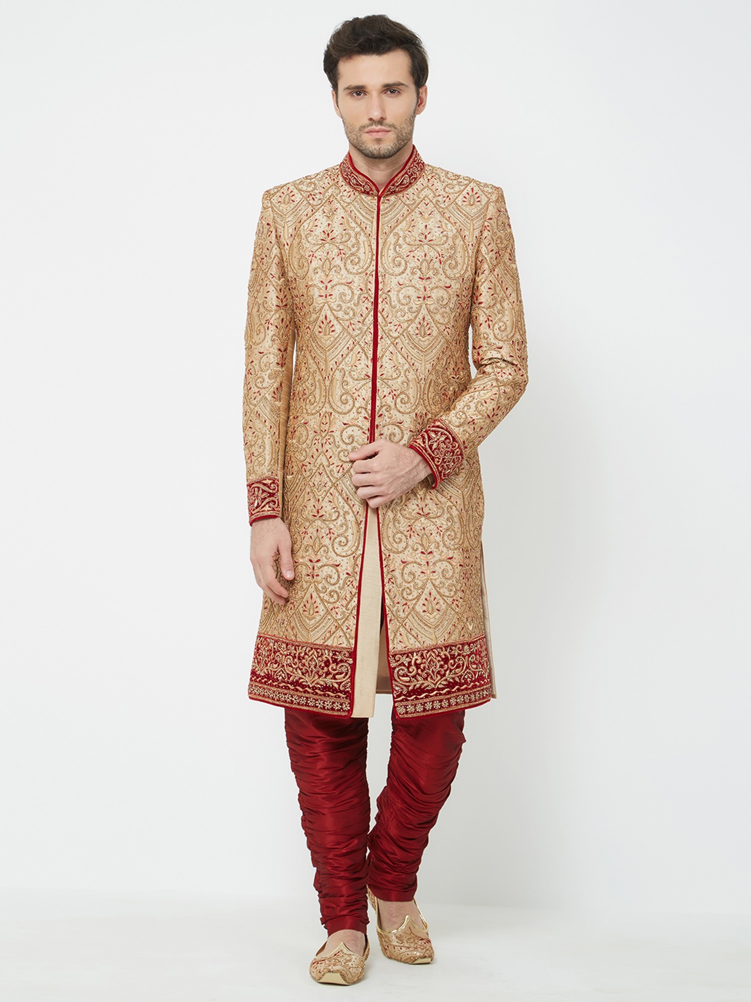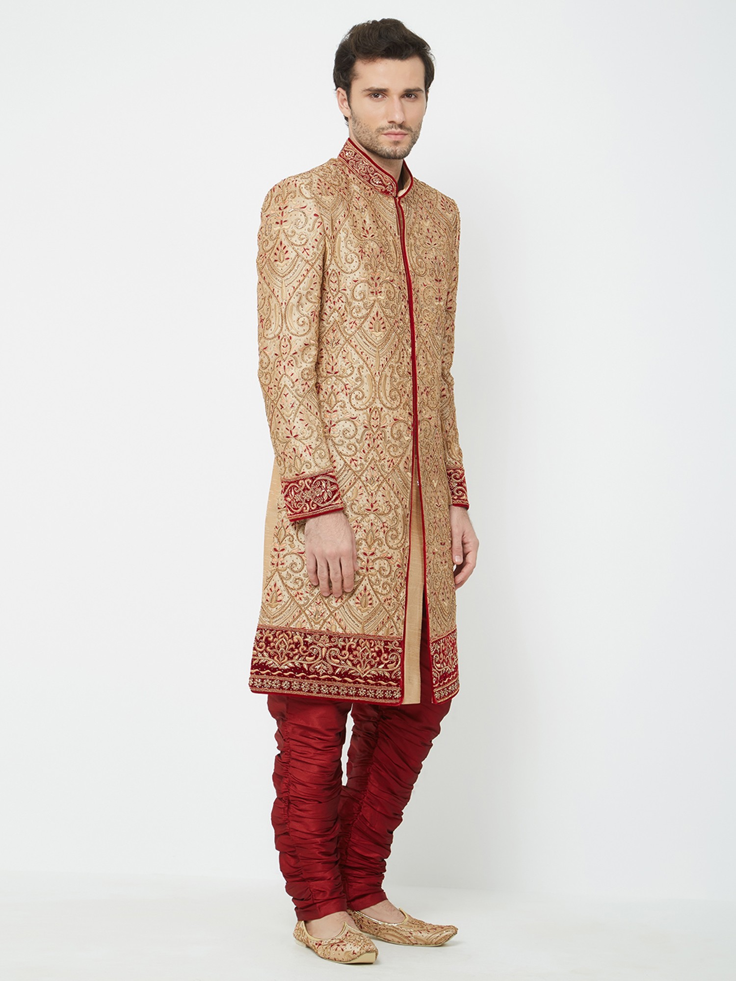 You'll immediately appreciate the rich tapestry of design that adorns this attire. The warm, inviting hue of the art silk serves as a canvas for opulent embroidery, featuring rich patterns that speak of heritage and grandeur. Contrasting detailing along the collar and cuffs provides a striking visual anchor, while the accompanying churidar pajama offers a comfortable yet elegant complement. The overall silhouette is designed to flatter, exuding a confident and distinguished appeal.