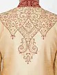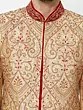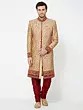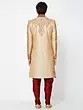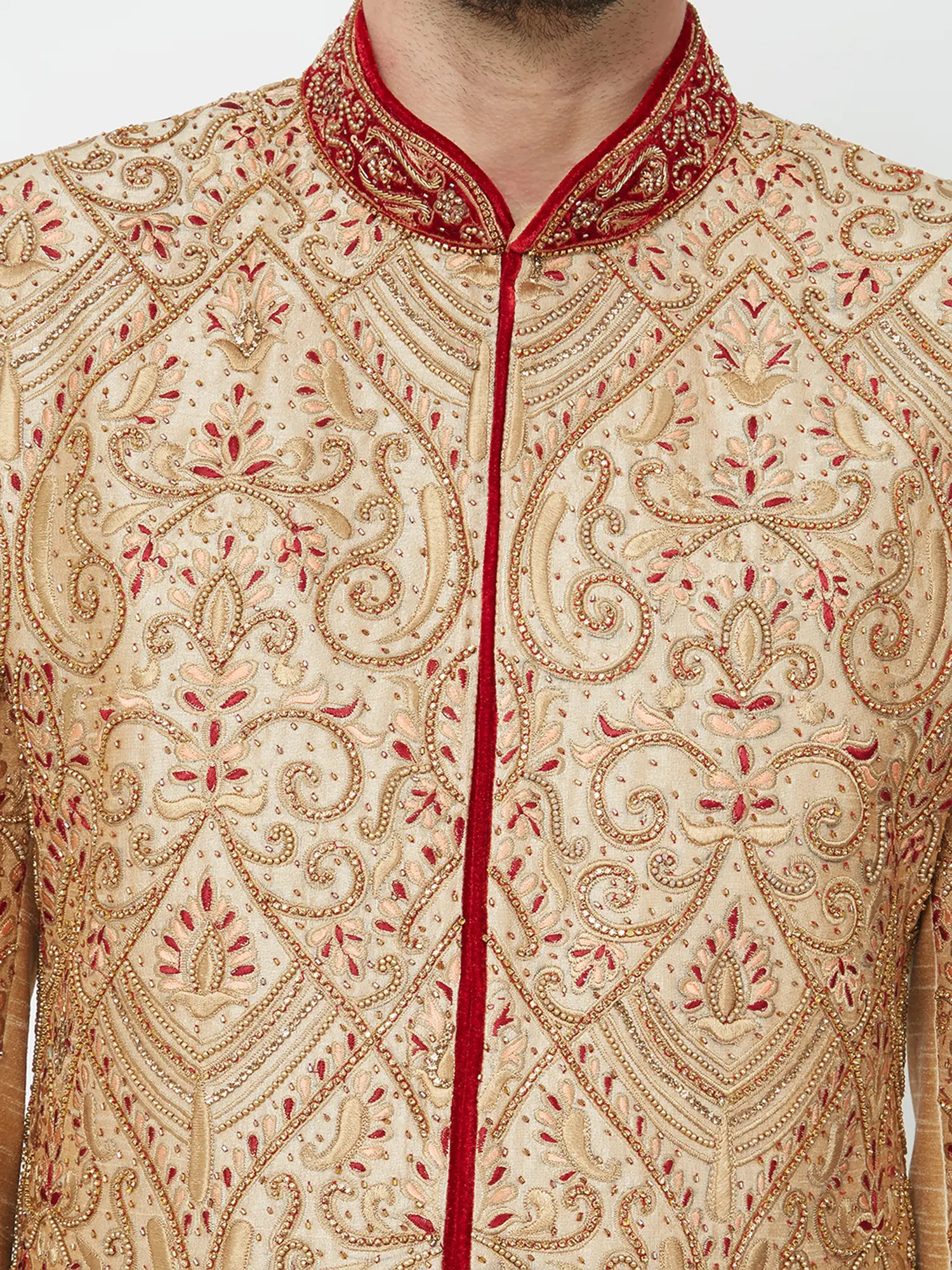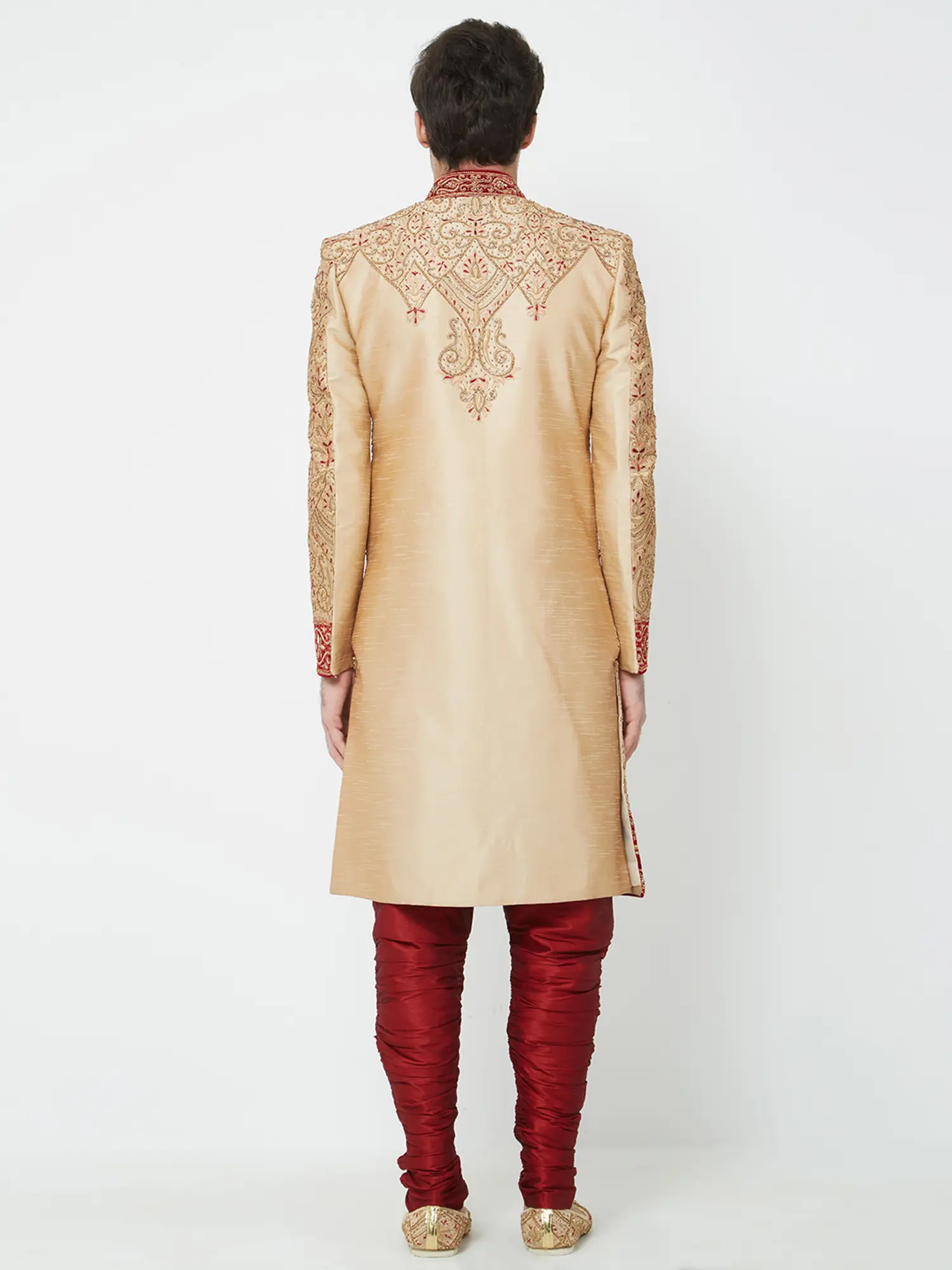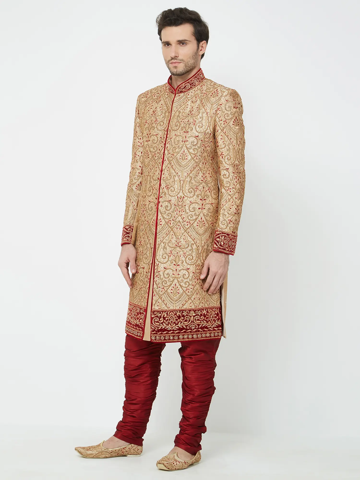 You'll immediately appreciate the rich tapestry of design that adorns this attire. The warm, inviting hue of the art silk serves as a canvas for opulent embroidery, featuring rich patterns that speak of heritage and grandeur. Contrasting detailing along the collar and cuffs provides a striking visual anchor, while the accompanying churidar pajama offers a comfortable yet elegant complement. The overall silhouette is designed to flatter, exuding a confident and distinguished appeal.