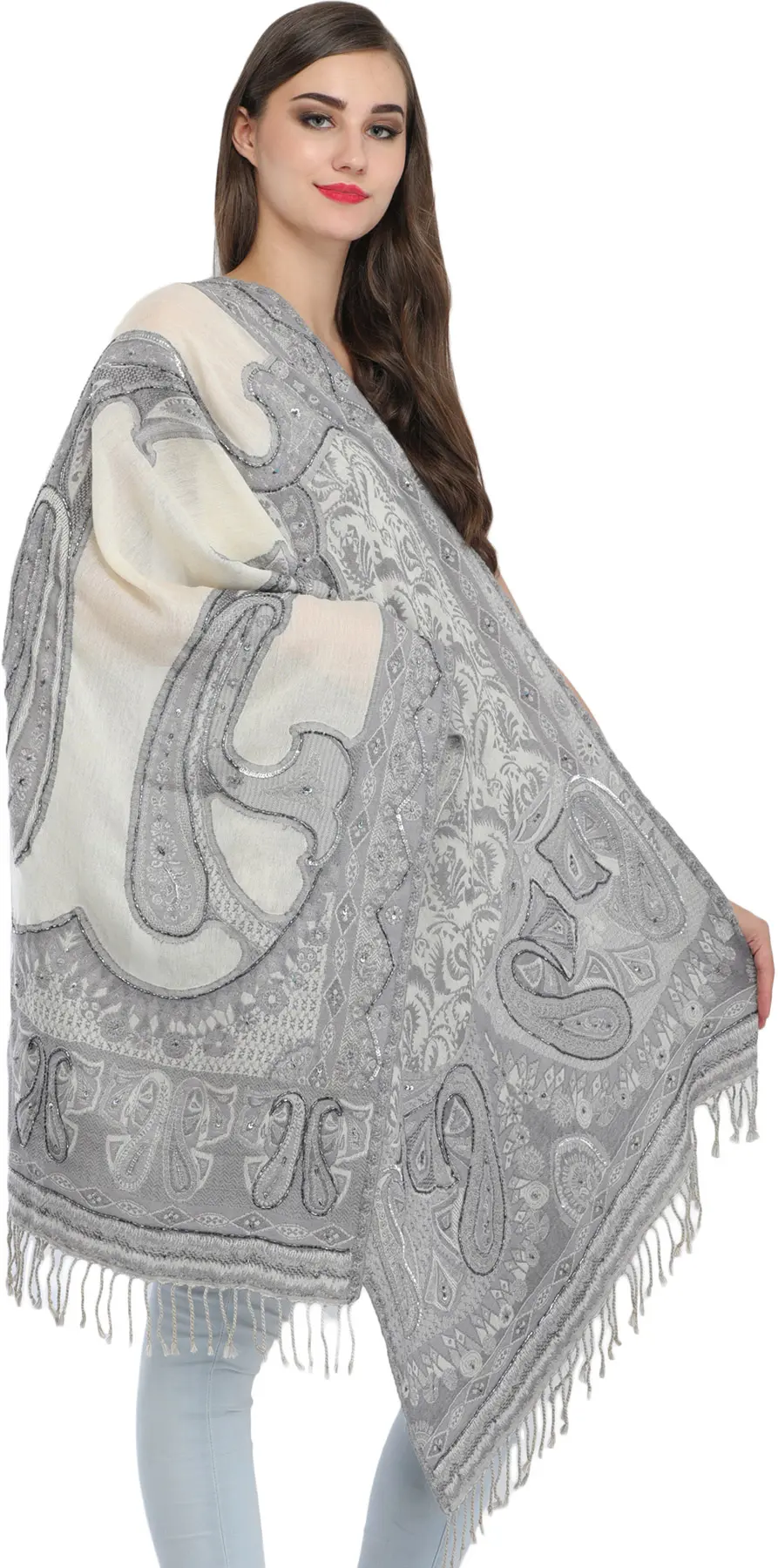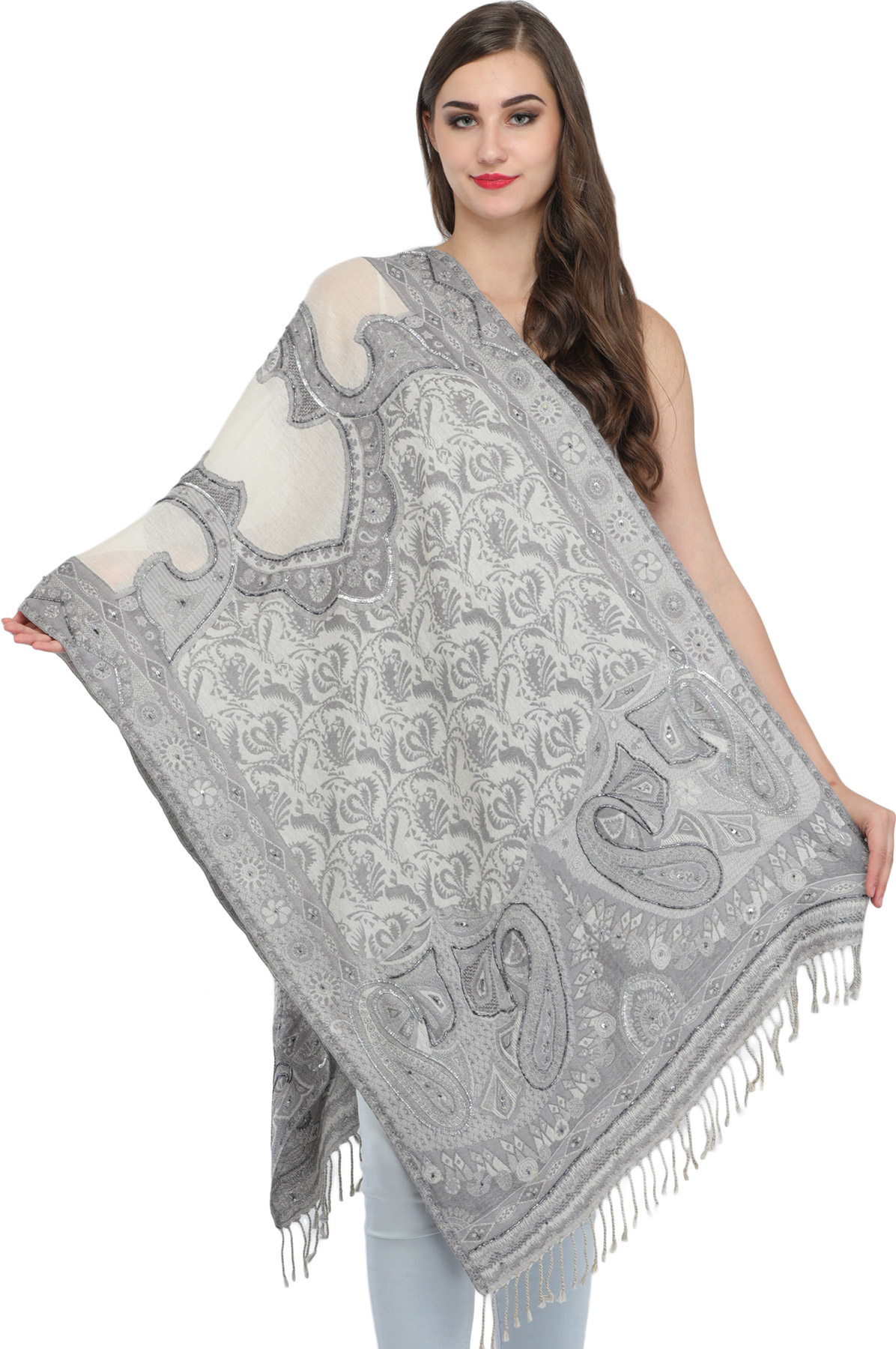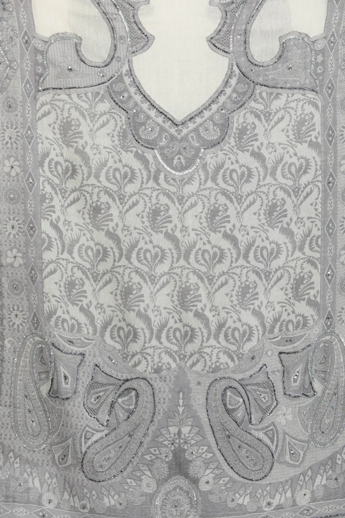 What truly sets this stole apart is its exquisite embellishment. Tiny, shimmering beads and sparkling sequins are meticulously embroidered, catching the light with every movement. These carefully placed details trace the elegant paisley motifs and floral elements that define the Jamawar pattern, adding a captivating dimension of texture and sparkle. The craftsmanship involved in applying each bead and sequin speaks to a dedication to quality and a passion for creating a truly unique piece. The fringe along the edges further enhances its allure, providing a soft, flowing finish. ––––––––––––––––––
