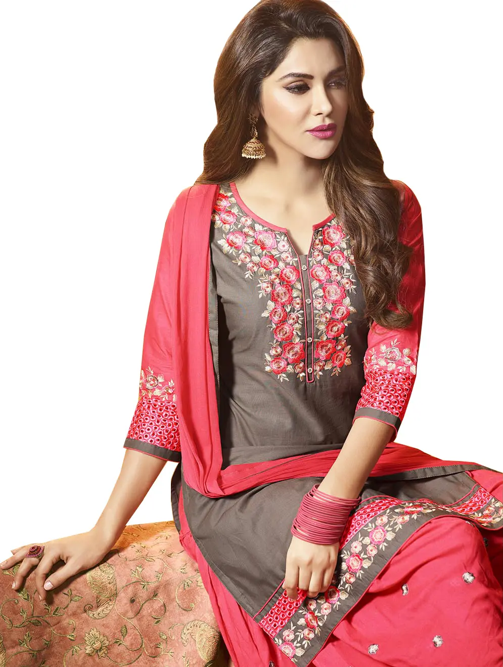 Fuchsia-Rose Gujarati Bedspread with All-Over Embroidered Elephants and Parrots