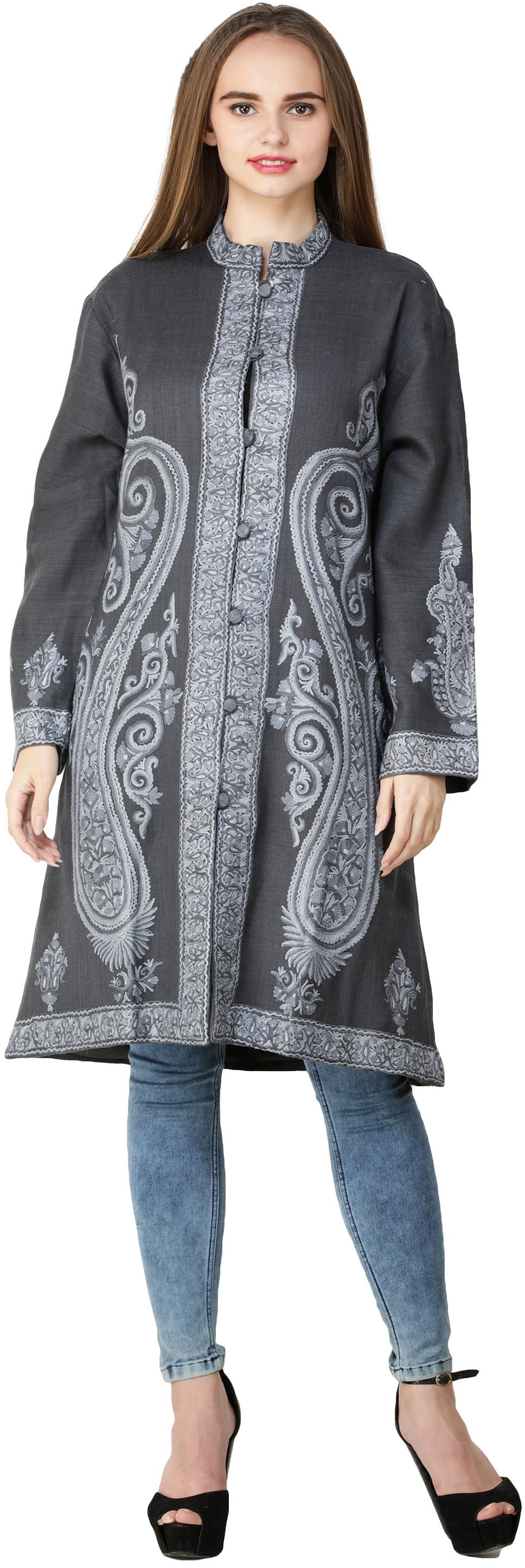 Pure Wool Cape Jacket with Sozni Embroidery and Front Pockets