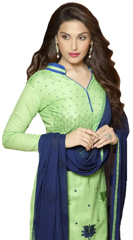 Discover a timeless blend of comfort and style with this exquisite choodidaar kameez suit. Crafted from pure cotton, it promises breathability and a soft feel against your skin, making it an ideal choice for both casual outings and more formal gatherings. The refreshing green hue of the kameez serves as a perfect canvas for the captivating embroidery that adorns it.