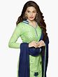 Completing this stunning outfit is a flowing navy blue dupatta. The dupatta is lightweight and drapes beautifully, offering a graceful contrast to the green kameez. It is edged with a delicate green border, tying the entire ensemble together seamlessly. This thoughtful detail ensures that every element of the suit complements the others, creating a harmonious and visually appealing look.