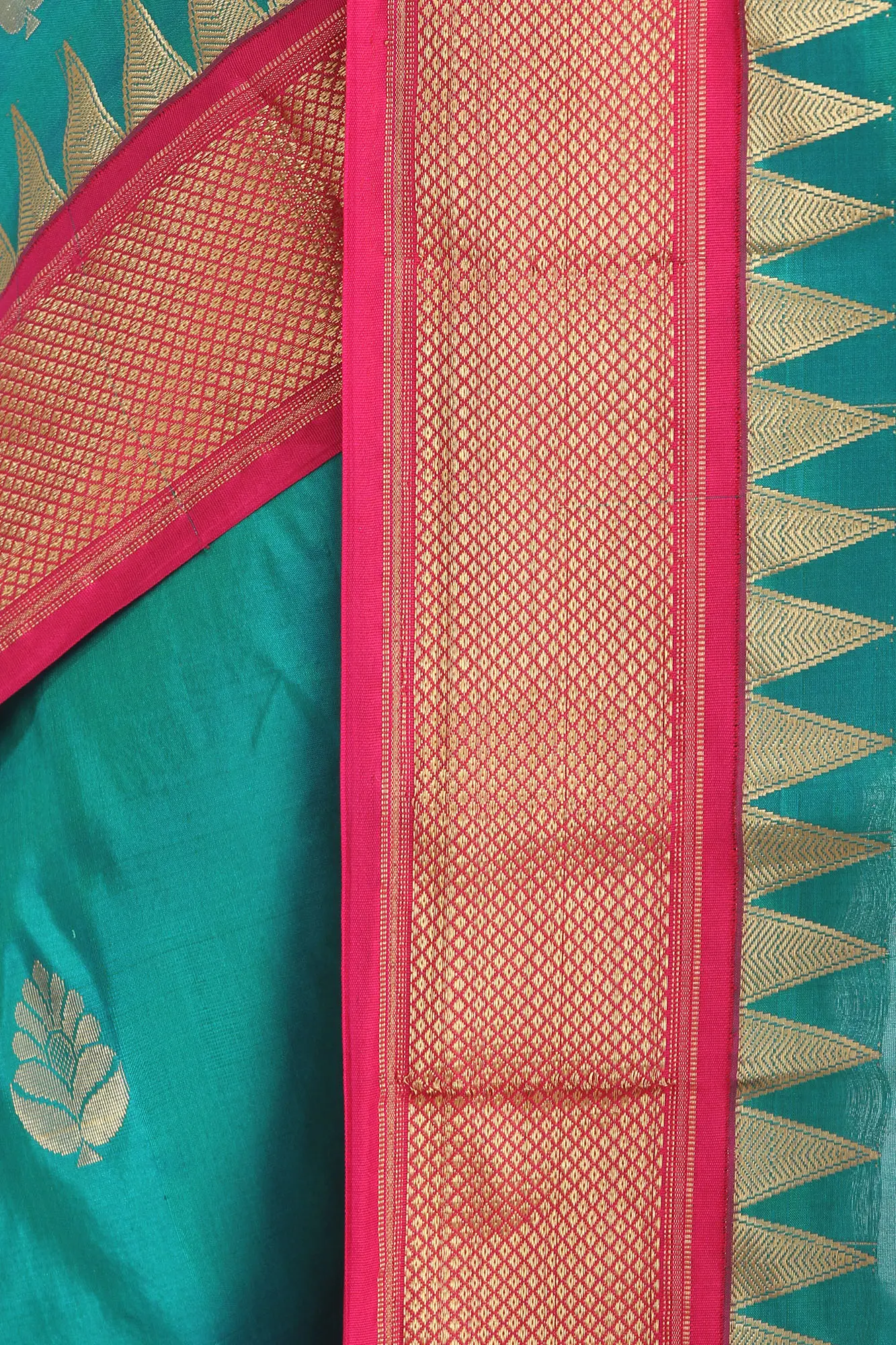 Green and Pink Wedding Sari from Bangalore with Zari-Woven Bootis and Temple Border