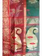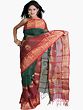 Green and Red Tant Bengali Sari with Woven Paisleys in Golden Thread