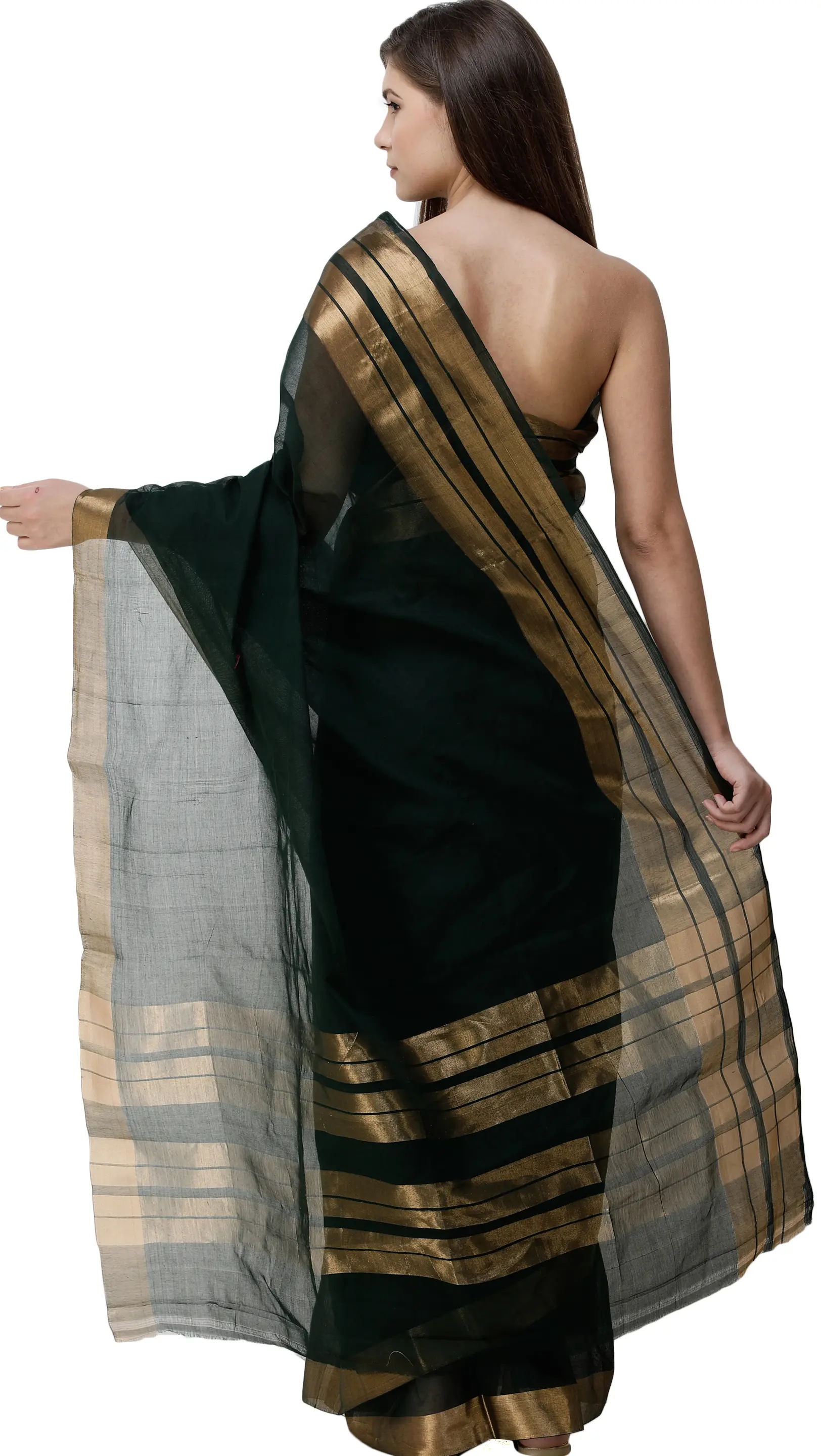 This sari effortlessly blends tradition with contemporary style, making it a versatile addition to any wardrobe. Its natural cotton fabric ensures comfort for extended wear, whether you're attending a festive celebration, a formal gathering, or a casual event. The rich green color is universally flattering and can be styled in numerous ways, while the gold accents lend an air of sophistication. Pair it with traditional gold jewelry for a classic look, or experiment with modern accessories to create a unique ensemble. The subtle sheen of the woven border and pallu elevates the sari, making it suitable for both daytime and evening events. ––––––––––––––––––––