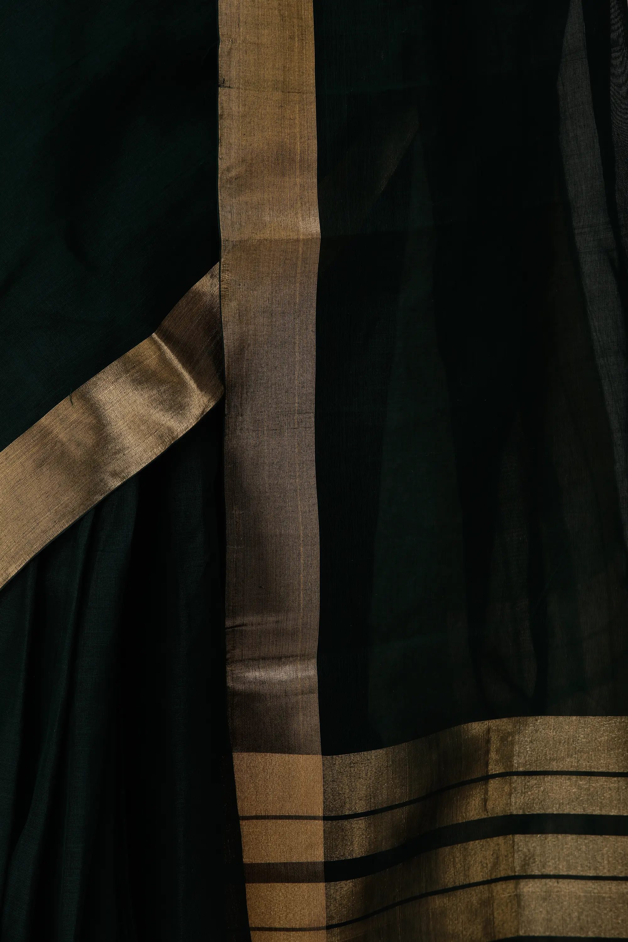 The sari is adorned with a striking woven border, a testament to traditional Indian textile artistry. The border features broad bands of shimmering gold, intricately woven to catch the light and add a touch of opulence. This elegant border runs along the length of the sari, framing the rich green fabric with a regal presence. The pallu, the decorative end piece of the sari, boasts a captivating striped pattern. These stripes, a blend of gold and contrasting tones, create a dynamic visual appeal, adding depth and texture to the overall design. The interplay of these woven elements transforms a simple cotton sari into a wearable work of art. ––––––––––––––––––––