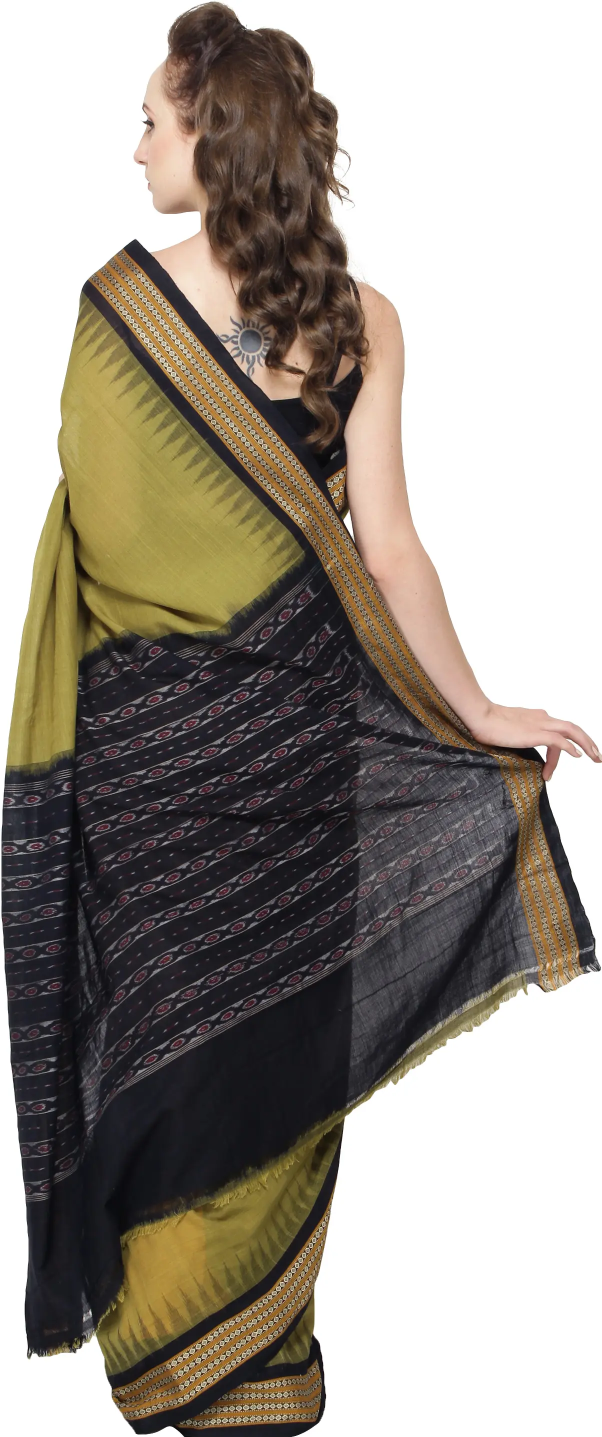 Amber-Yellow Block Printed Cotton Saree with Zari Border and Multi Stripe Pallu from Tamil Nadu