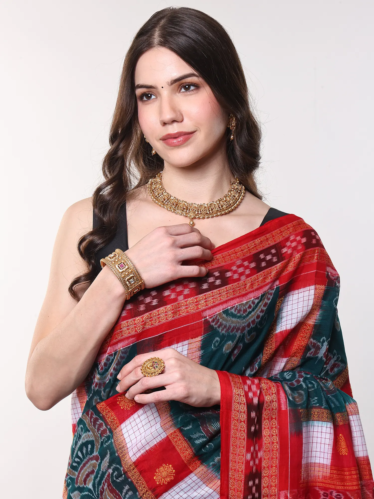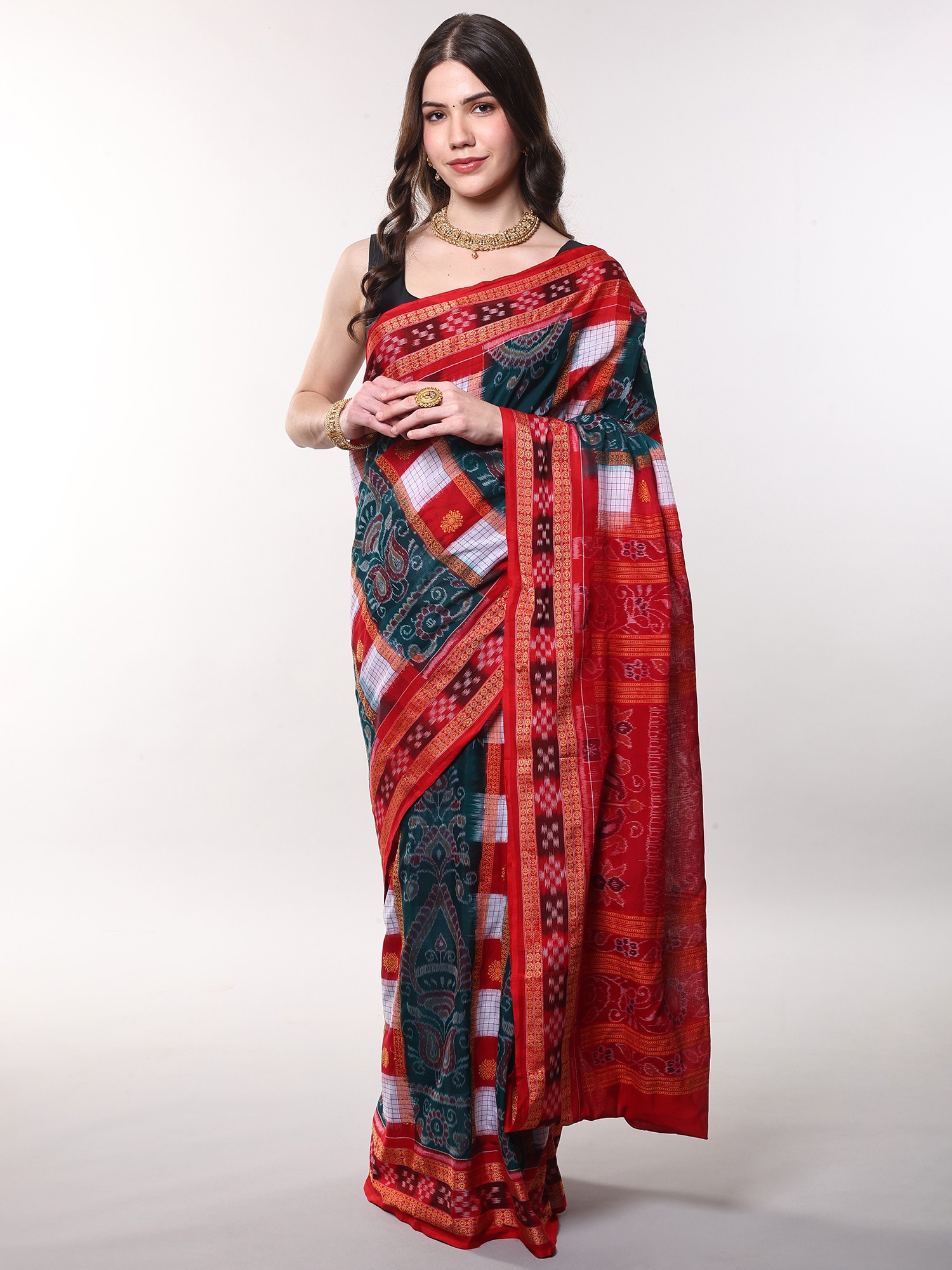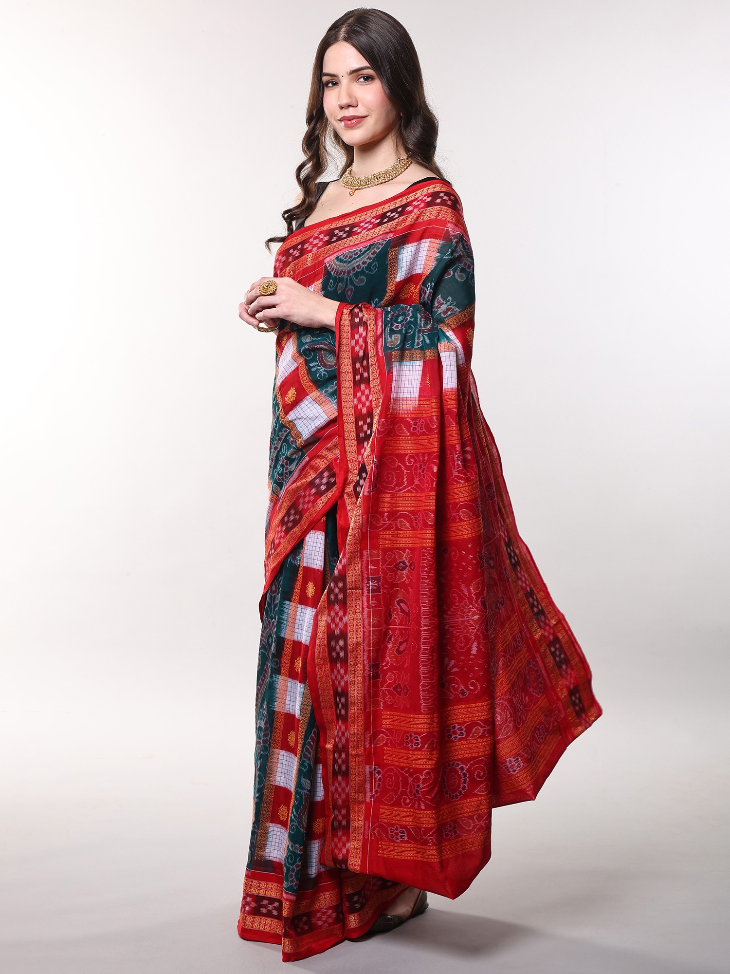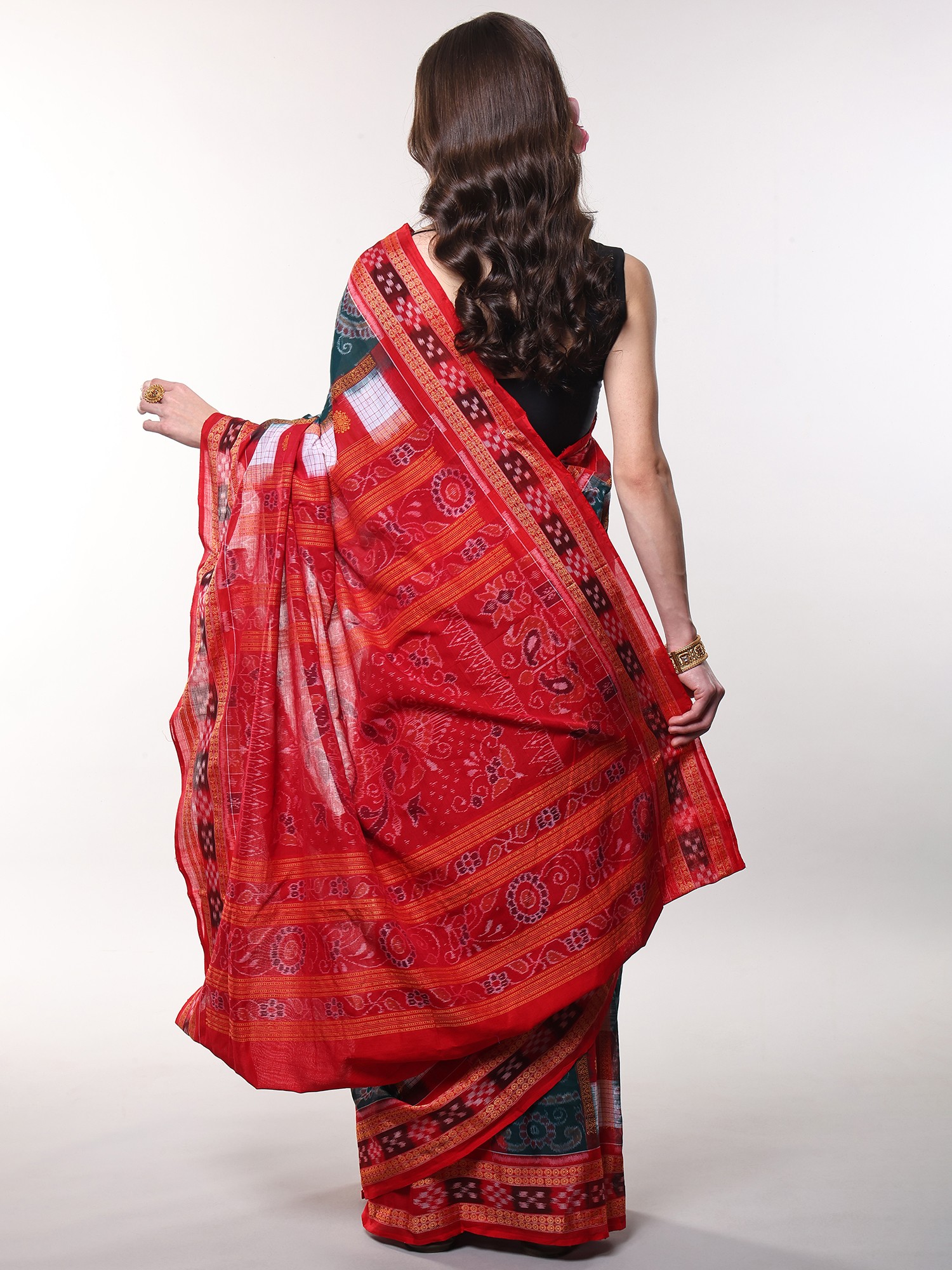 Features intricate Sambalpuri Ikat weaving with distinct patterns achieved through pre-dyed yarns.
