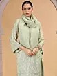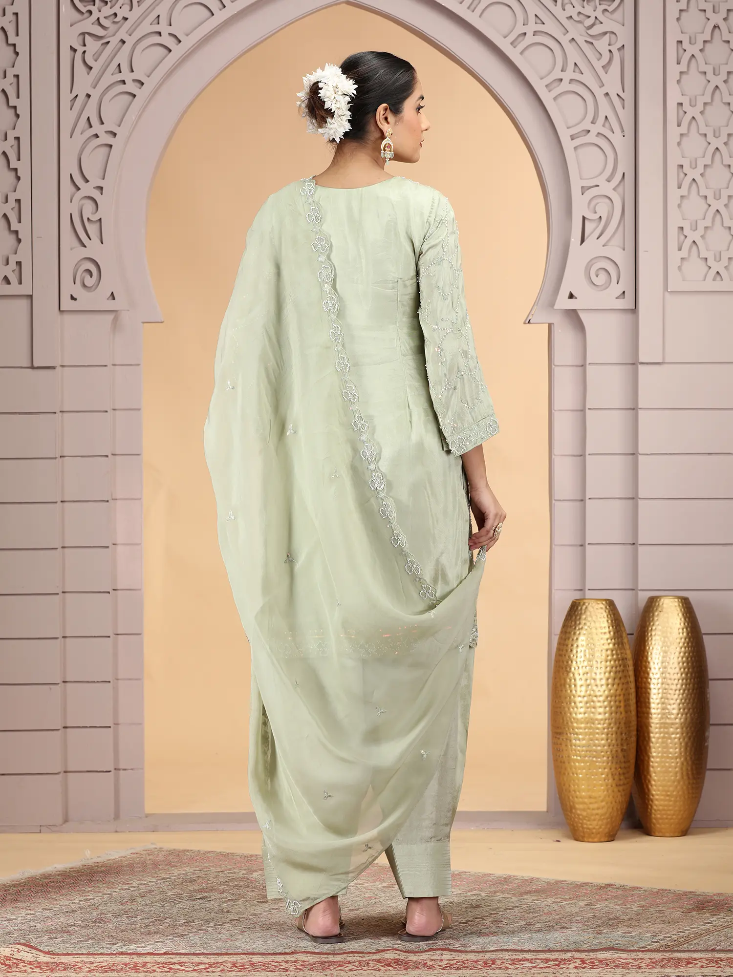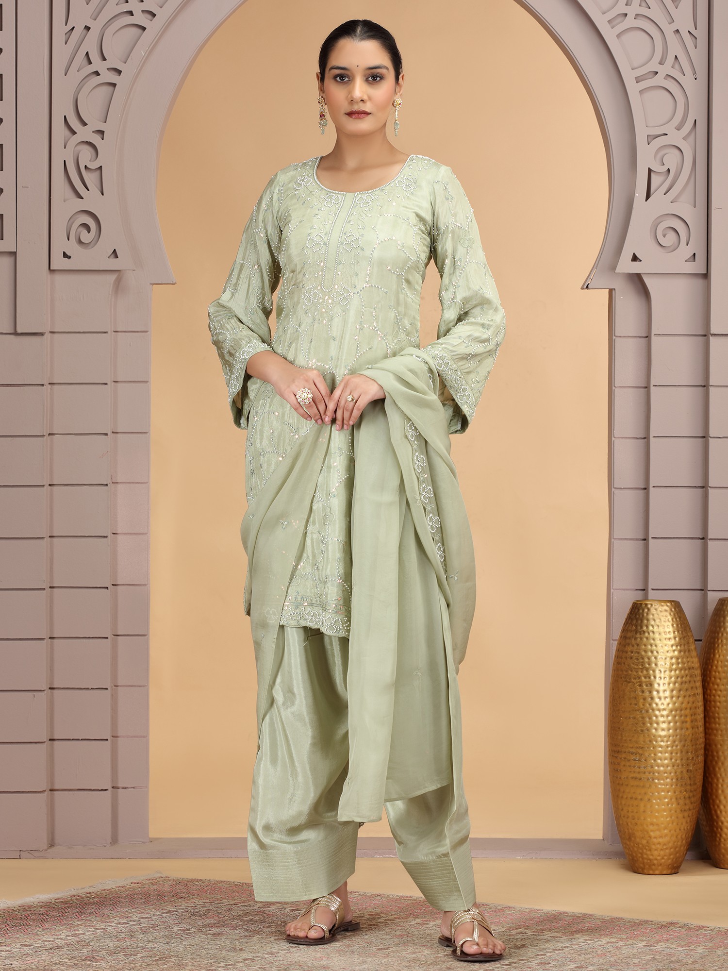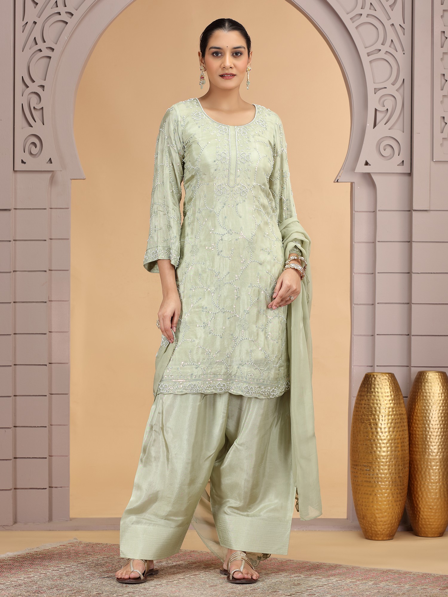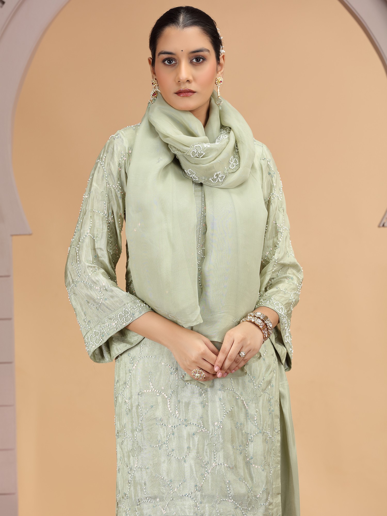 The serene green hue provides a sophisticated canvas for the elaborate embellishments. You'll appreciate the subtle sparkle that catches the light, drawing admiring glances. The flowing palazzo pants offer both comfort and a flattering silhouette, while the accompanying dupatta, mirroring the delicate embroidery, adds a touch of traditional charm and completes the cohesive look.