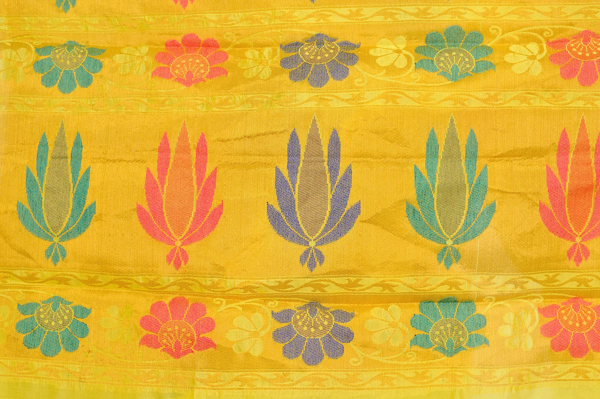 Immerse yourself in the timeless elegance of this exquisite Banarasi handloom sari, a testament to the rich heritage of Indian textile artistry. Crafted from the finest pure silk, this garment drapes with a luxurious fluidity, promising both comfort and an undeniable aura of sophistication. The vibrant, cheerful yellow hue serves as a perfect canvas for the intricate weaving that defines this masterpiece.