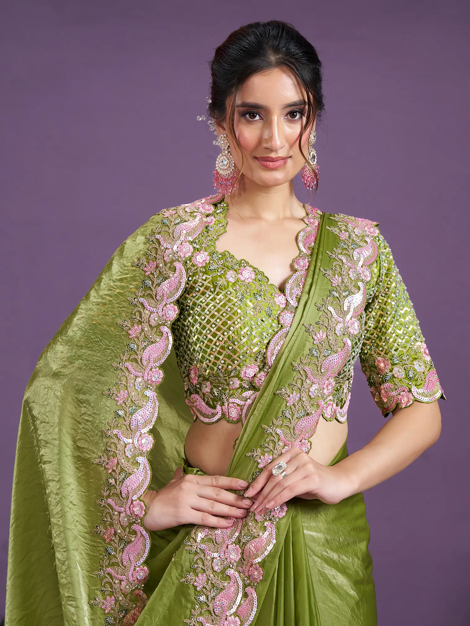 Green-Smoke Two Tone Satin Silk Sequins With Moti Work Embellished Border Party Wear Saree