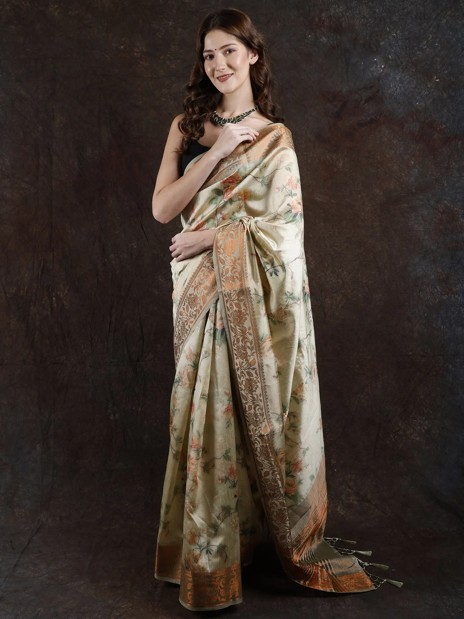 Make parties and gatherings an affair to remember with this lovely Green-tint art silk saree. The soft hue and softer fabric create a beautiful drape, accentuated by the floral vine pattern that runs all over.