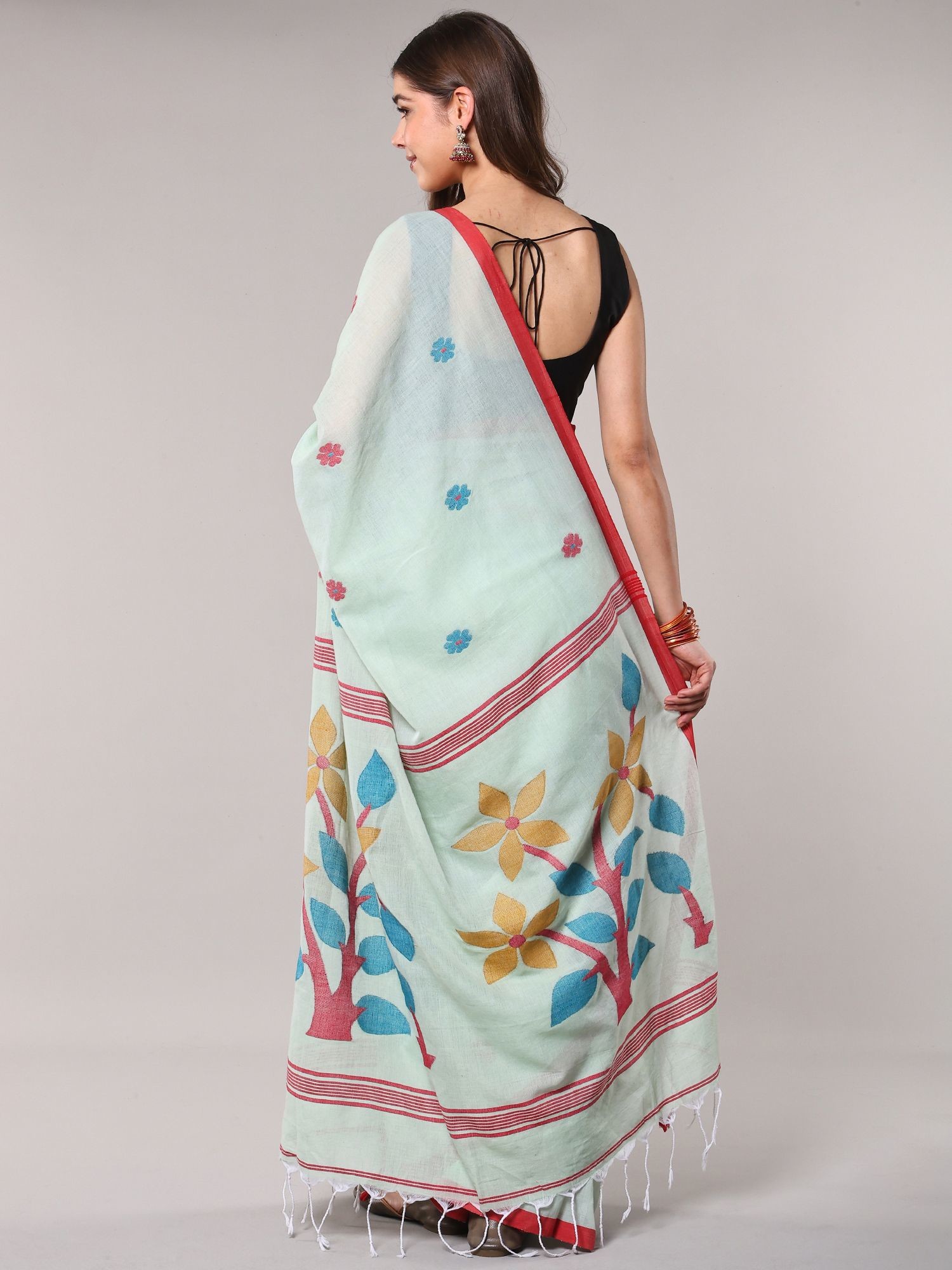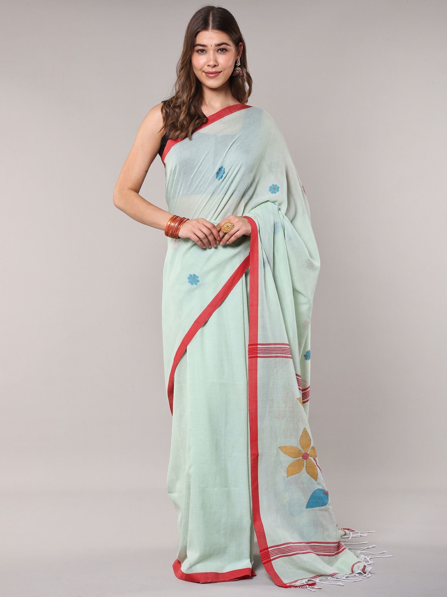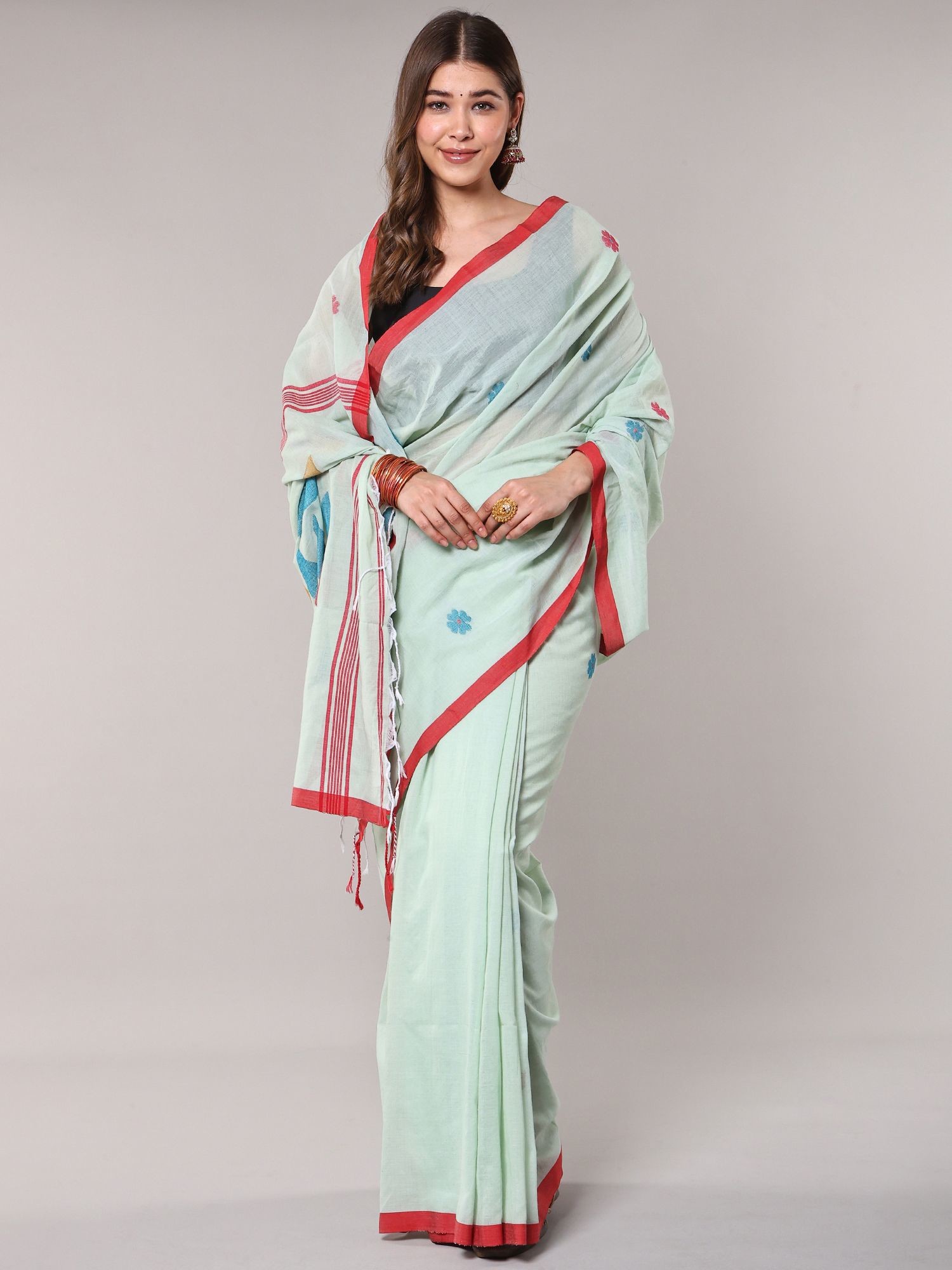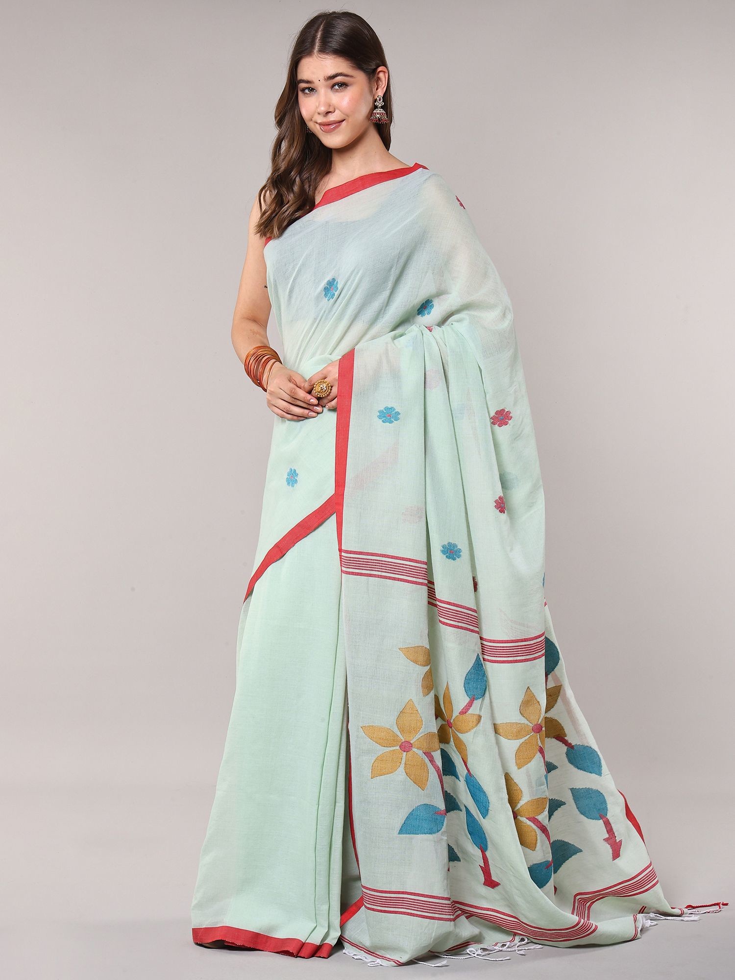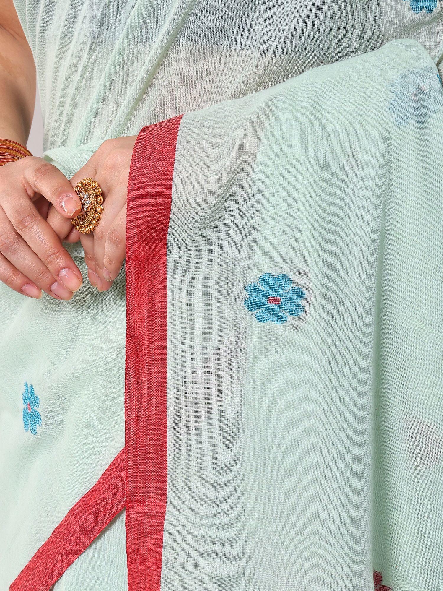 Sea-Green Cotton Jamdani Saree from Bengal with Woven Bootis