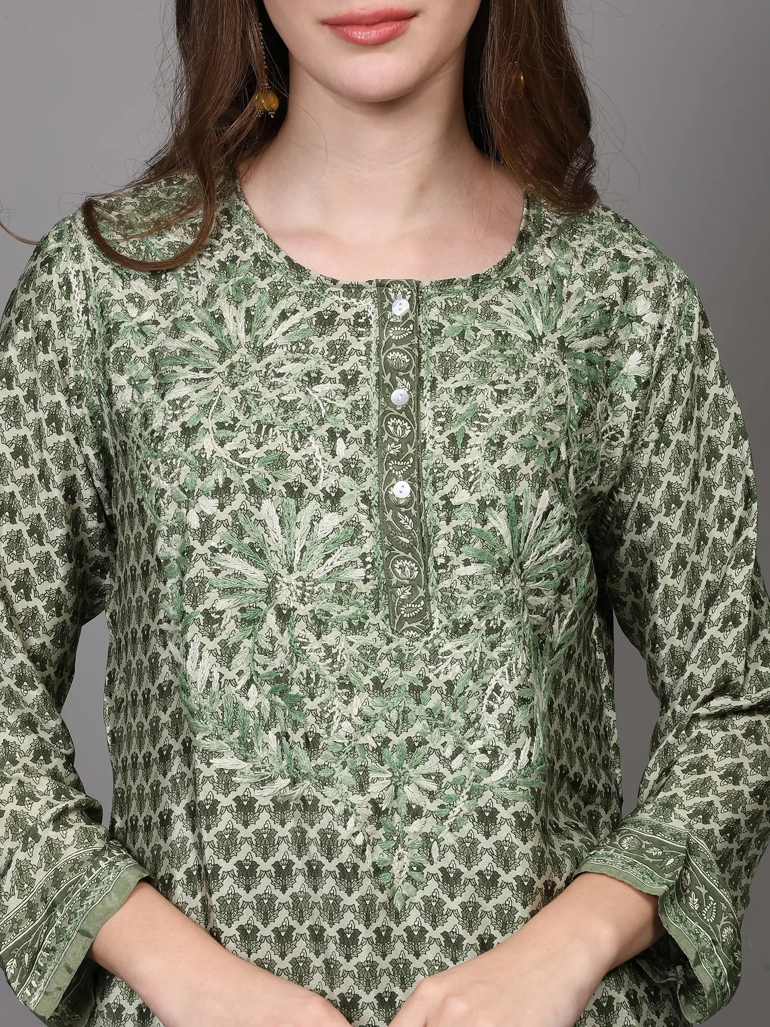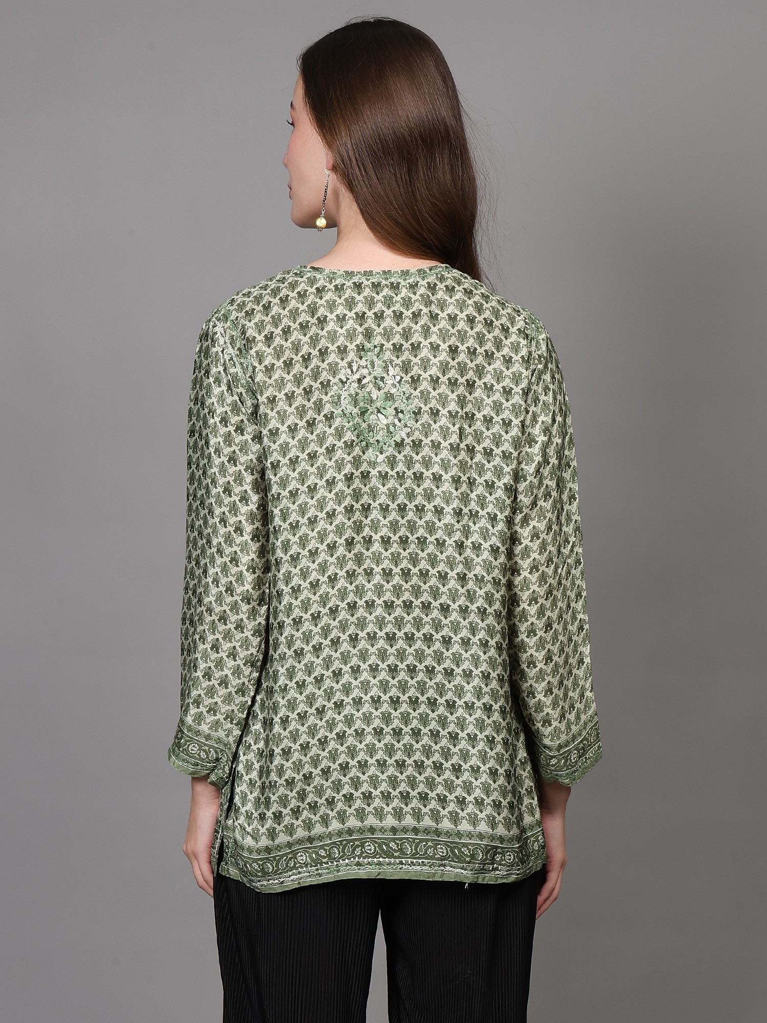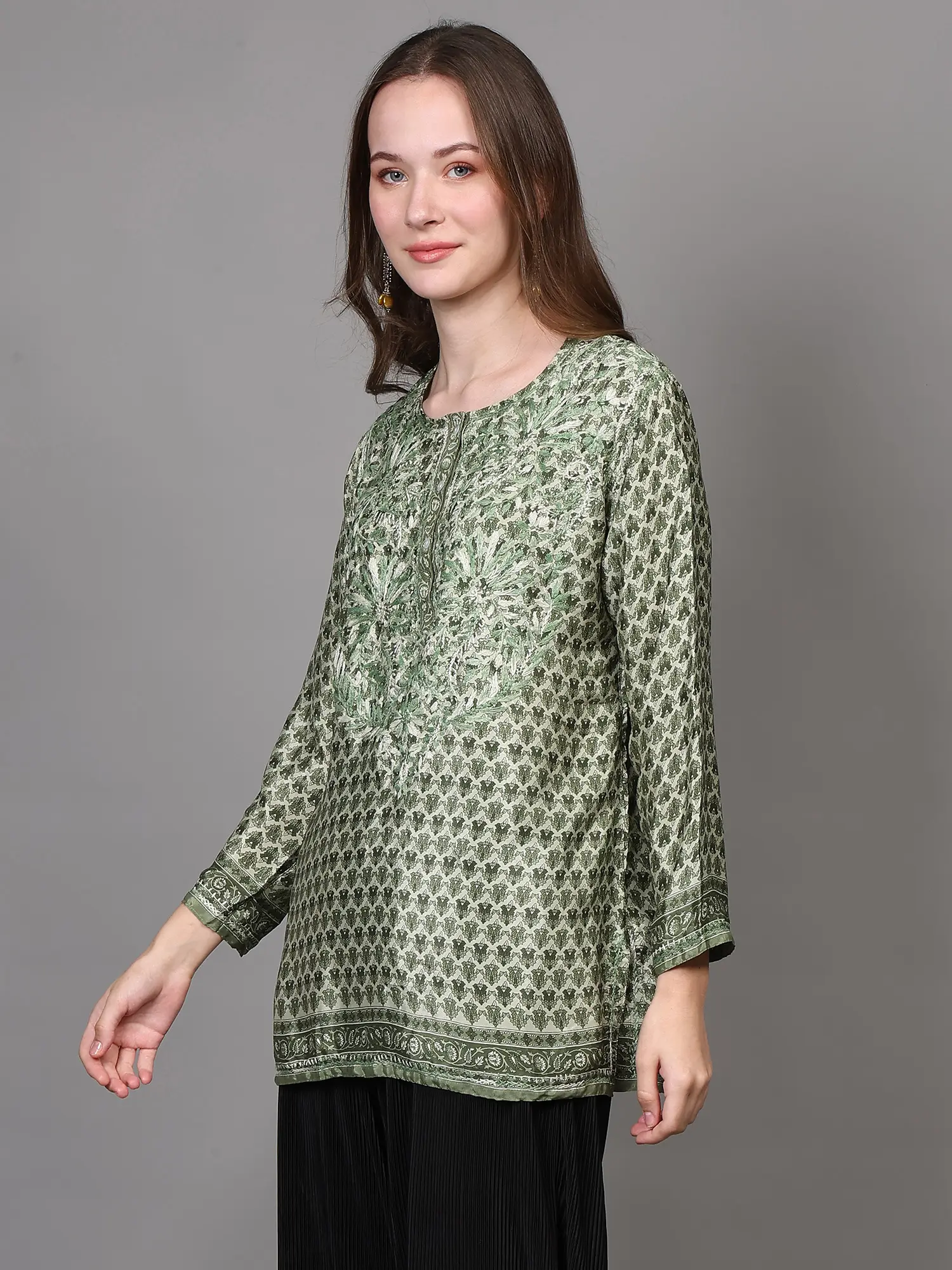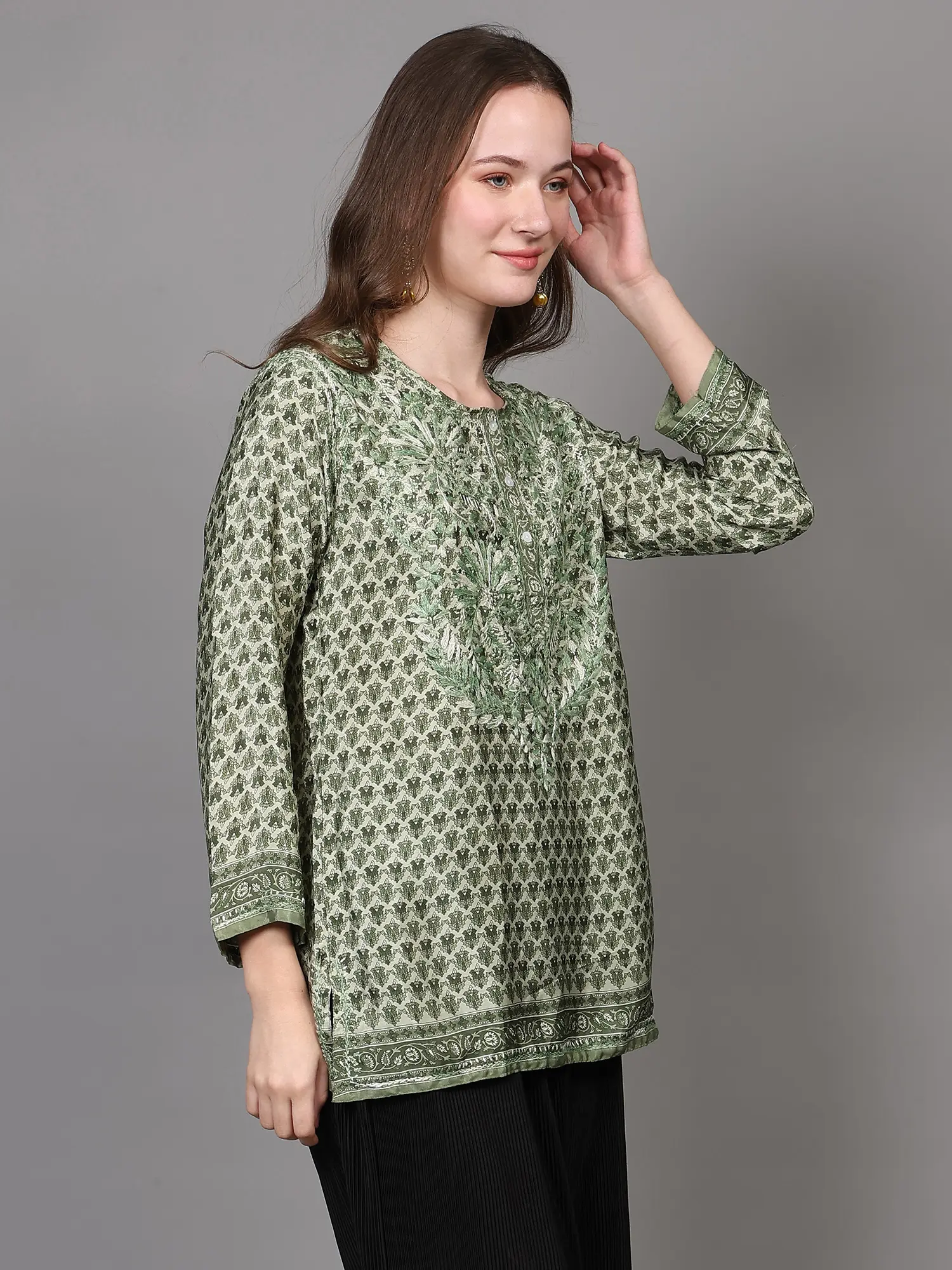 Banana-Crepe Pure Wool Short Kurti with Aari Embroidered Flowers from Kahsmir